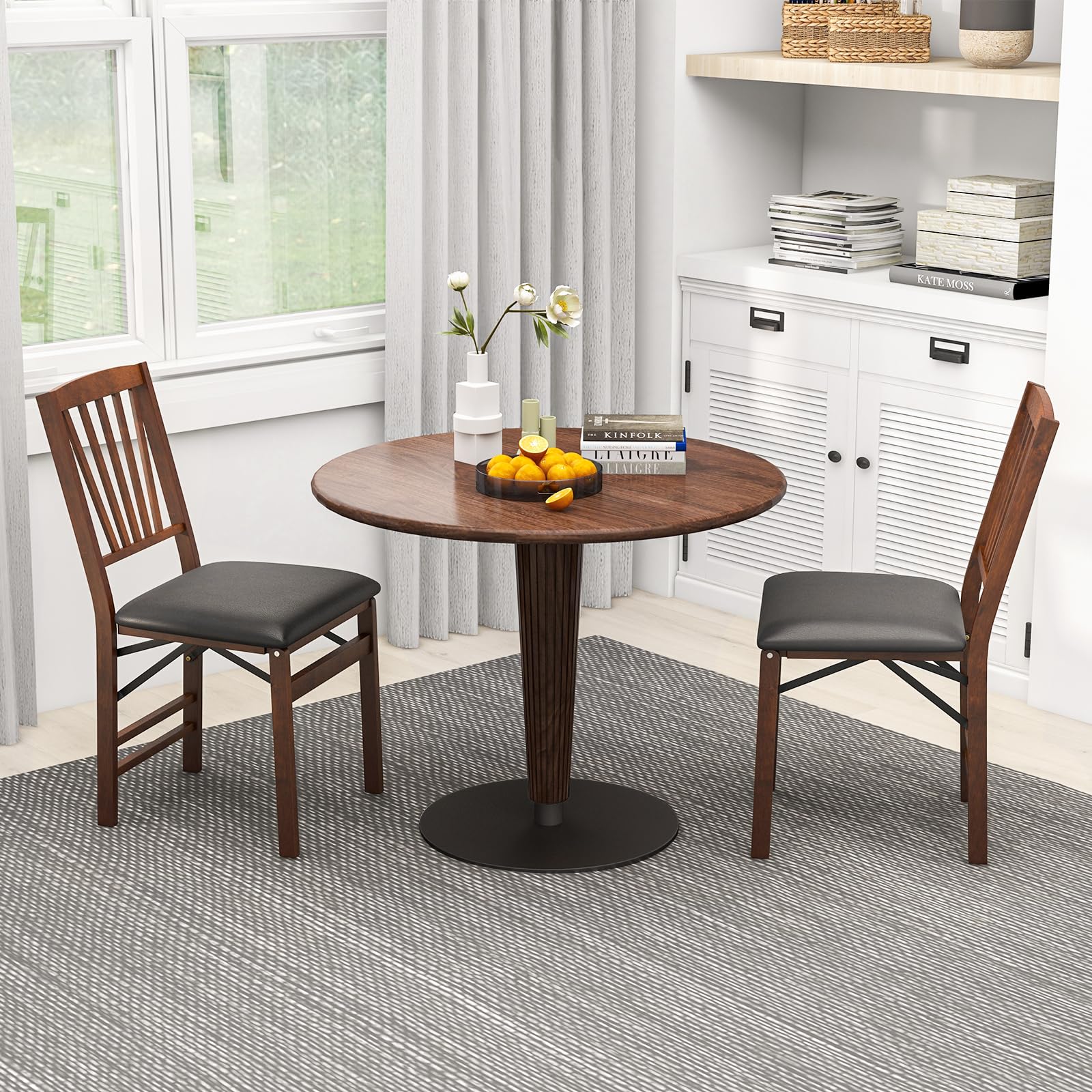 Crafted from solid rubber wood, the folding chair is deformation-resistant and built to last. Moreover, 4 thick legs are reinforced by a crossbar to hold up to 400 large weights. Besides, the folding chairs come with foam-filled cushions, and the soft & skin-friendly material is friendly for your hips. And the high backrest relieves your fatigue. Hence, it is a good choice for a pleasant dining experience. Equipped with a flexible hinge, you can easily fold and store the chairs after dining. And there are more outstanding details to show our quality. The black premium PVC leather and brown finished wood are easy to clean while ensuring a vintage style. Therefore, the assembly-free folding chair set is a good choice for your kitchen!
