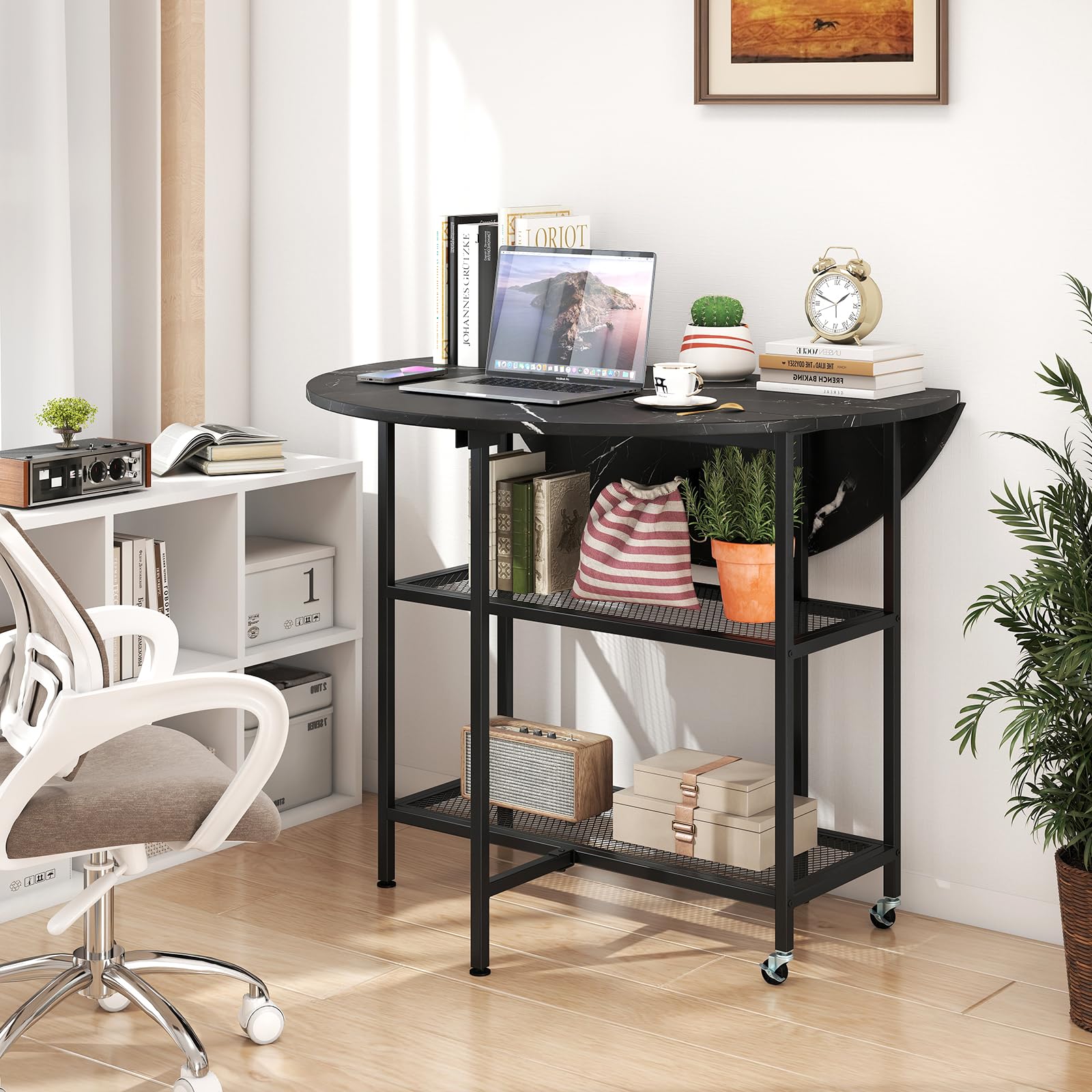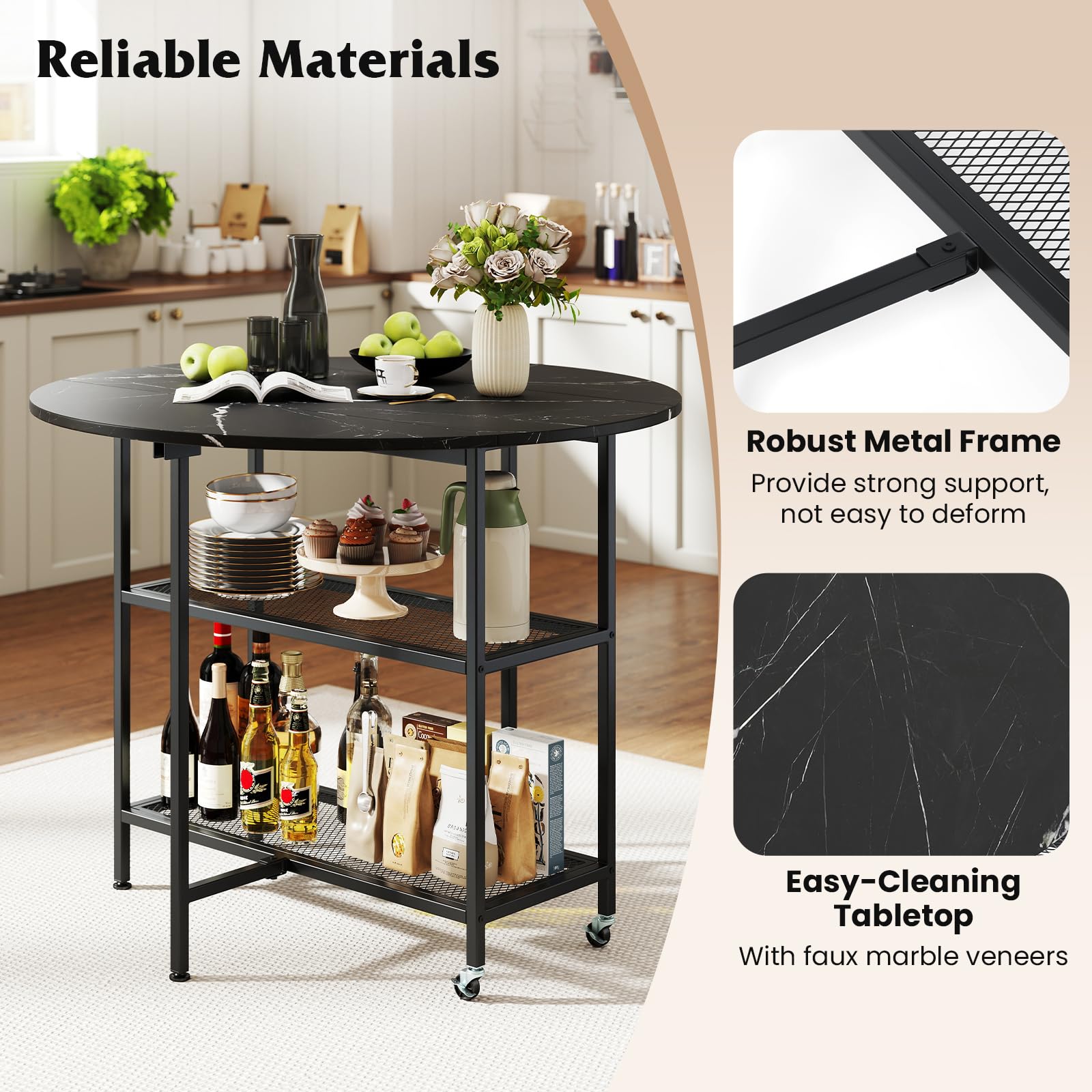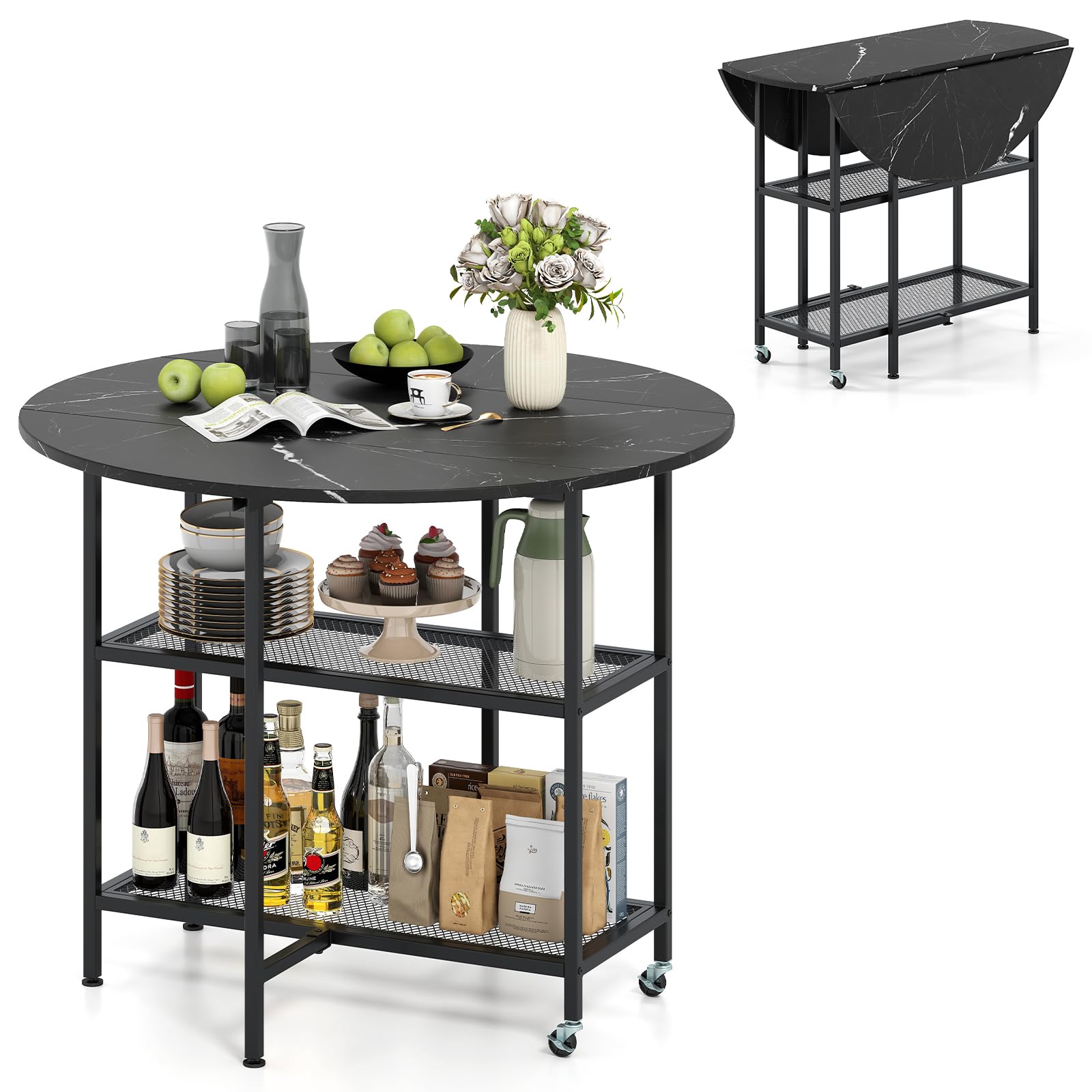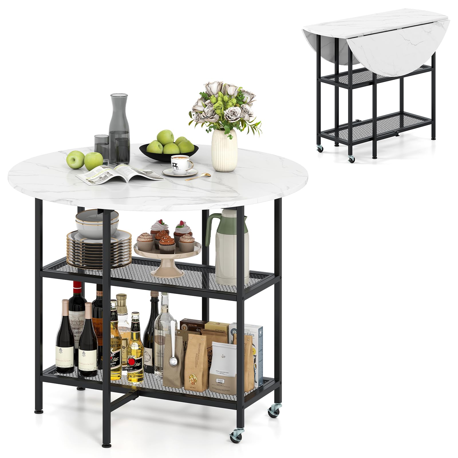 Our folding dining table measures 40" x 32" (Dia. x H) and features 2 drop leaf panels, allowing you to effortlessly transform it into a compact size ideal for small rooms or apartments. And it is designed with 2 open shelves to keep your essentials organized and within easy reach. Beyond dining, this table can also transform into a work station or sofa side table, catering to different lifestyles. Moreover, it is constructed from sturdy metal tubes, providing strong support, not easy to deform. And there are 4 adjustable footpads for enhanced stability. Equipped with 2 lockable wheels, the table is also easy to move around. With its sleek metal and exquisite faux marble veneers, the dining table is also an elegant and stylish addition to your home decoration.