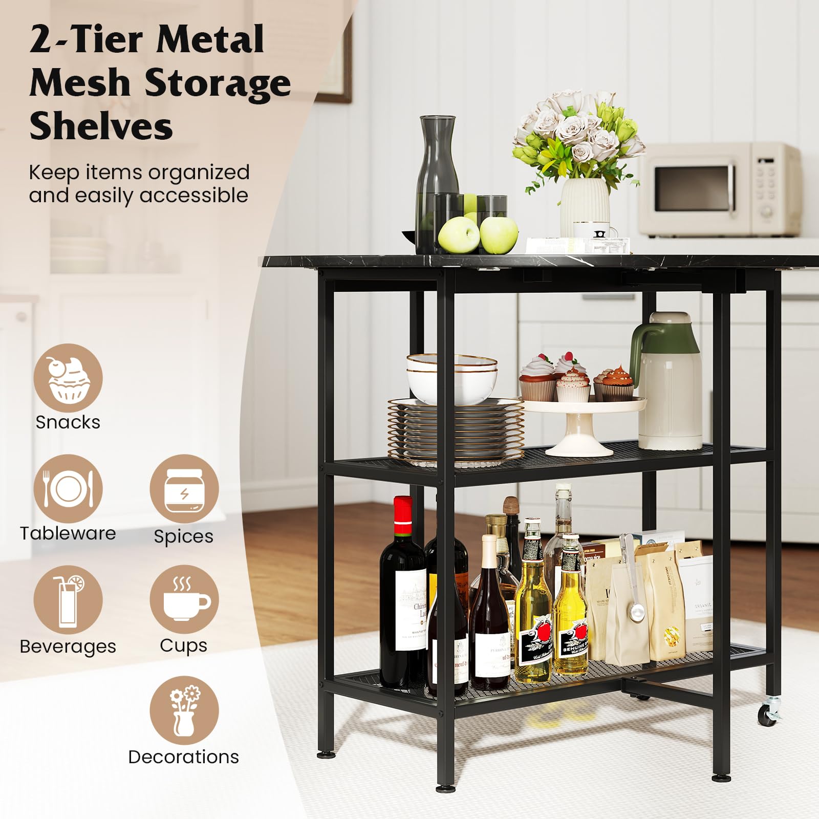 2 shelves keep snacks, tableware, beverages, spices, cups, and decorations in order