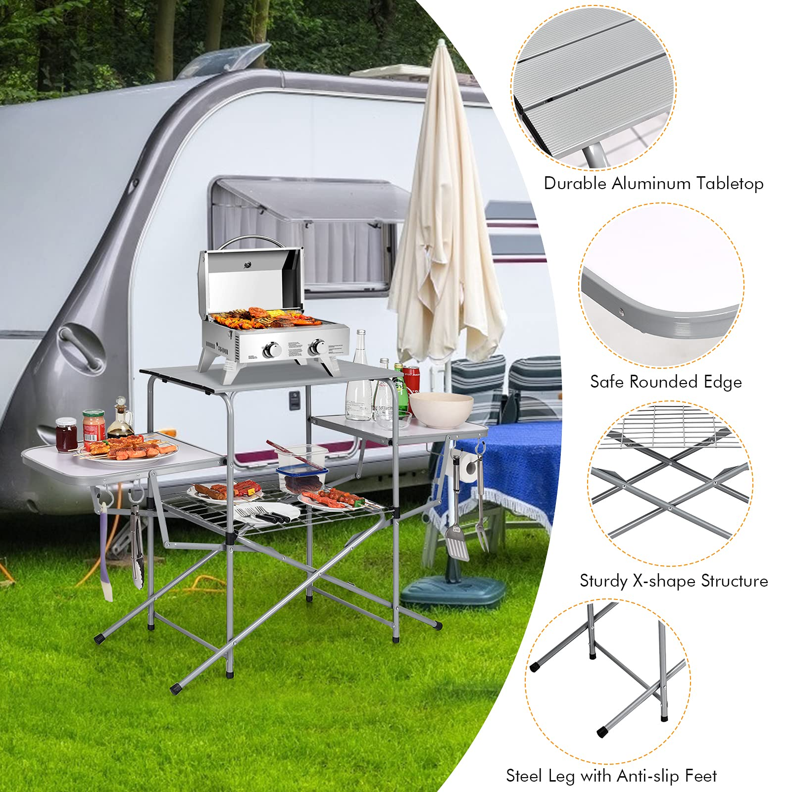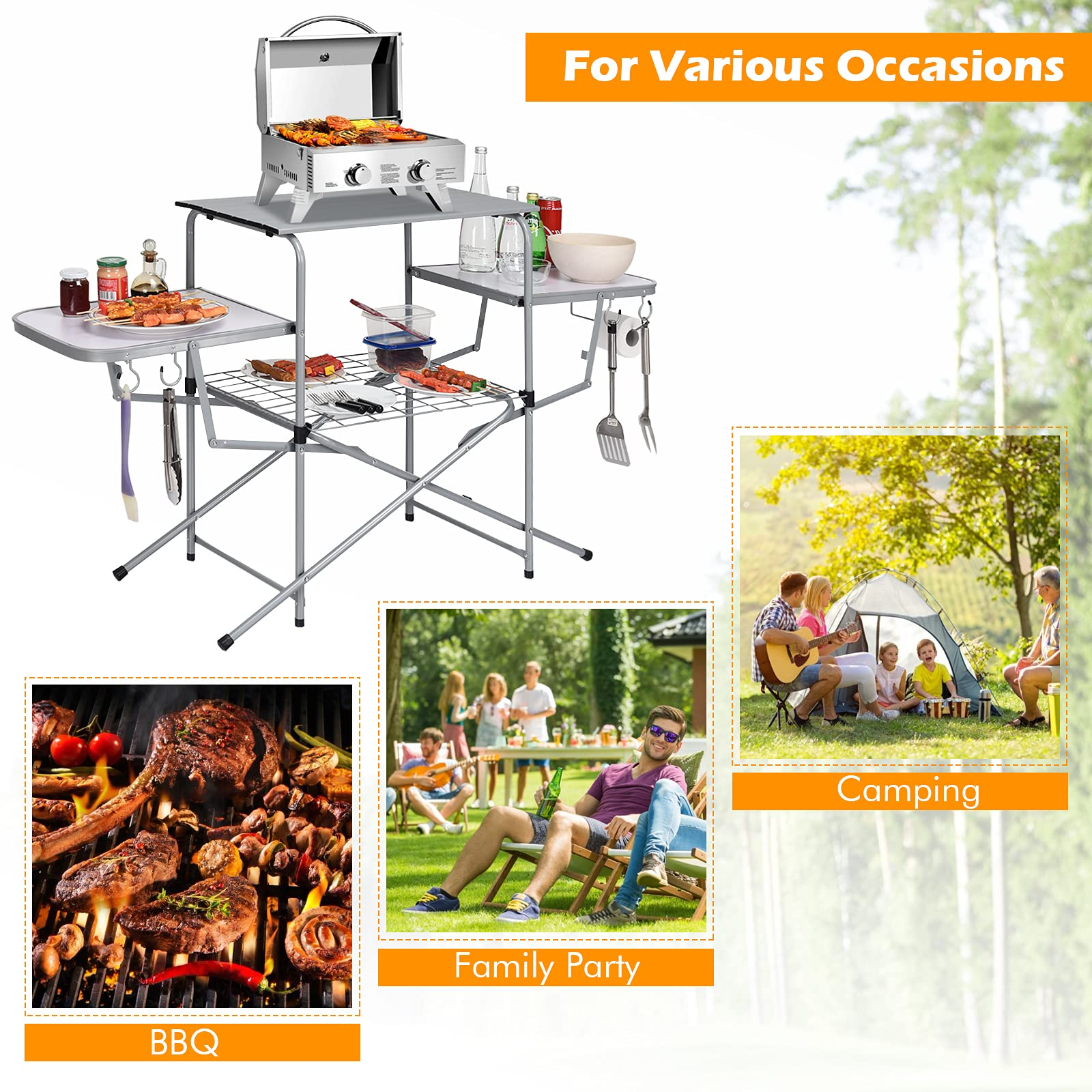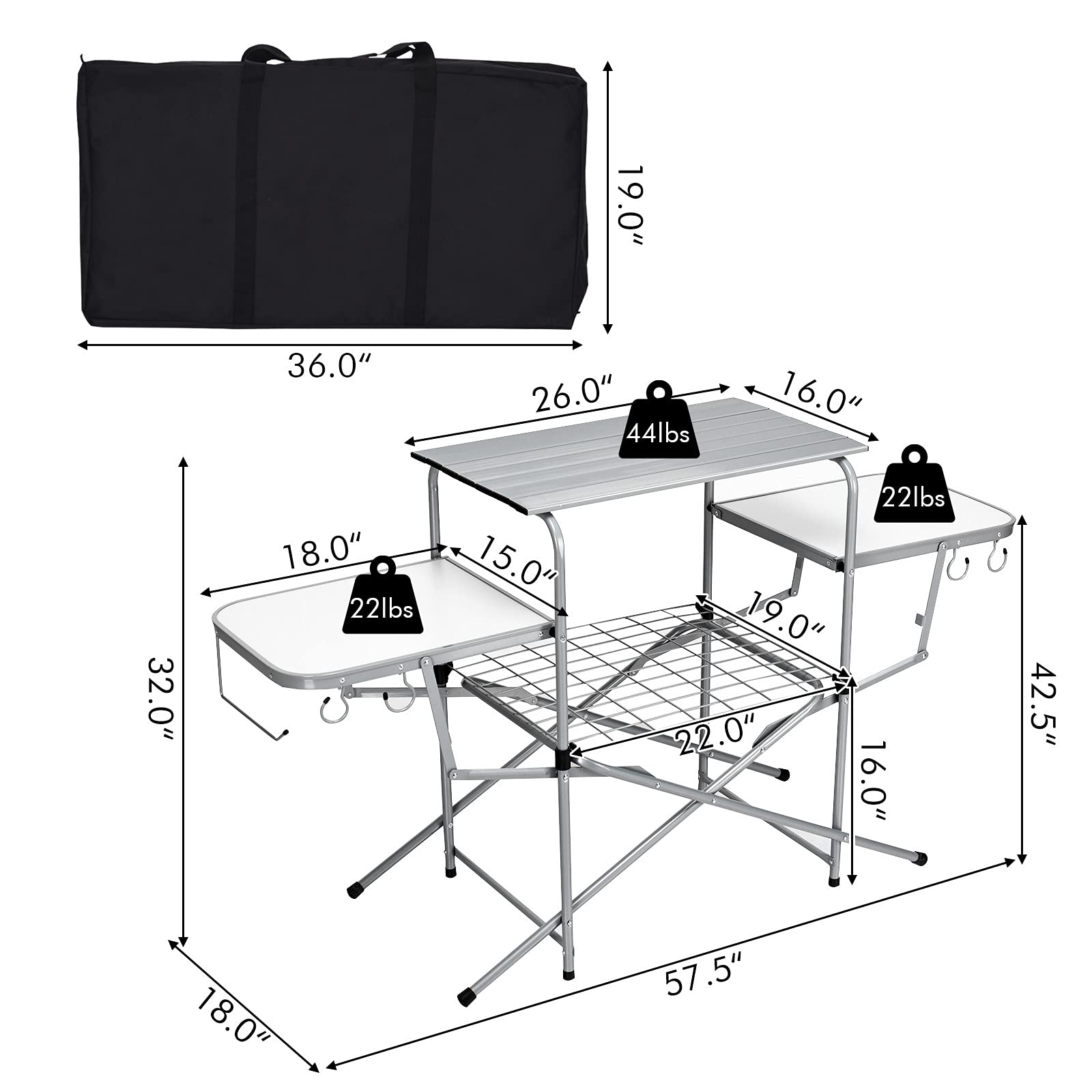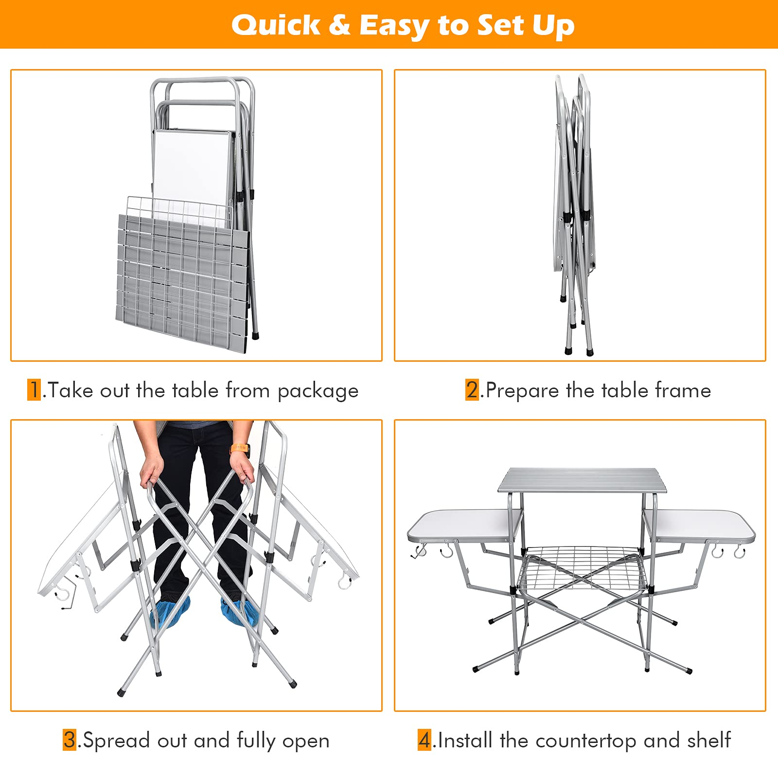 Experience all the comforts of home on your next outdoor adventure with this foldable camping grilling table. Equipped with sturdy steel,heat-resistant aluminum and moisture-resistant MDF, it features heavy-duty,durability, stability so that can service you for long time. This outdoor kitchen stand also features a large top surface area, two side tables and a lower shelf ideal for storing supplies and condiments. It includes attached hooks for hanging grilling tools and a paper towel rack. The lightweight and one-piece design make you hold easily and provide you a lot storage room. Easy set-up and folding down less than a minute allow you enjoy the camping trip as soon as possible.