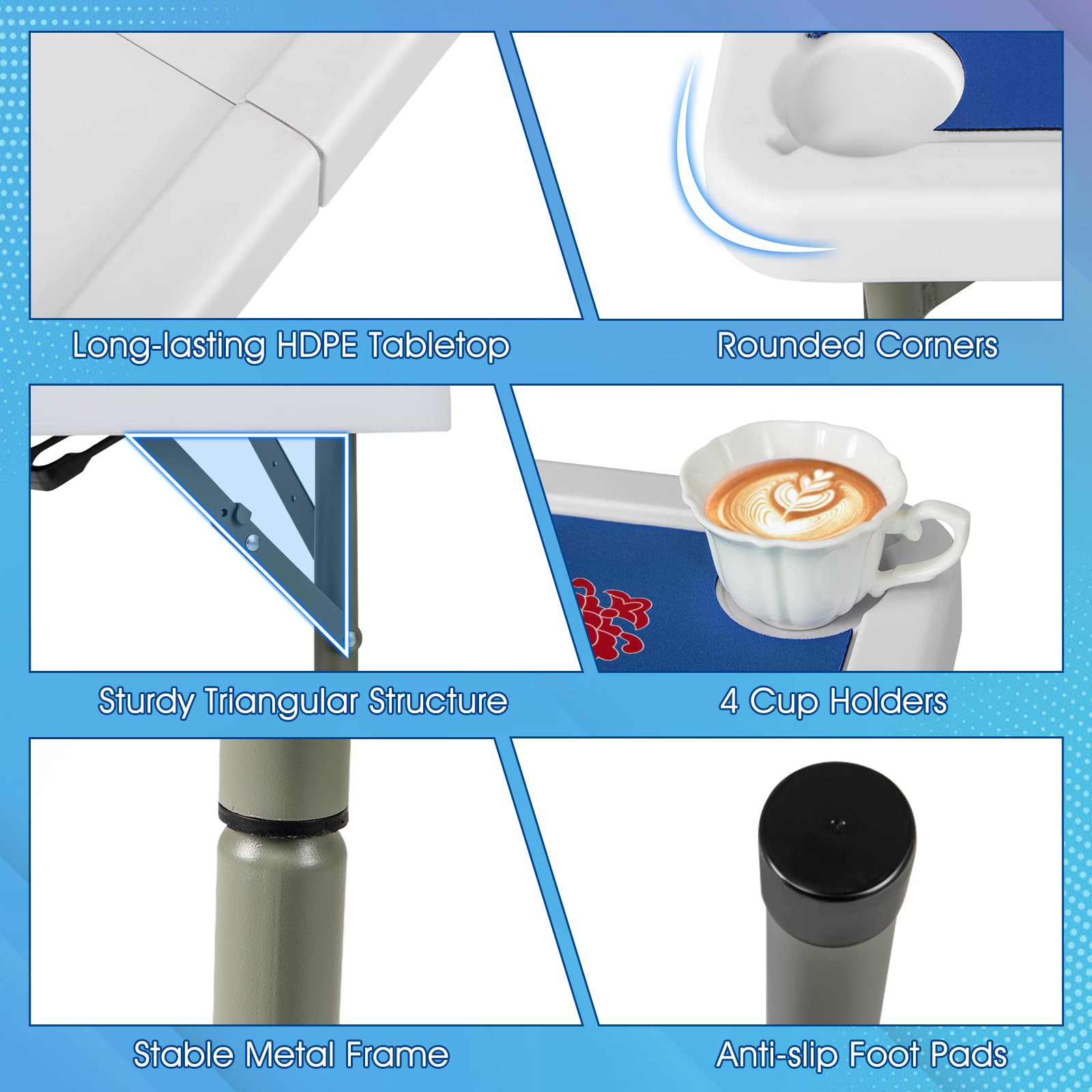 Boasting a sturdy metal frame with anti-slip foot pads and reinforced triangular structures, this card table ensures stability during gaming sessions. It also features a square design with 4 convenient cup holders and rounded corners to comfortably accommodate up to 4 players. Moreover, the built-in noise reduction mat with an anti-slip rubber base ensures more focused gameplay experience. Designed for easy transport and storage, this square game table folds quickly and includes a handy carrying handle.