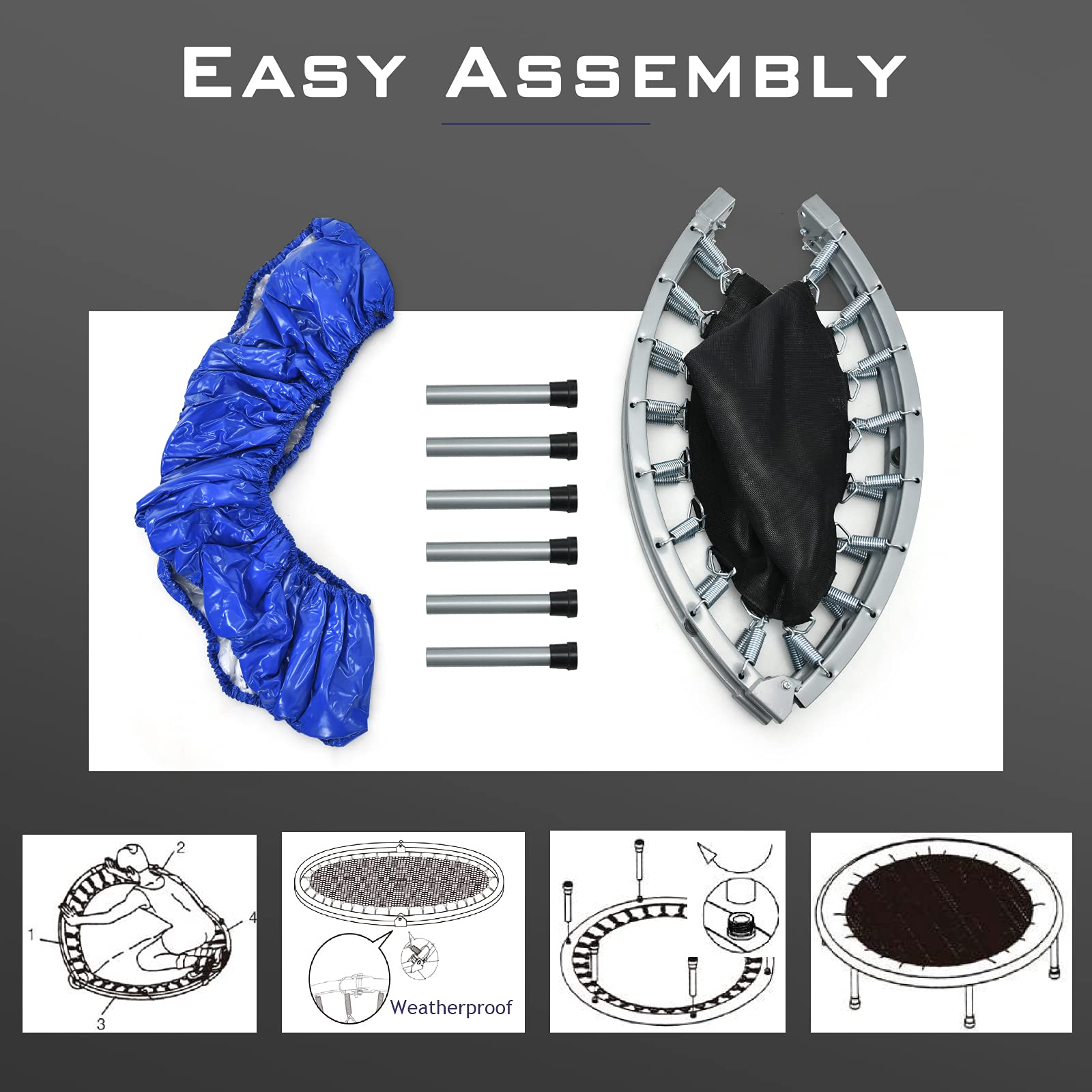 Our mini trampoline has 32 strong springs which effectively balance the whole pressure of the jumping mat evenly for longer time use. The all-round protective cover can prevent you from being scratched during bouncing. Moreover, equipped with six thick steel legs, the mini exercise trampoline can support a weight capacity up to 330lbs, thus offer you a stable and safe jumping place. You can also carry it with you or store it in narrow spaces easily due to its foldable design which can help save space when not in use.