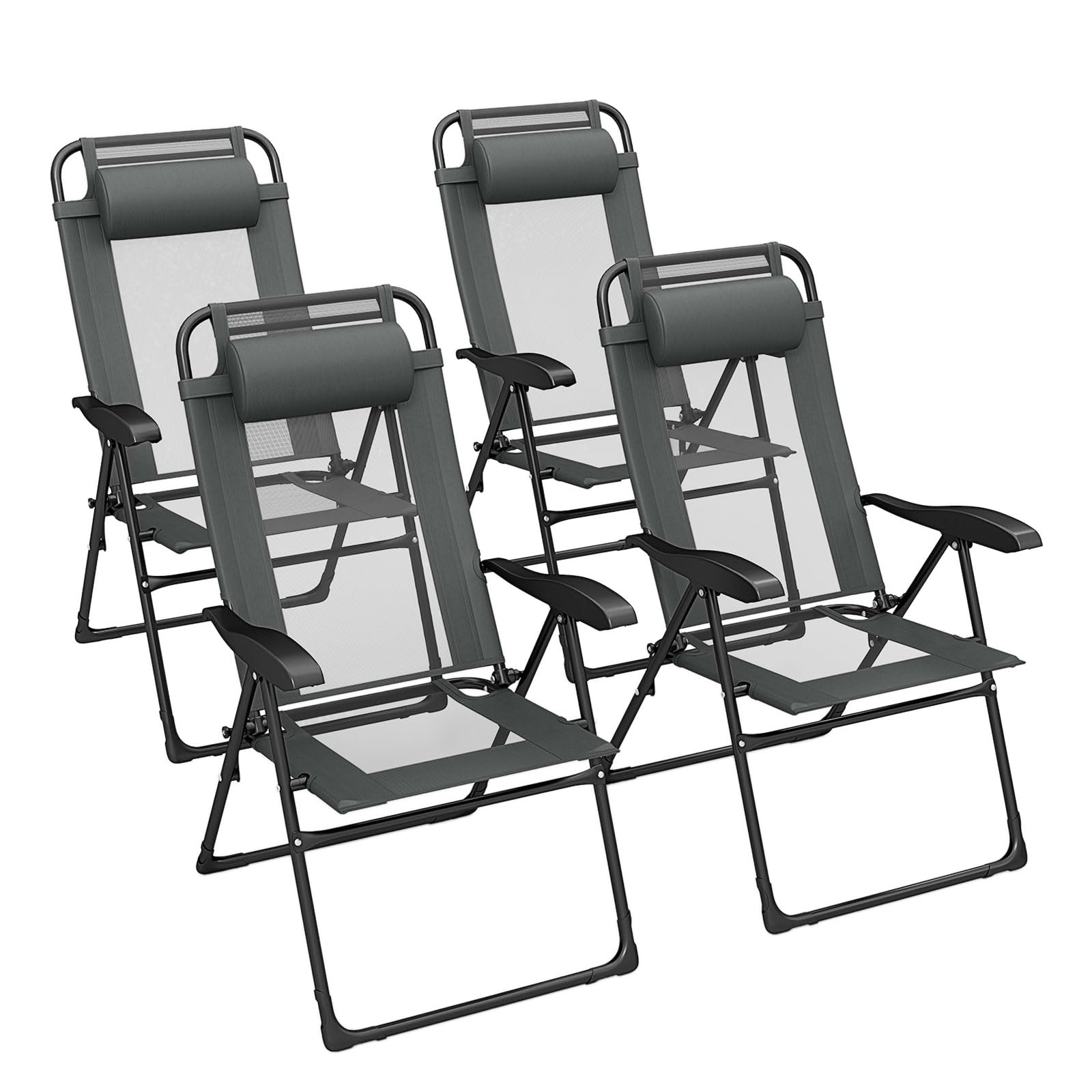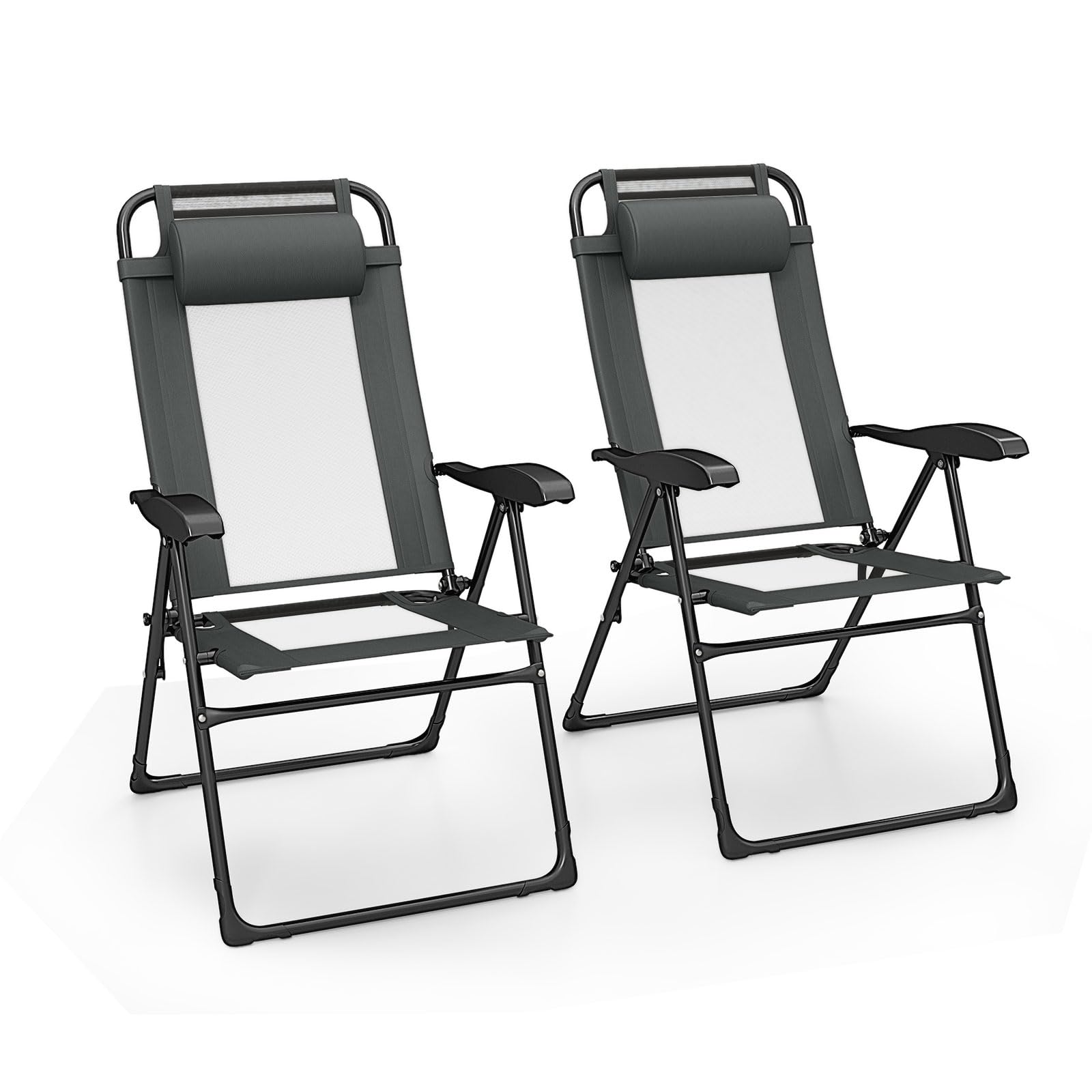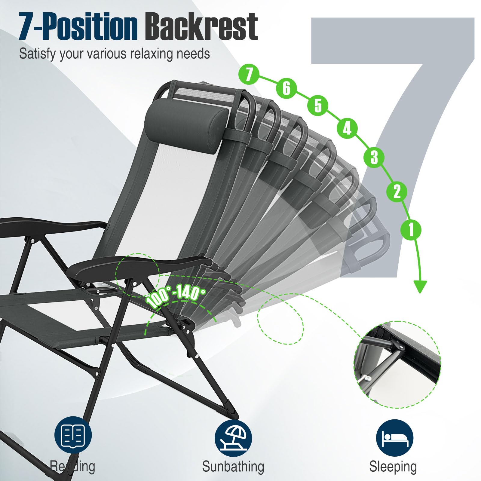 Each chair is crafted with skin-friendly Oxford cloth and breathable mesh. The comfortable seat is also designed with a 7-position adjustable backrest to meet all your needs, from reading to napping. The robust metal construction ensures durability and stability. Moreover, the compact, lightweight design allows for effortless storage and portability. Perfect for any outdoor setting, these chairs bring coziness and ease to your garden, poolside, or campsite. Elevate your outdoor moments with this practical and elegant seating solution.