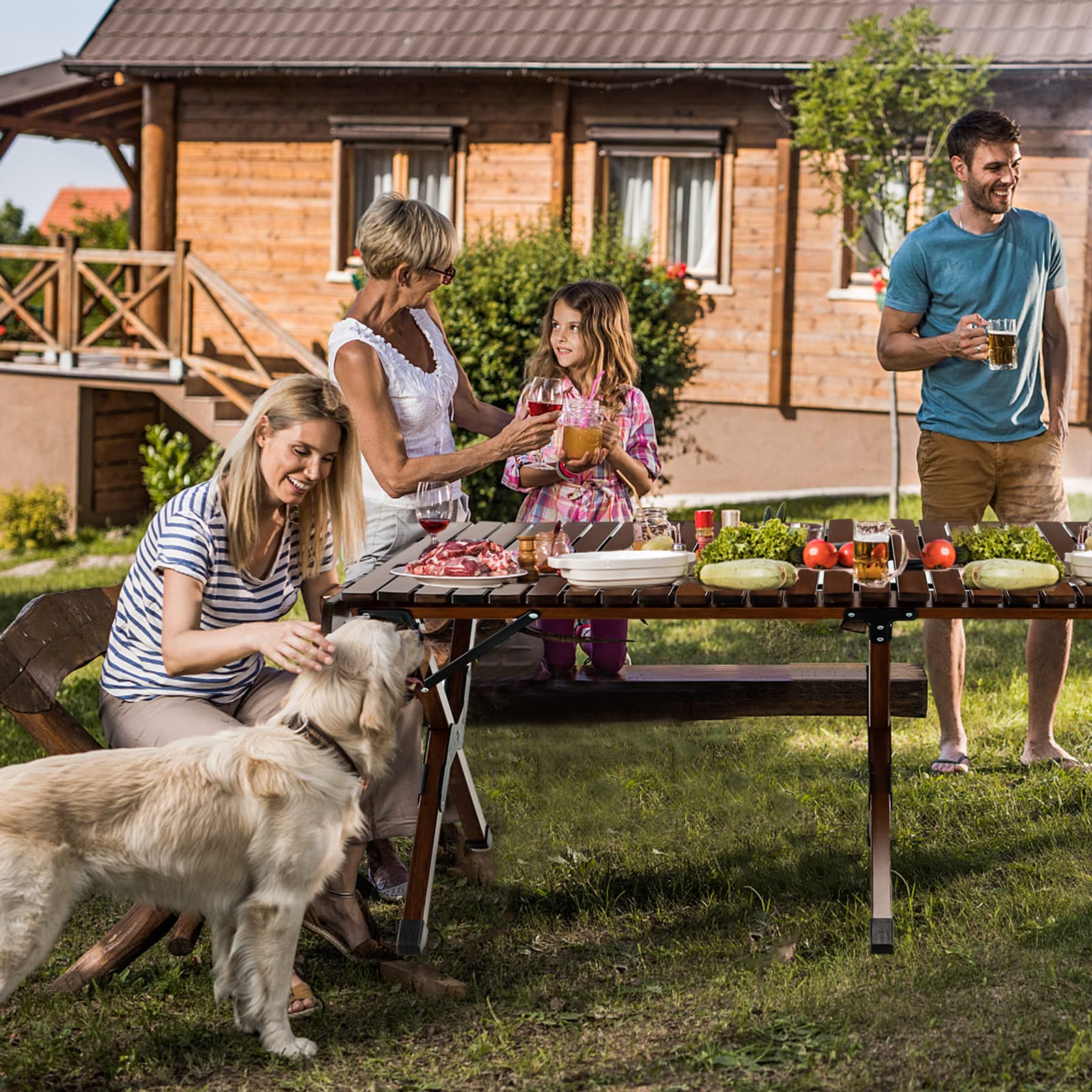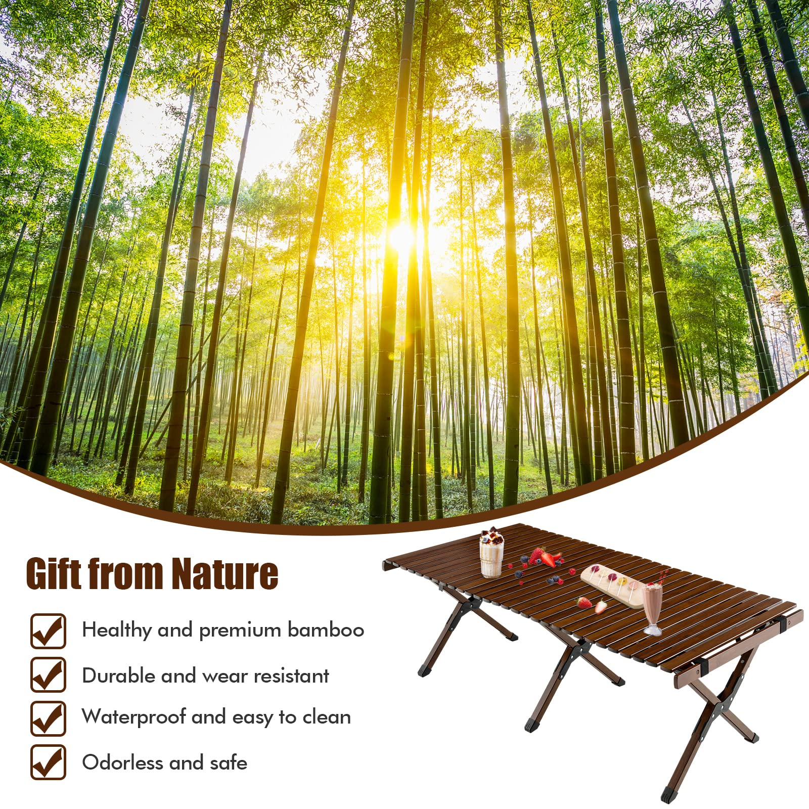 Our folding camping table measures 48" x 23.5" and can carry up to 110 lbs, making it perfect for outdoor picnics, parties, or barbecues with family or friends. The picnic table is made of high-quality bamboo, which is waterproof, and scratch-resistant, ensuring long-term use. And the natural style makes it a perfect addition to both indoor and outdoor settings. In addition, the tabletop features a fillet design without burrs to prevent accidental injuries. Besides, the folding table has 6 sturdy X-shaped support legs and protective foot caps to ensure more reliable stability. What's more, our camping table is easy to install and fold, so you can quickly store it in a portable bag and carry it to the lake, park, or beach to enjoy a cozy time.