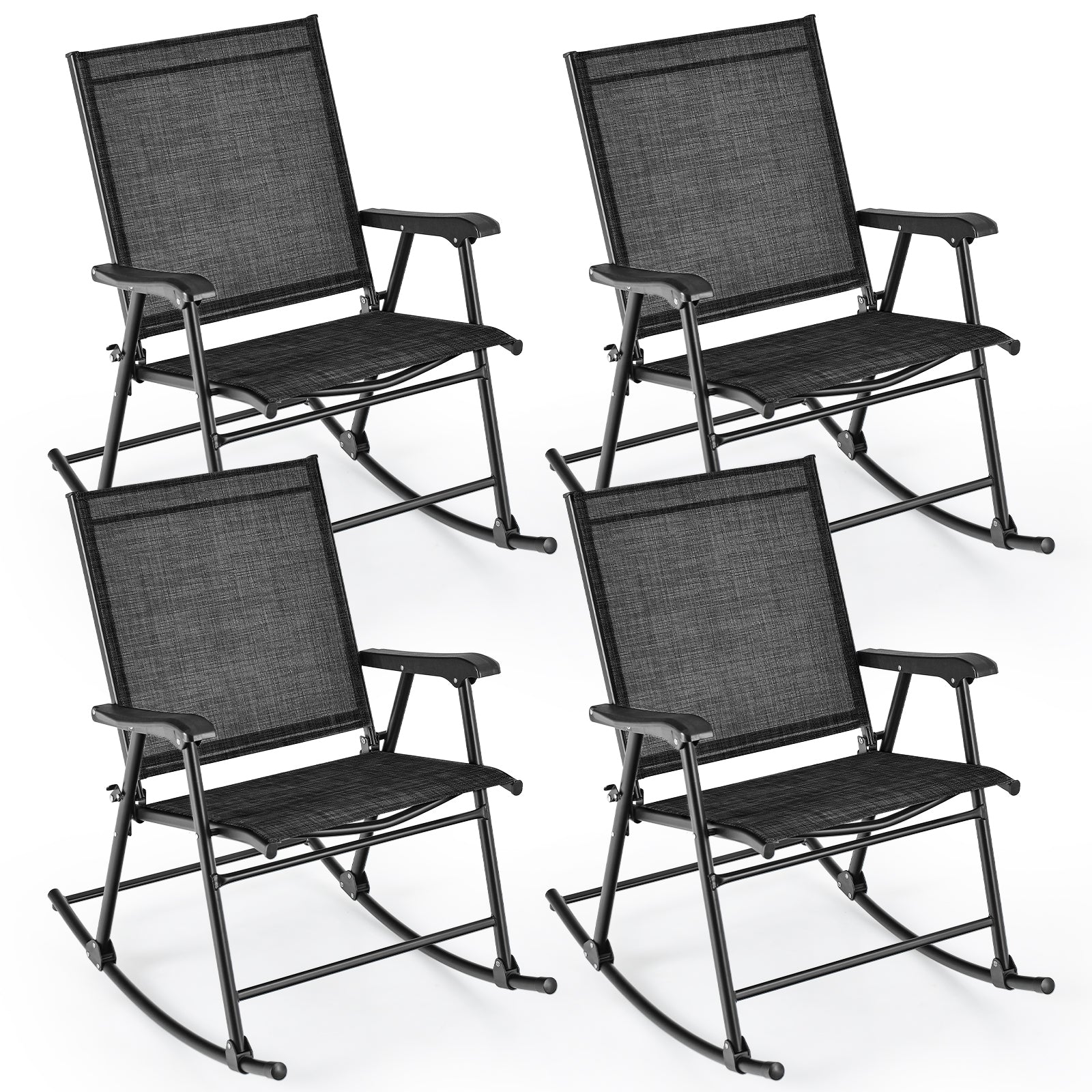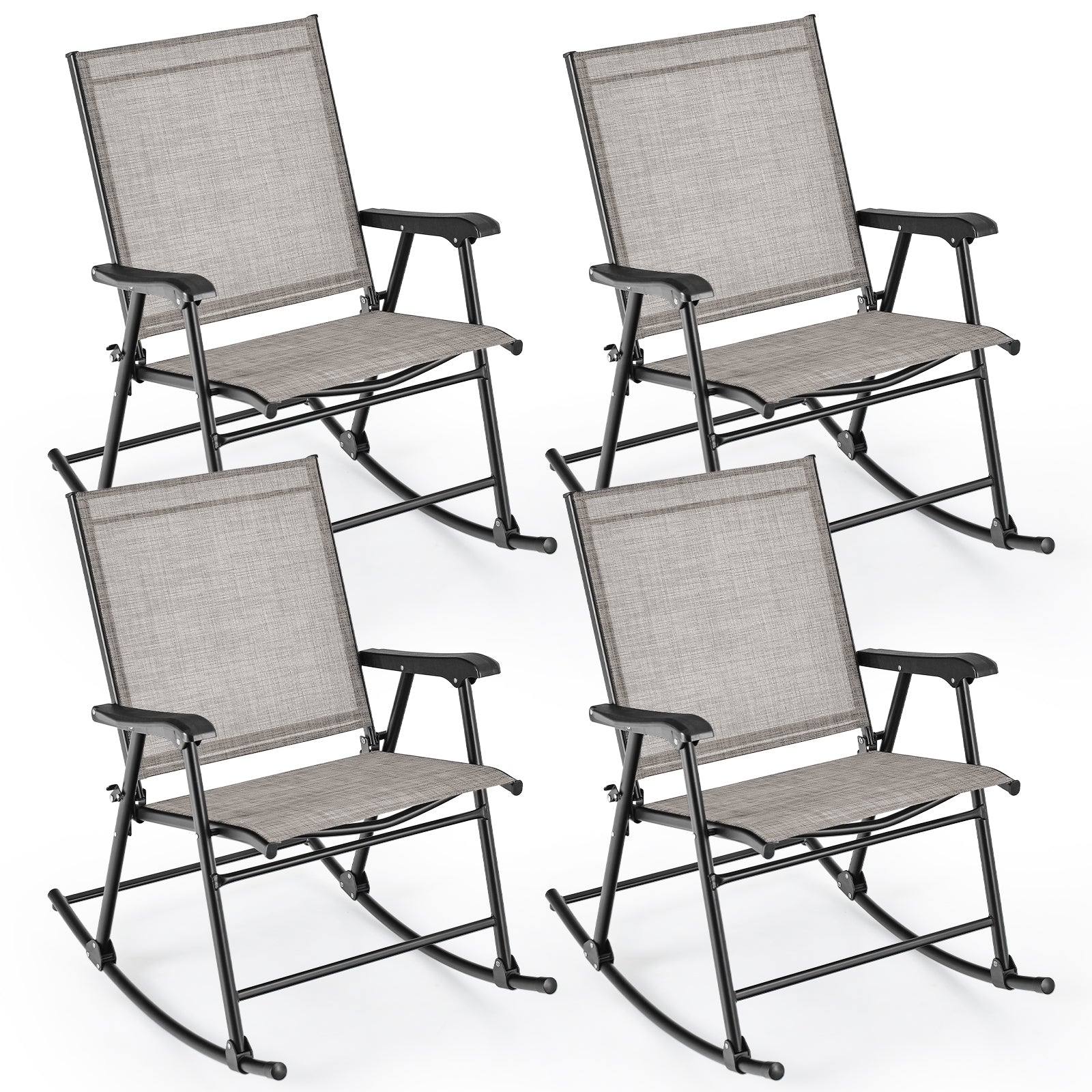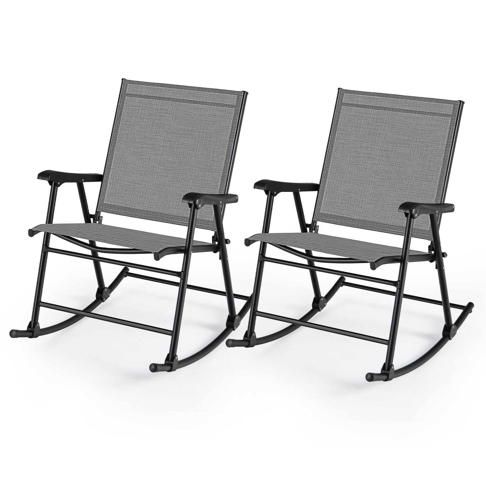 Lounge comfortably on your porch and enjoy a drink with your family using this set of 2 patio rocking chairs. Constructed with a sturdy metal frame and high-quality fabric, these chairs offer both stability and comfort for your relaxation. The safety latch ensures the porch rockers stay securely in place while the gentle rocking motion allows you to unwind and appreciate the breeze. With a high backrest and armrests, you will experience unparalleled comfort while lounging. The ergonomic design perfectly conforms to your body, making it ideal for watching the sunset, reading a book, or savoring a refreshing glass of homemade lemonade. These folding rocker chairs require no assembly and are straightforward to use. Additionally, their portability and foldable feature make them convenient for camping, traveling, and more.