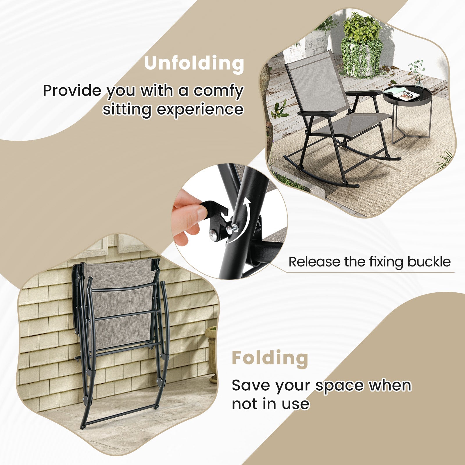- [Convenient Folding Design]: Easily fold the high back rocking chairs into a compact size when not in use, allowing for convenient storage in closets or car trunks for camping trips. Lightweight and portable, these chairs can be taken anywhere you go for added comfort on the go.