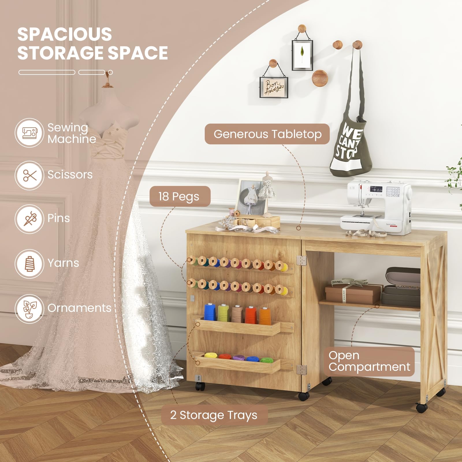 This multipurpose sewing table seamlessly transforms into a side table or computer desk, making it a perfect fit for any compact space. With spacious storage space, including a generous tabletop, 2 storage trays, 18 pegs, and an open compartment, all your crafting supplies will be neatly organized at your fingertips. The sewing cart is equipped with 5 lockable swivel wheels, providing smooth mobility and stability for a secure crafting experience. With a charming barn door design, this sewing craft table adds a touch of rustic chic to your workspace, creating a stylish and functional addition to any home.