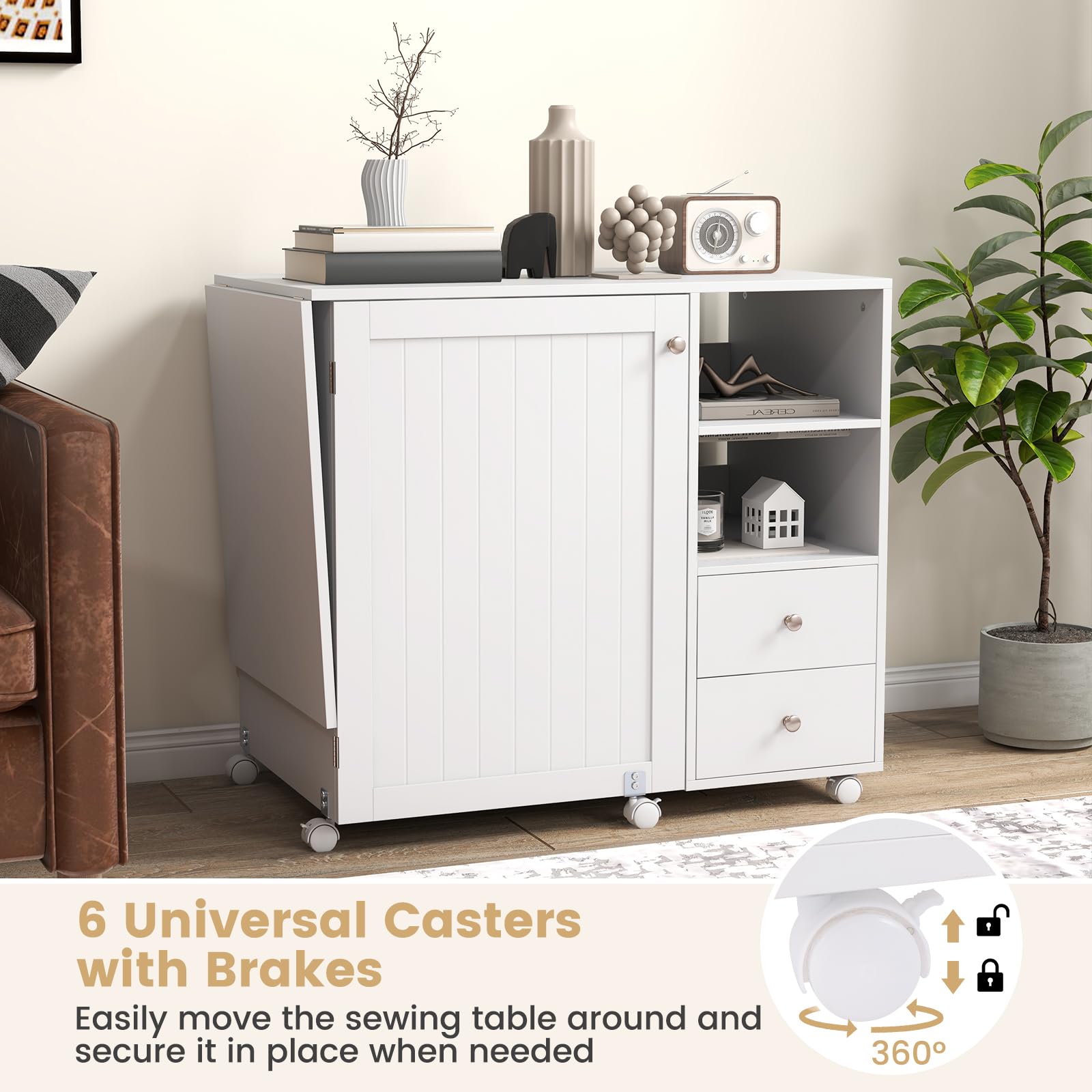 This versatile craft station not only keeps your devices charged with its built-in charging station but also offers abundant organized storage with 2 drawers, shelves and hidden bins. Its clever, foldable design maximizes the use of space, perfect for any crafting enthusiast in a compact home. Plus, mobility is a breeze with 6 lockable universal casters that ensure smooth movement and stable placement, allowing you to craft with ease and confidence anywhere, anytime. Based on your different needs, it can be used as a craft table, a portable home office desk, a side desk or even a utility table