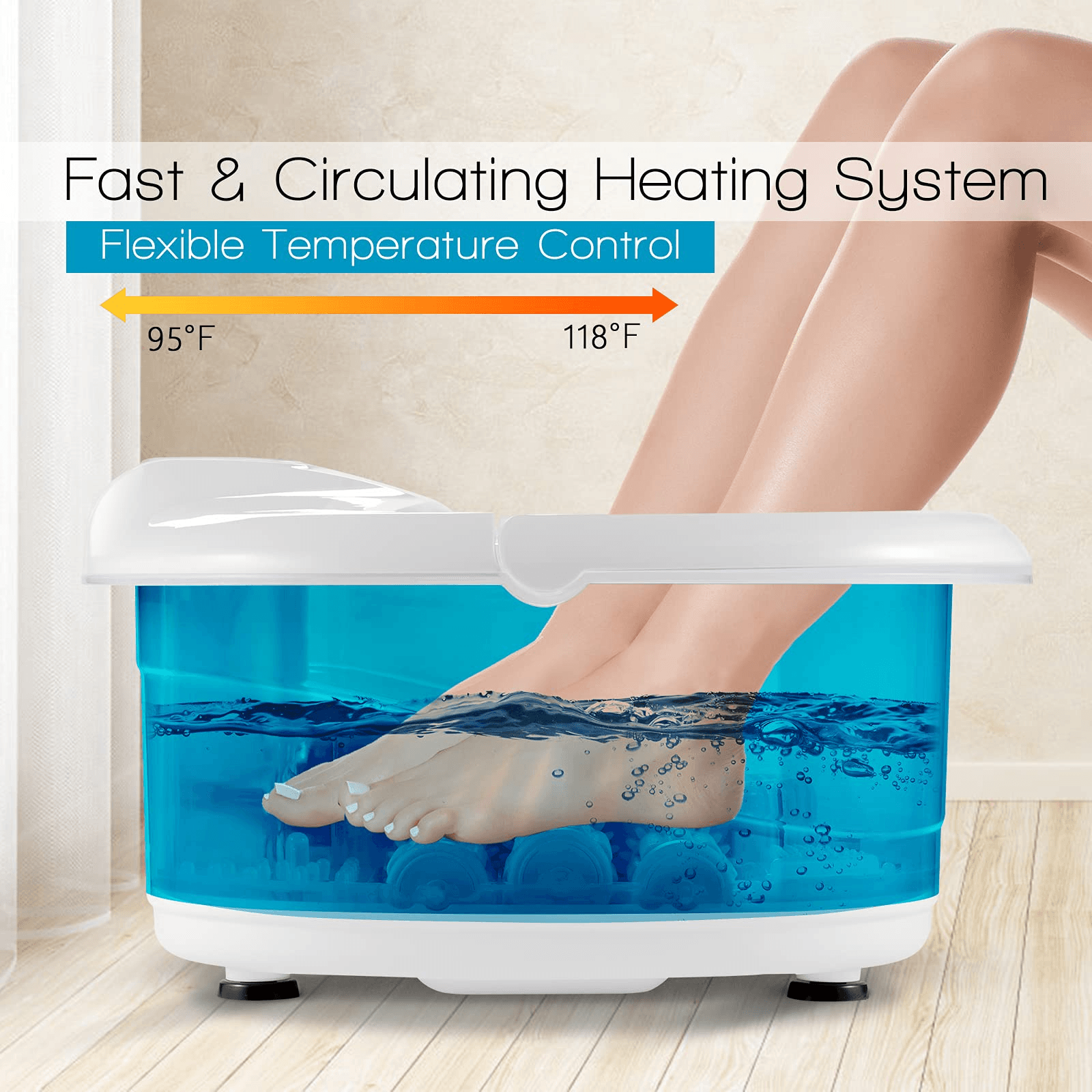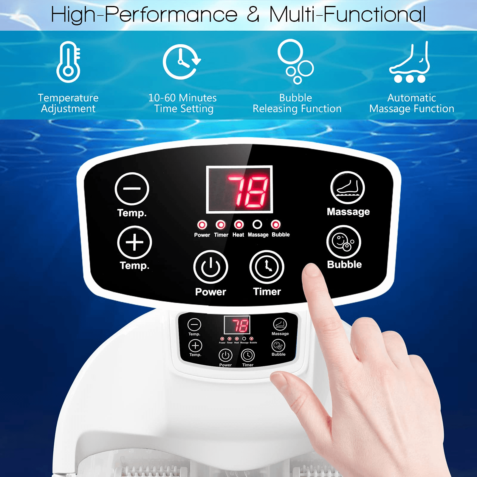 - [Automatic Massage Rollers & Bubbles]: Equipped with 3 pairs of electric massage rollers with dotted nodes, this foot bath massager can effectively relax your soles to help promote blood circulation and metabolism. What's more, the continuously released bubbles help to further reduce the tension and pressure.
