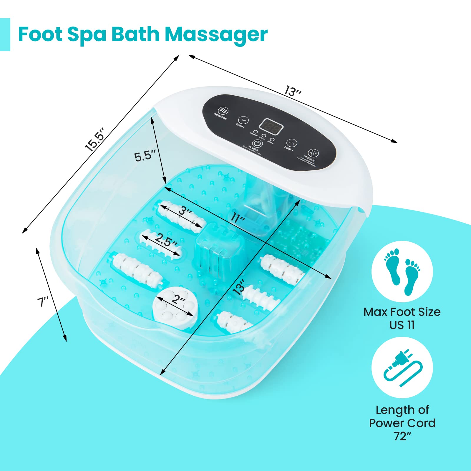 • Massage Rollers Relieve Soreness: Devoted to full massage, the foot spa massager contains 2 kinds of rollers (2.5"or 3"long) & removable massage beads. By the way, the foot soak tub offers roomy massaging space inside, suitable for feet under US 11.