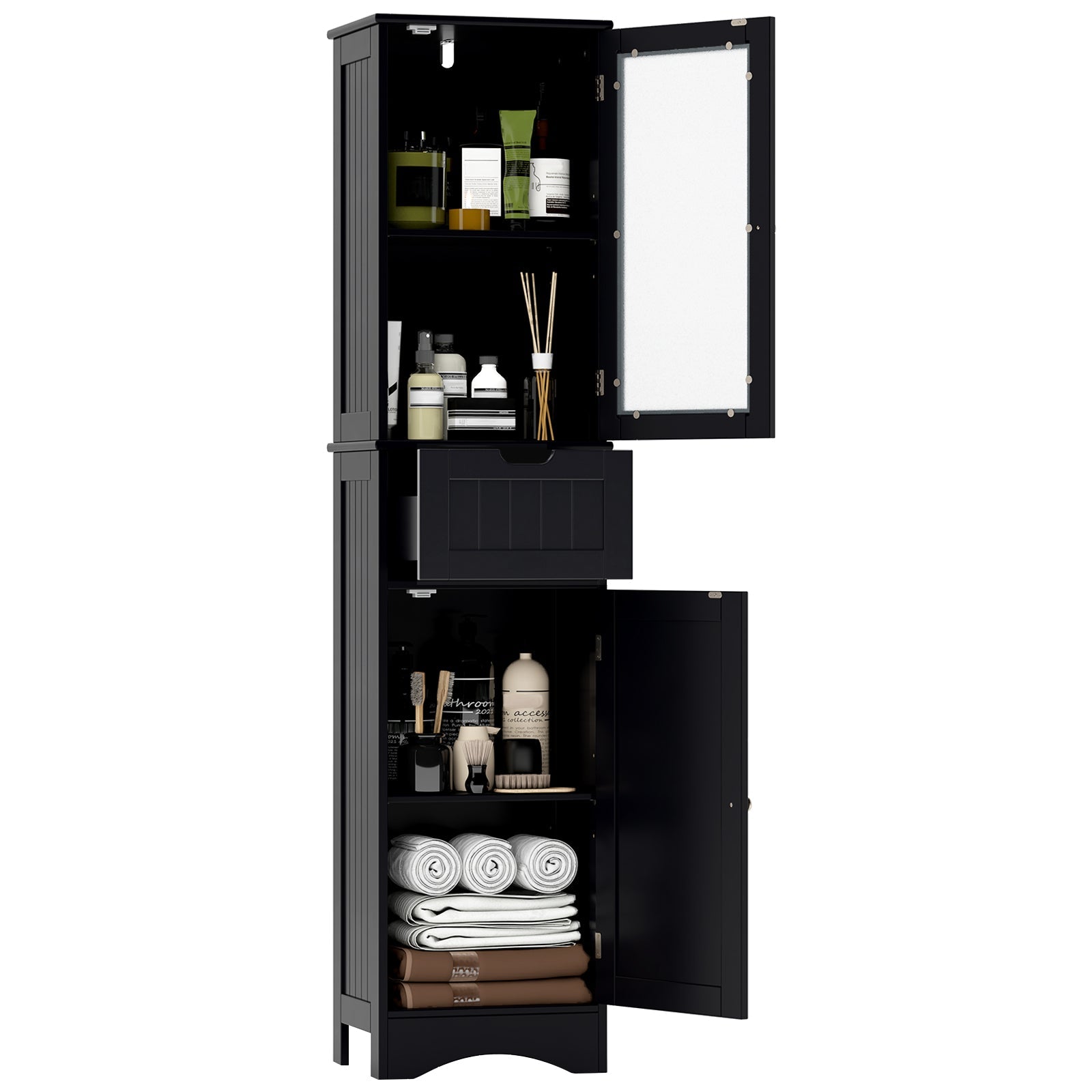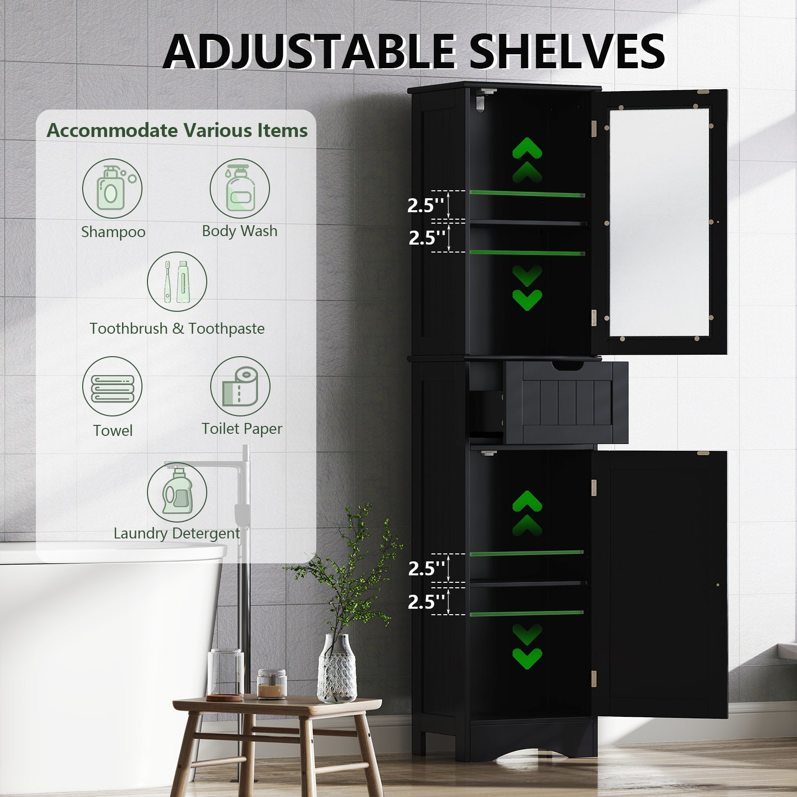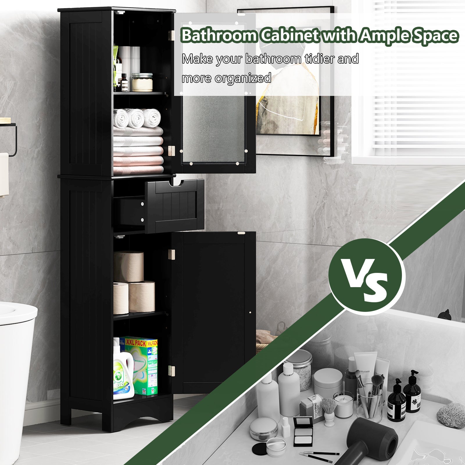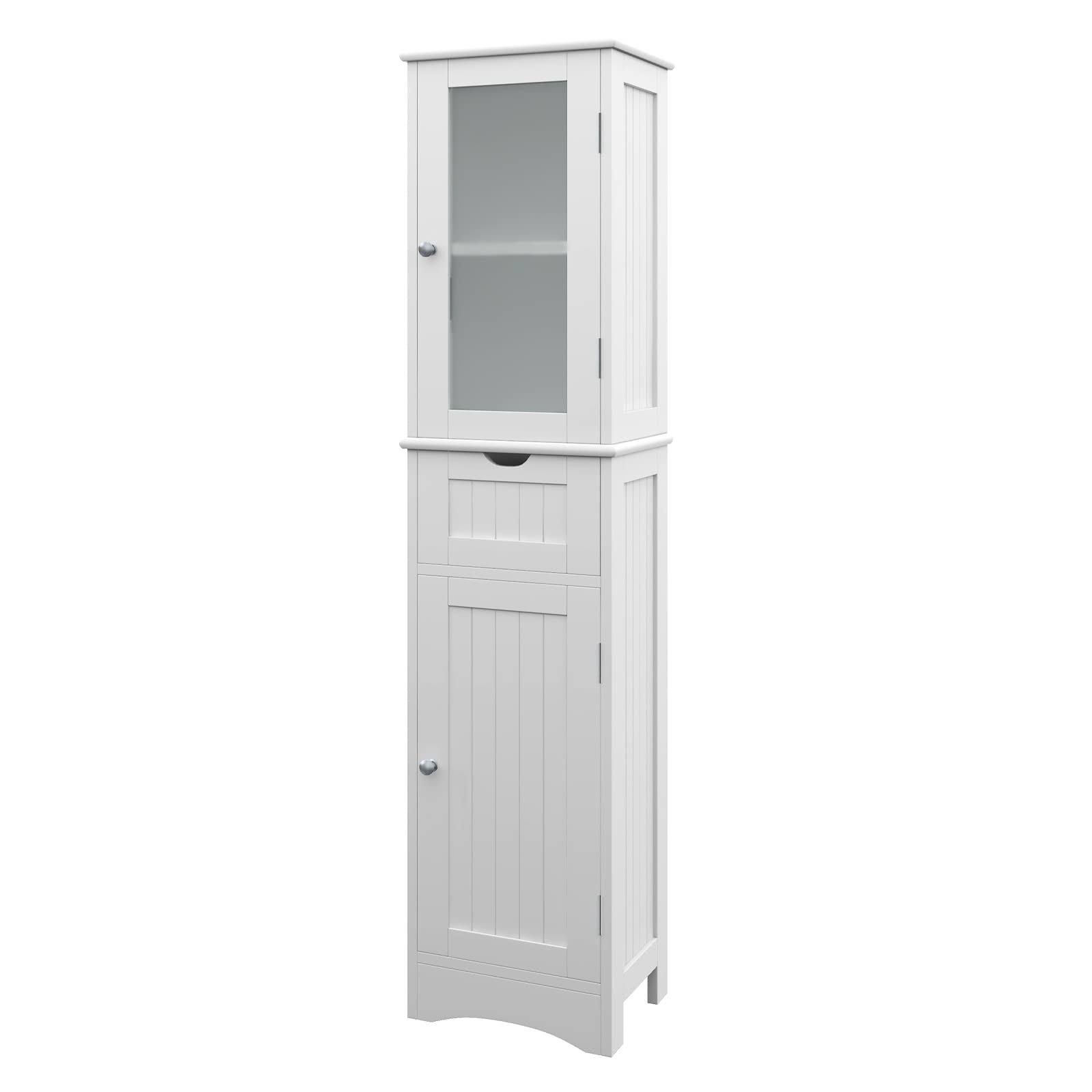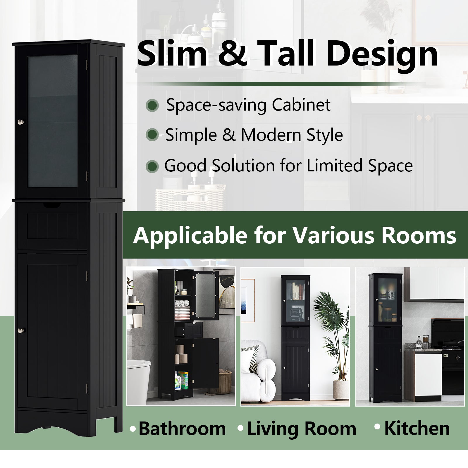 Consisting of one drawer with a cut-out handle and 2 cabinets that feature 4 compartments, this bathroom cabinet can well organize your body wash, toothbrush, toothpaste, laundry detergent, and more. The shelves are adjustable to fix different items. With the magnetic catch, the doors are easy to open and close. And the metal drawer slides enable you to smoothly open the drawer. Because of the slim design, this space-saving cabinet is a good solution for limited space. The slim and modern style also makes this bathroom cabinet with ample space to fit different decorations and is applicable for various rooms, such as the living room, bathroom, kitchen, etc.