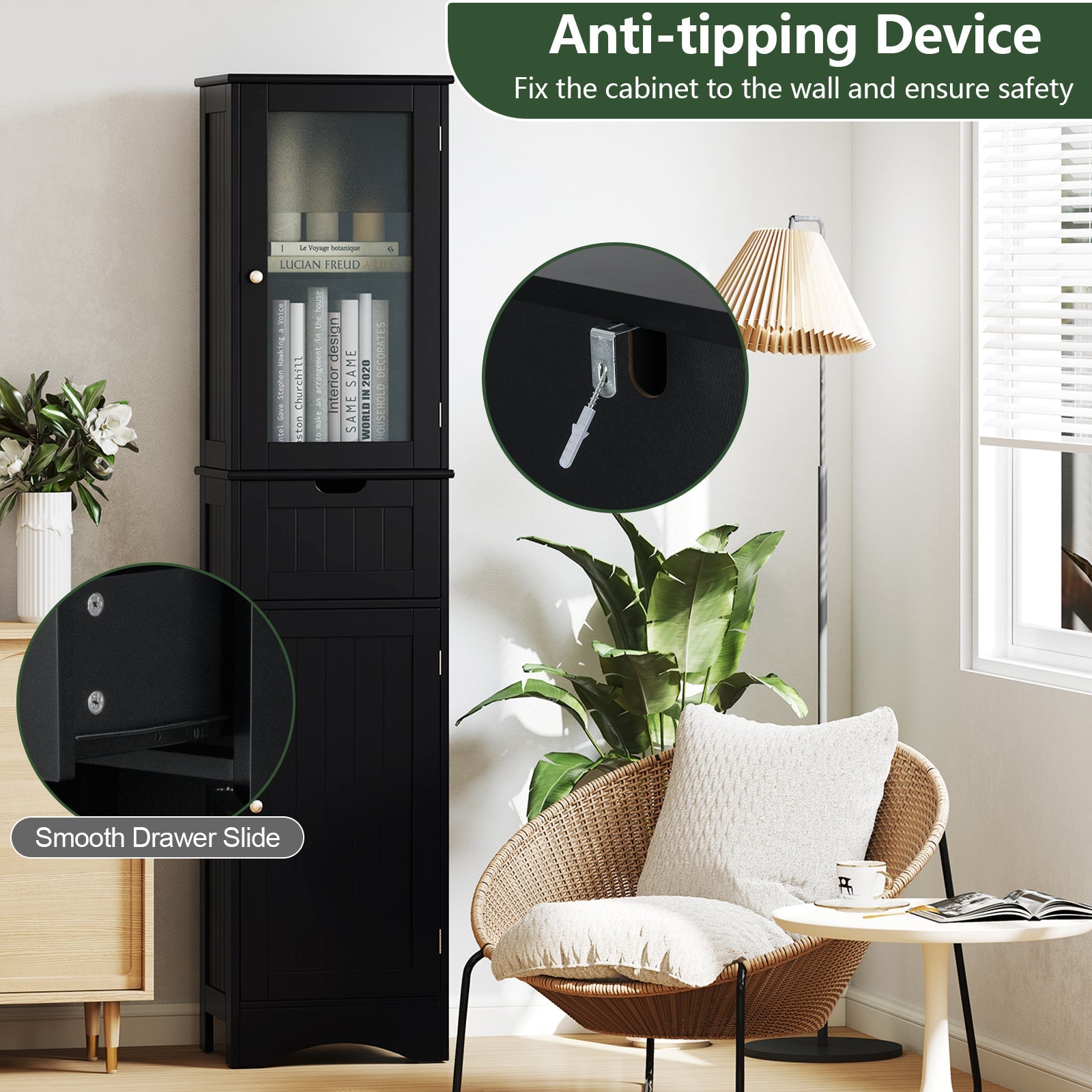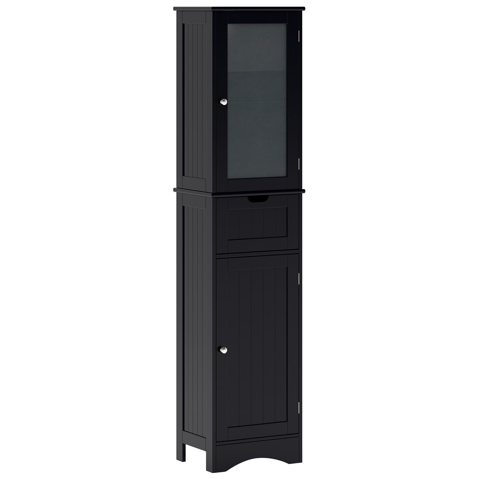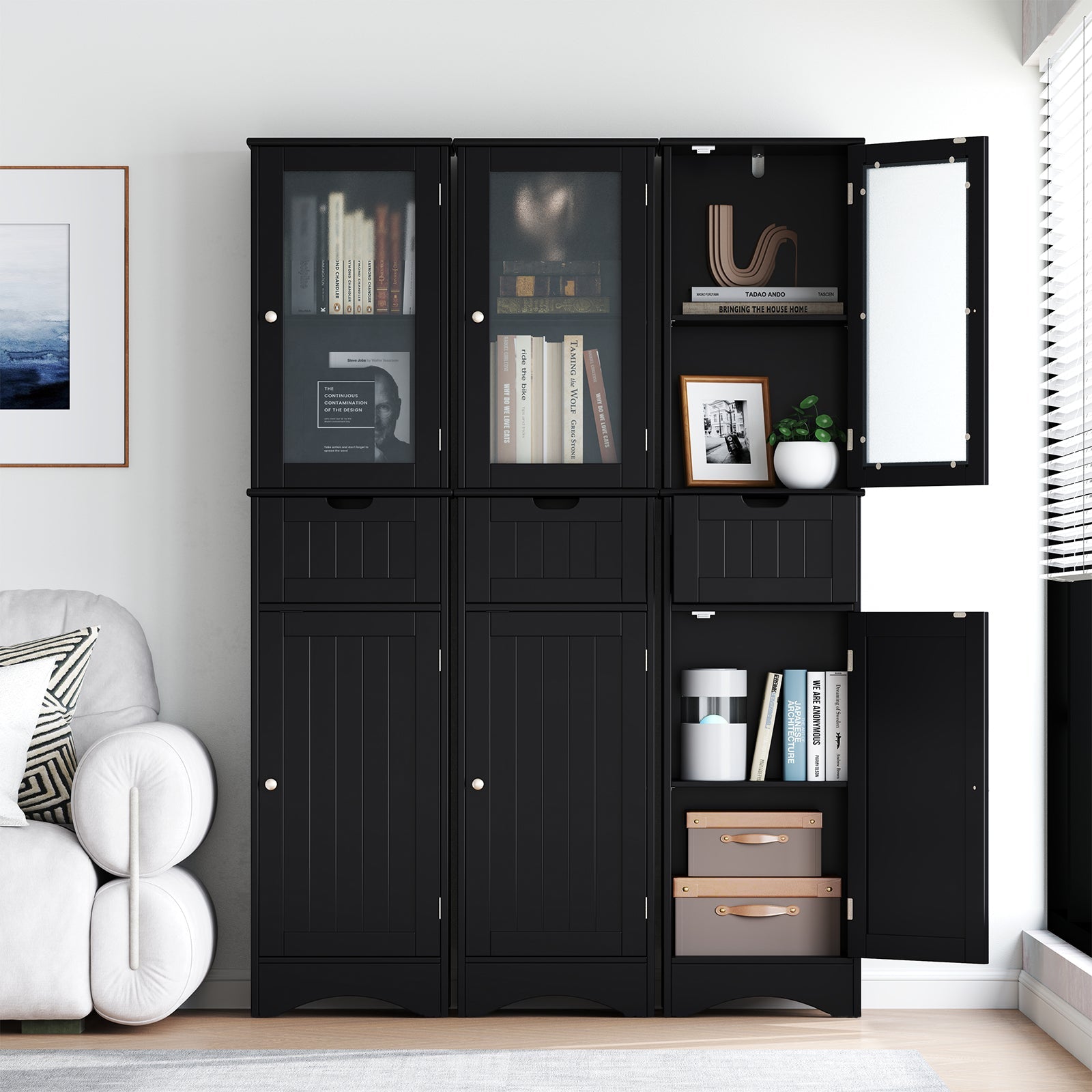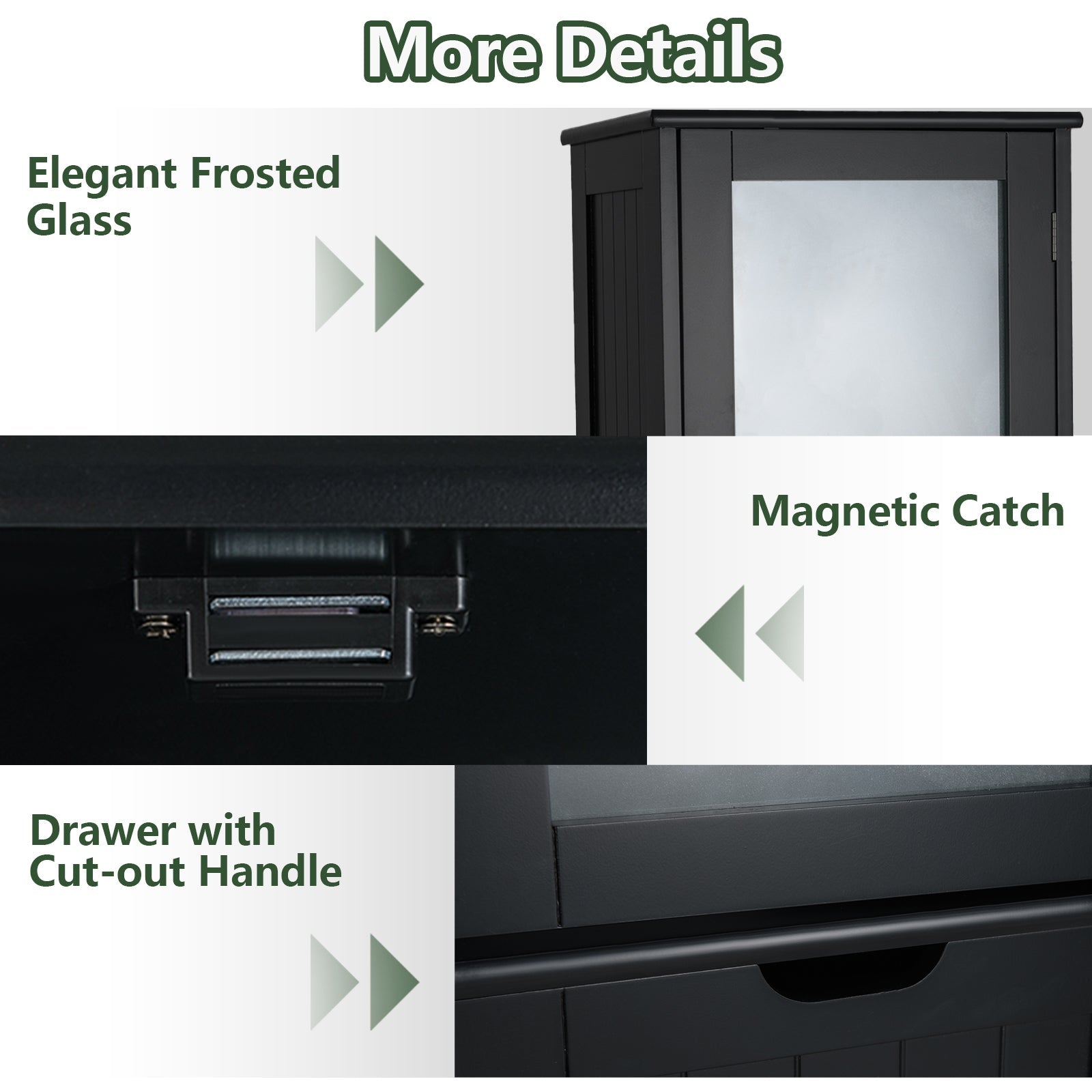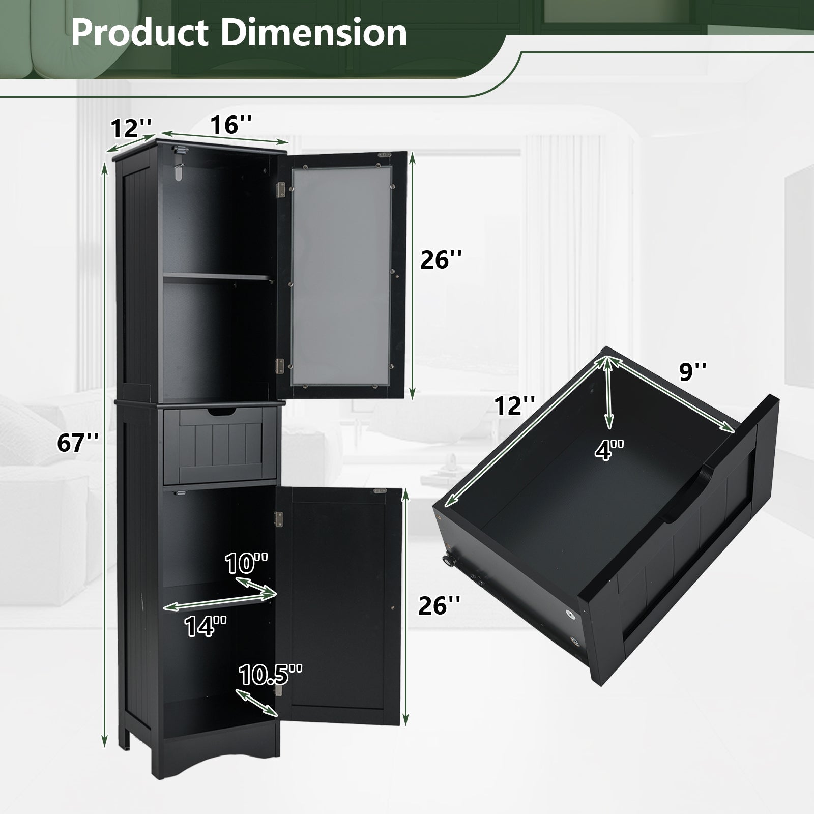 Consisting of one drawer with a cut-out handle and 2 cabinets that feature 4 compartments, this bathroom cabinet can well organize your body wash, toothbrush, toothpaste, laundry detergent, and more. The shelves are adjustable to fix different items. With the magnetic catch, the doors are easy to open and close. And the metal drawer slides enable you to smoothly open the drawer. Because of the slim design, this space-saving cabinet is a good solution for limited space. The slim and modern style also makes this bathroom cabinet with ample space to fit different decorations and is applicable for various rooms, such as the living room, bathroom, kitchen, etc.