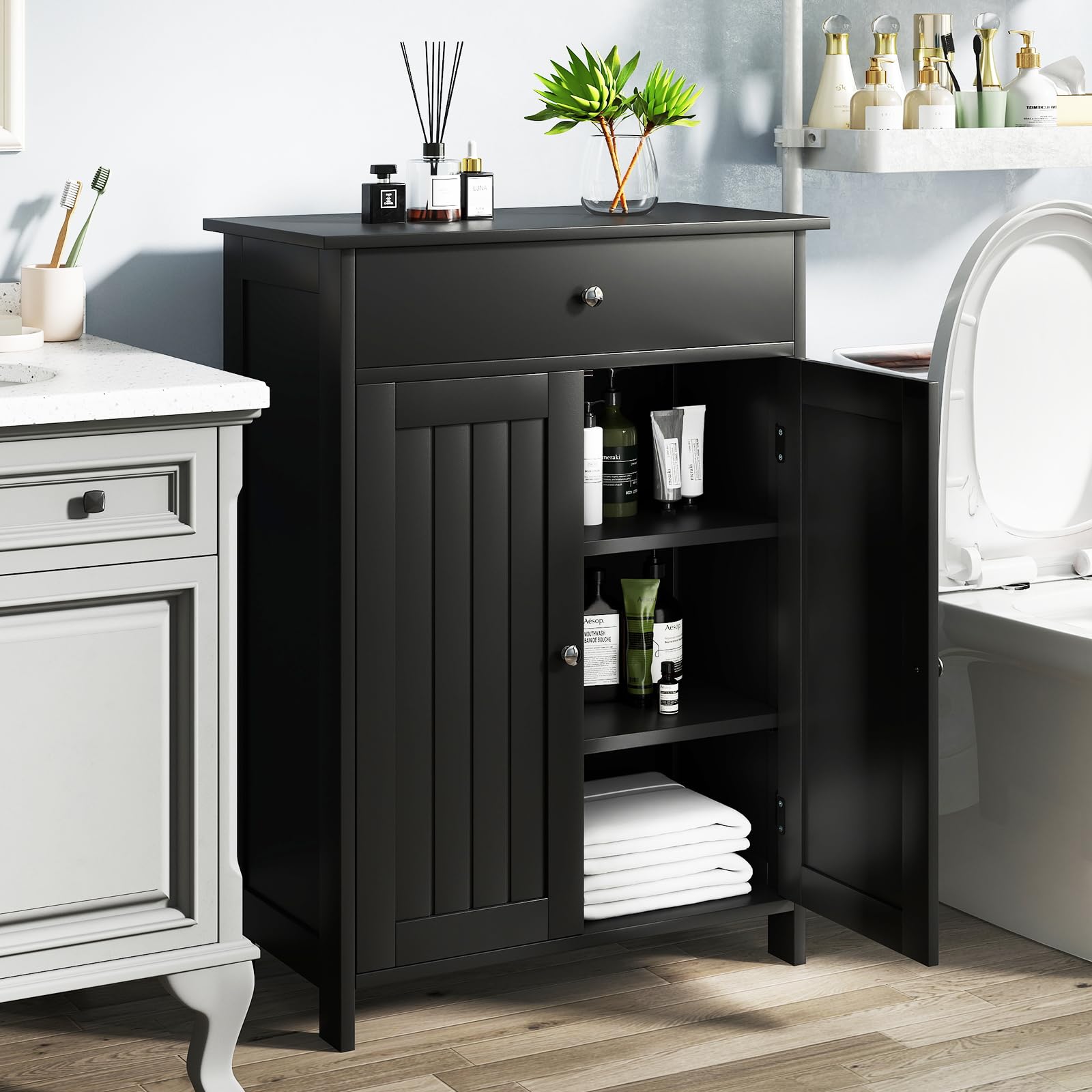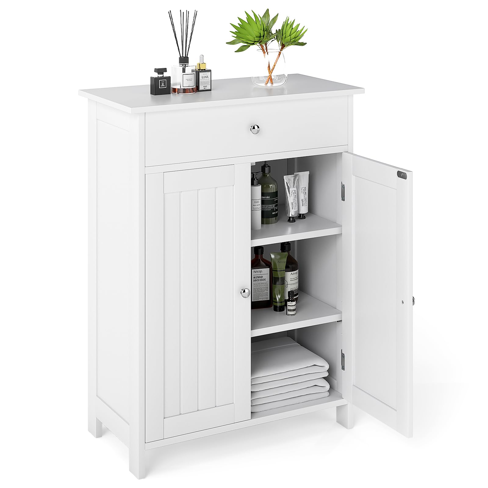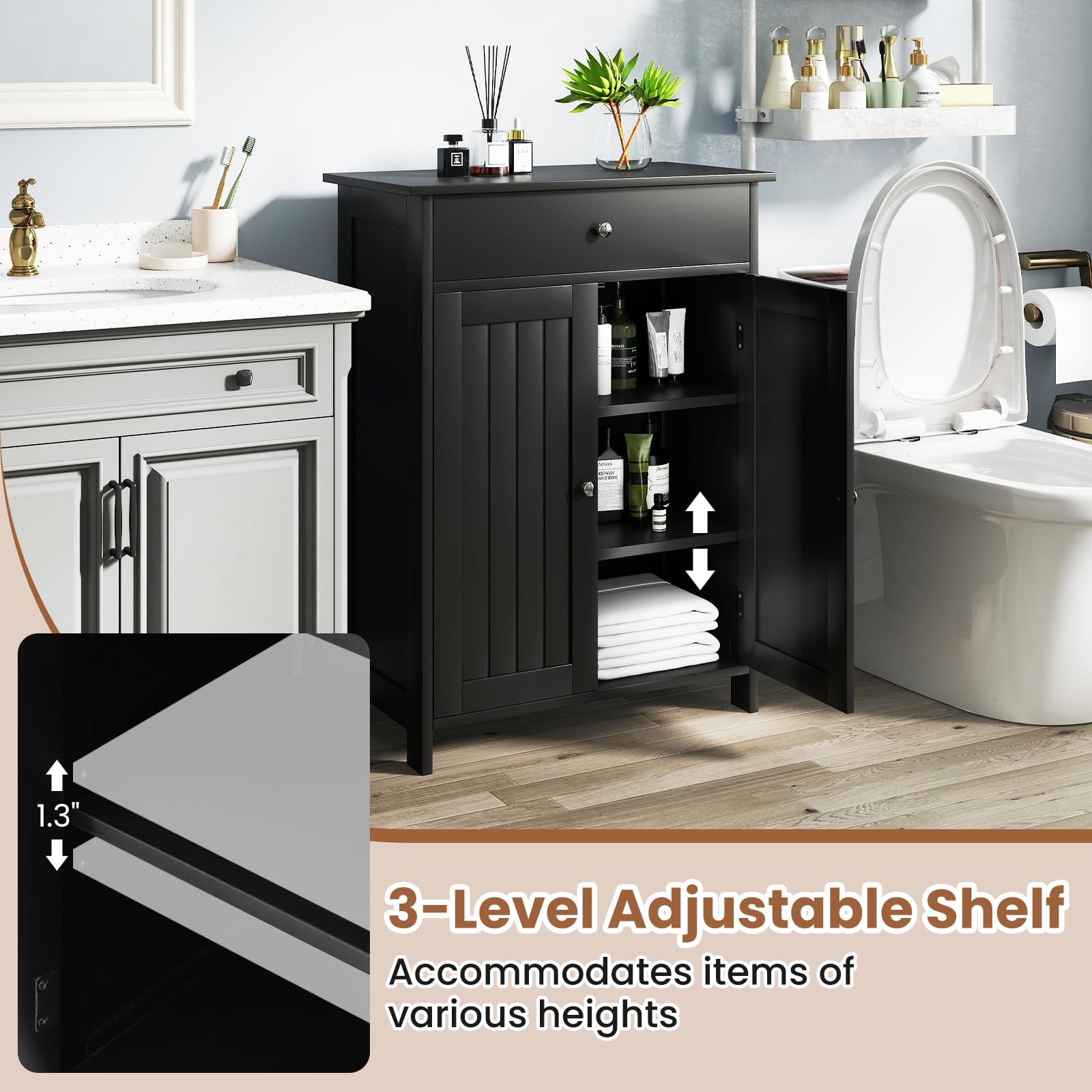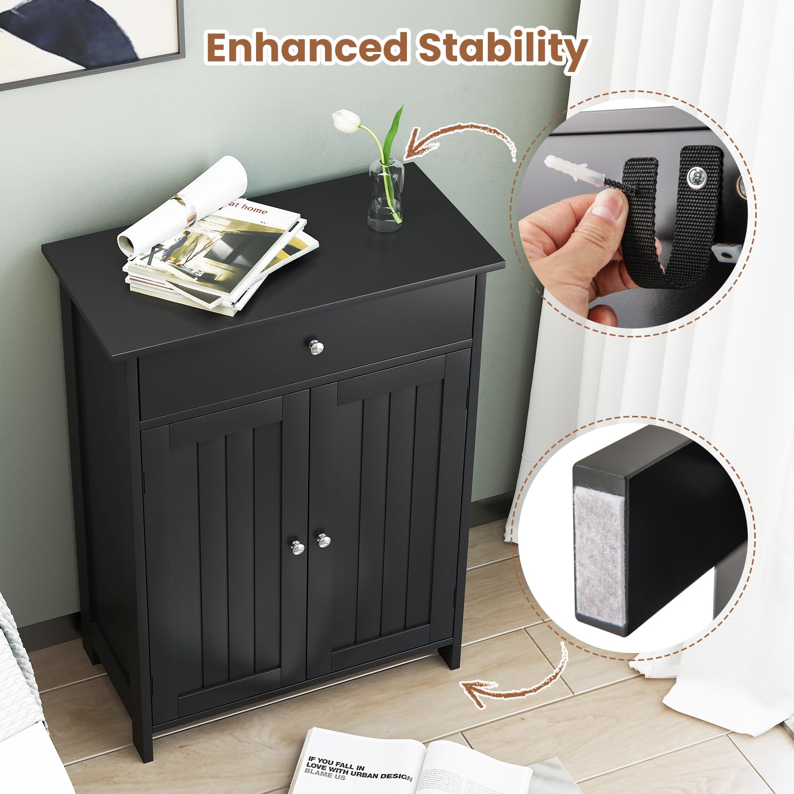Tired of cluttered counters ruining your morning routine? This sleek bathroom cabinet organizes body wash, shampoo, makeup, and skincare essentials with its generous 23.5" tabletop and handy drawer. Behind its slatted doors, the 1.3"-adjustable shelf accommodates paper rolls, towels, or tall bottles with ease. An anti-tip kit and 4 non-slip feet ensure secure placement, even in wet bathroom conditions. The wipe-clean surface resists spills, magnetic latches keep doors firmly closed, and the minimalist design effortlessly complements entryways, living rooms, or offices. Simplify your space and elevate your daily routine with this smart storage solution!
