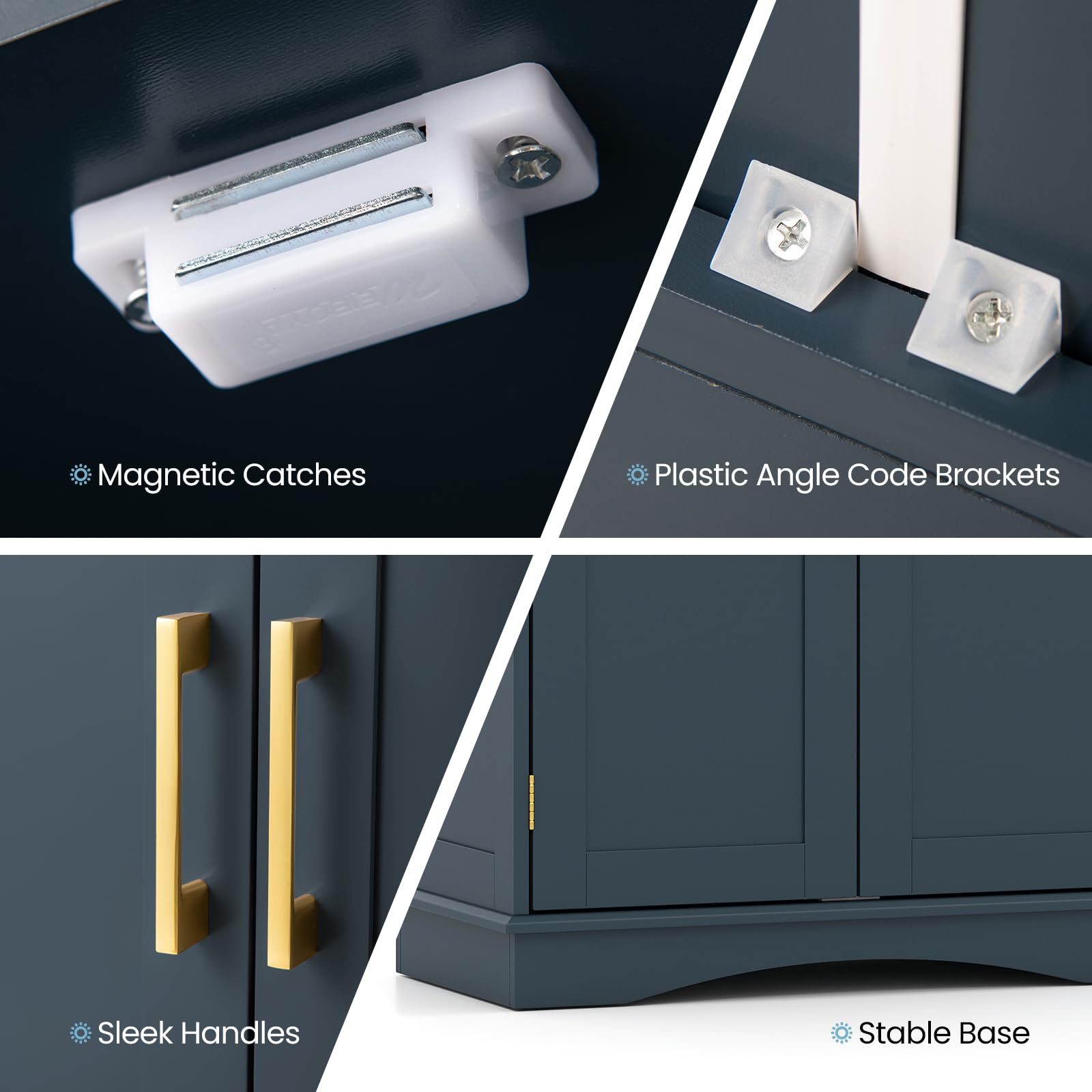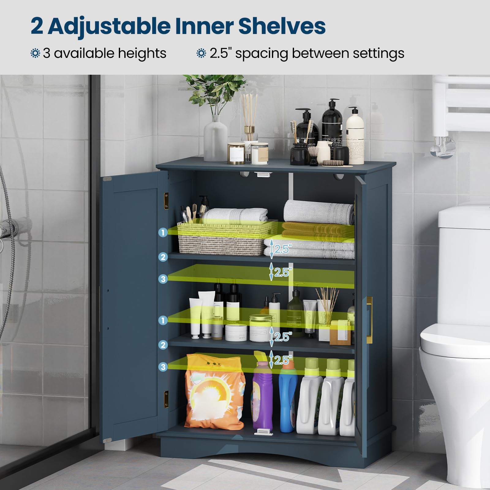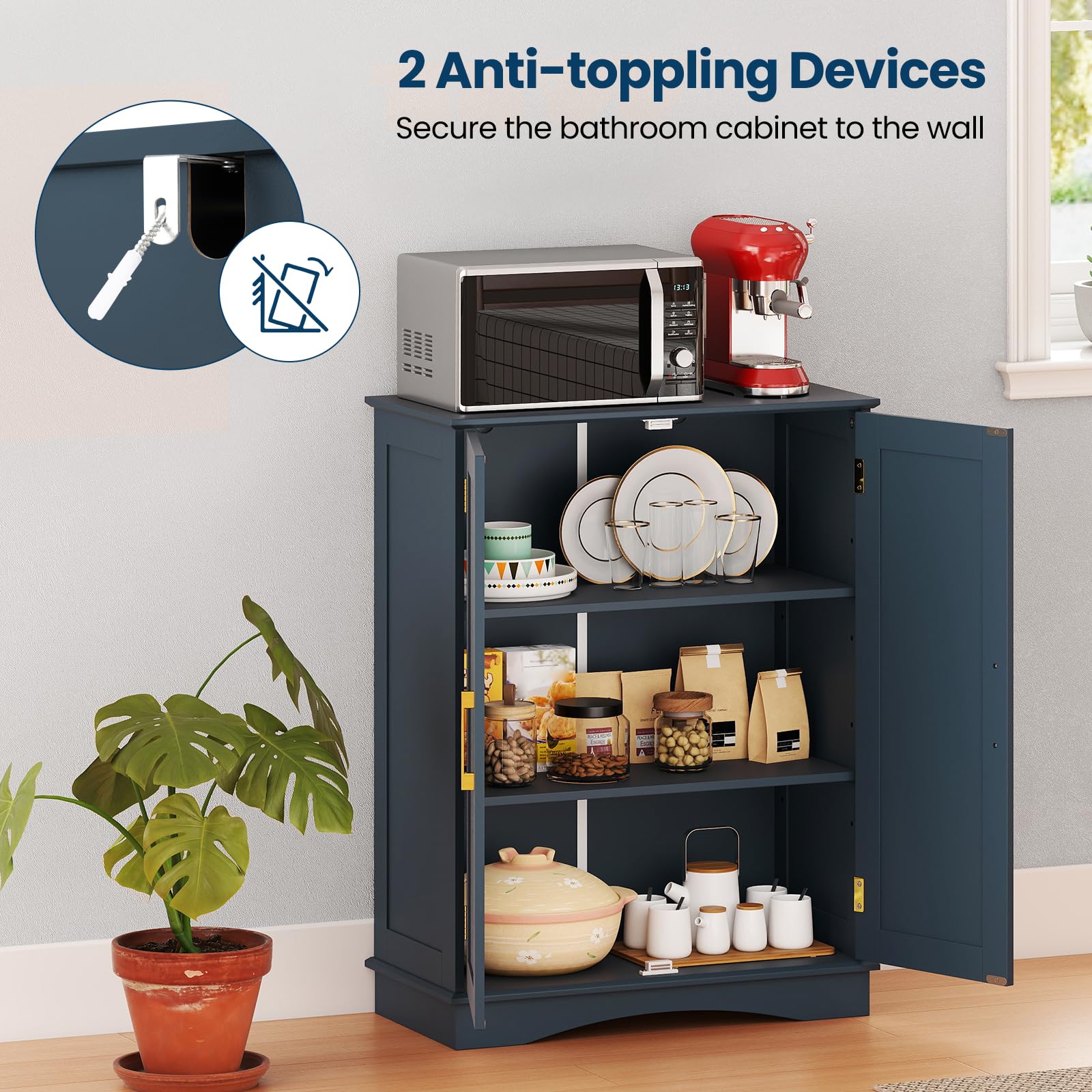 It features 2 inner shelves that are easily adjustable to 3 different height settings, and you can store a diverse range of items, whether large or small. Besides, the bathroom cabinet prioritizes your safety with its sturdy base and dual anti-tipping devices. Furthermore, the built-in handles and secure magnetic catches bring added functionality. And the storage organizer has a stylish look and effortlessly blends into living room, kitchen, entryway and so on.