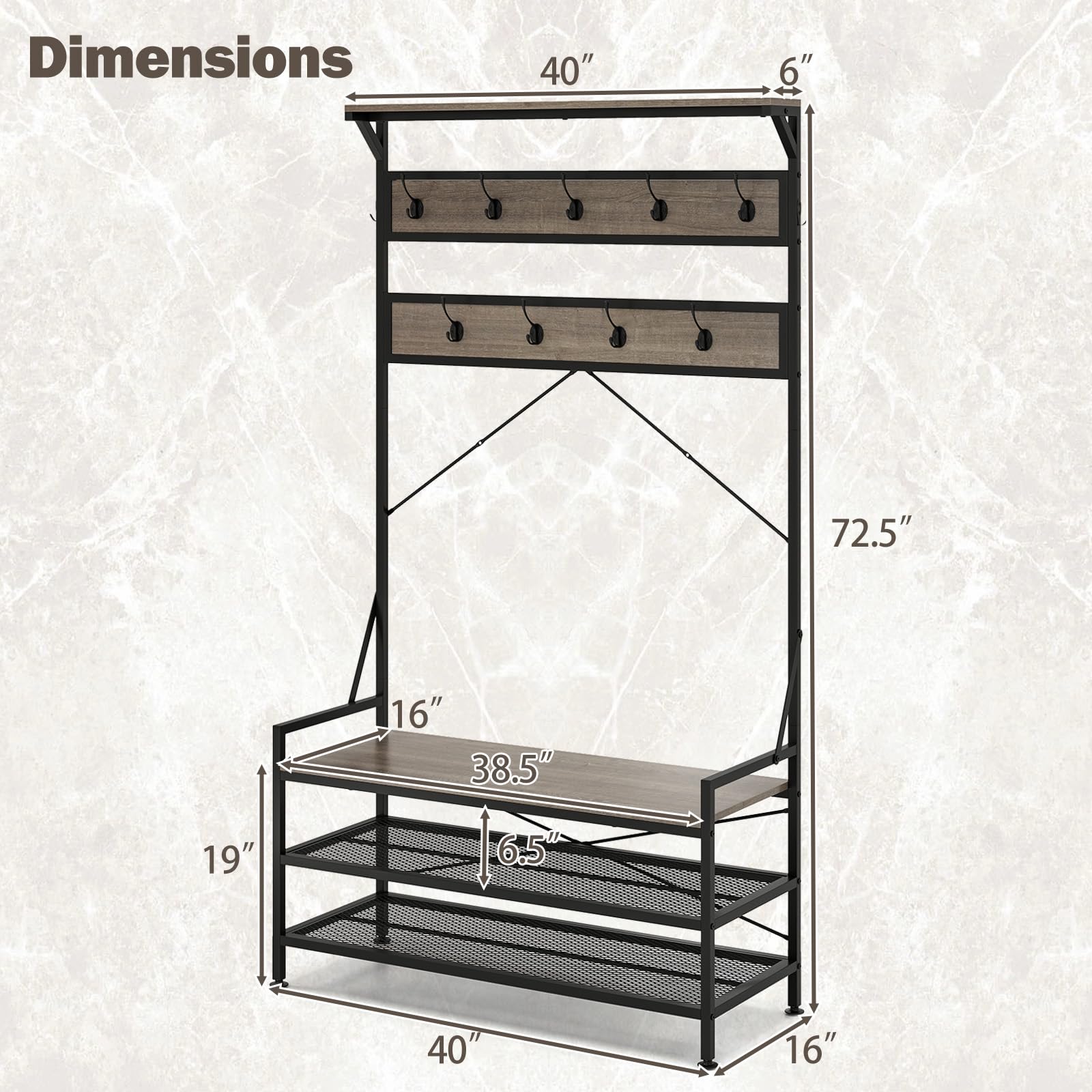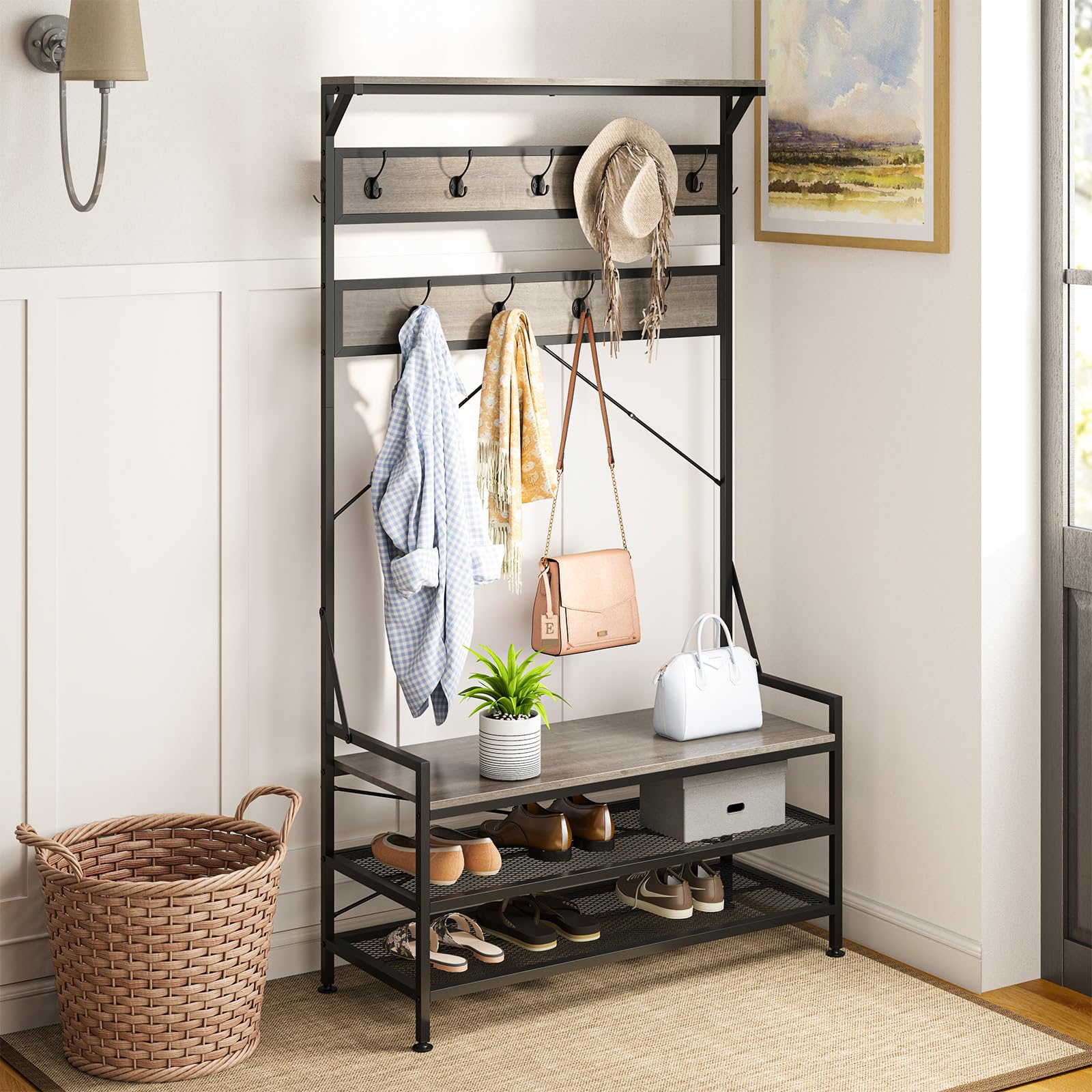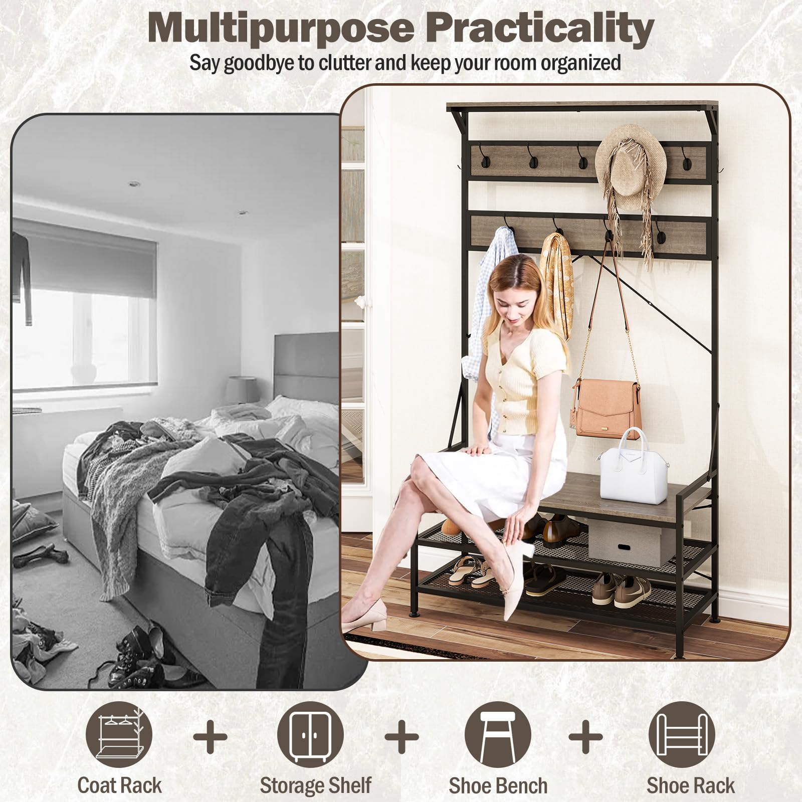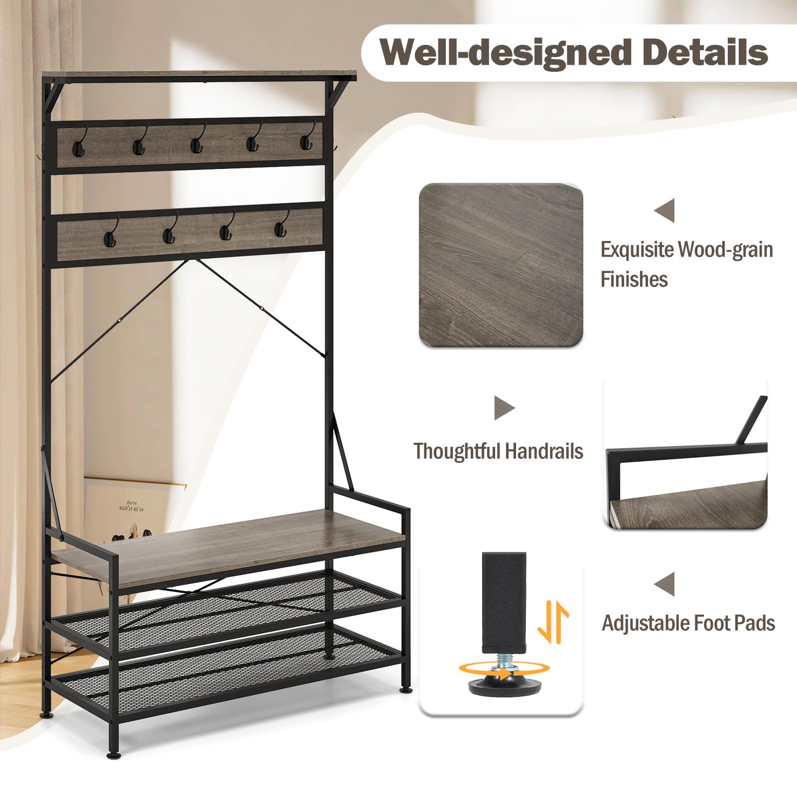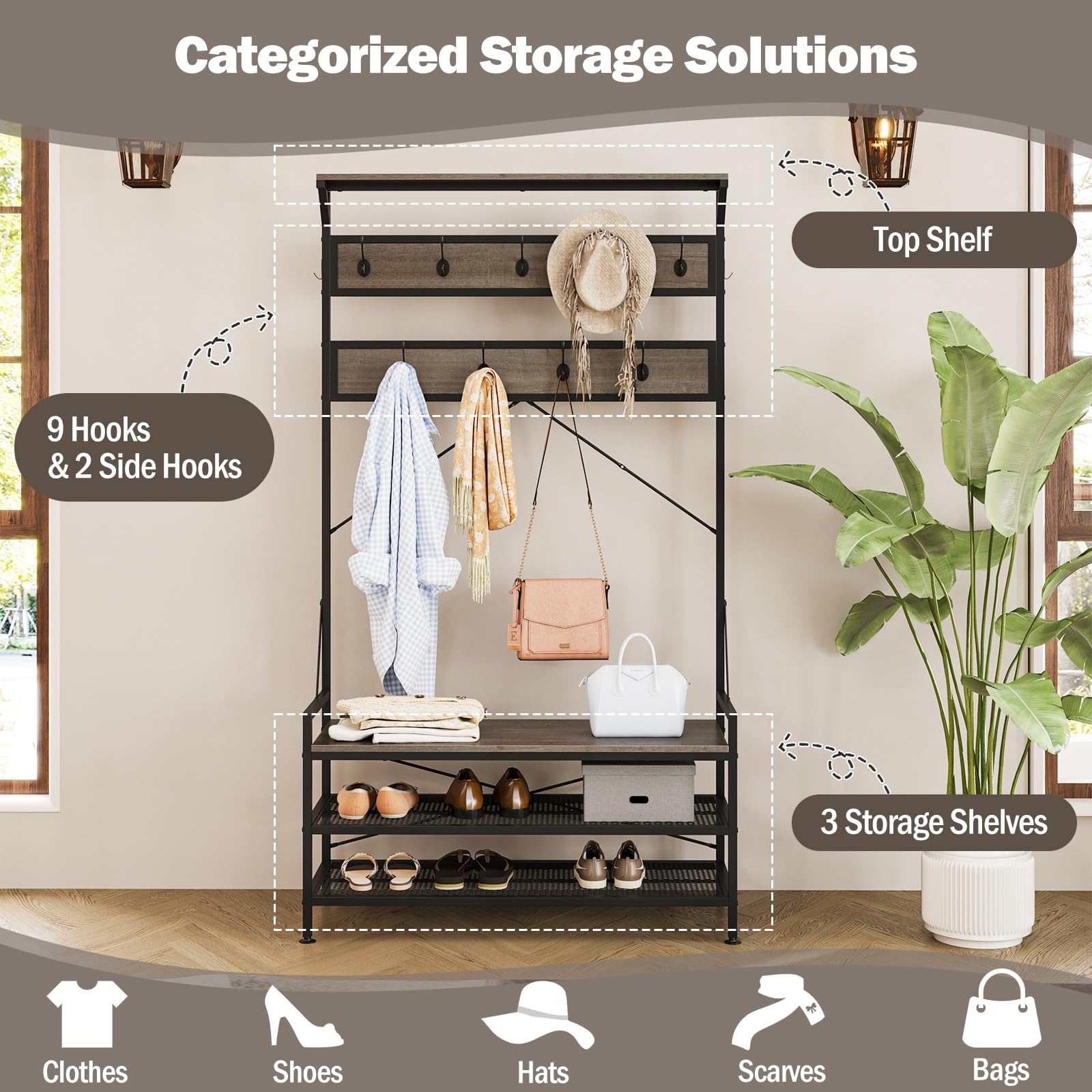 Upgrade your entryway with our multifunctional coat rack that combines elegance and practicality in one stylish solution. With ample storage space for shoes, bags, and more, this hall tree effortlessly organizes your daily essentials. Featuring a robust metal frame with sturdy triangle supports and anti-tipping devices, this piece ensures stability and safety. The elegant wood-grain finishes add a touch of sophistication to any room, while adjustable foot pads guarantee stability on any surface. This freestanding coat rack is not just a piece of furniture – it's a versatile coat rack, storage shelf, shoe bench, and shoe rack all in one. Whether in the entryway, living room, it exudes charm and practicality.