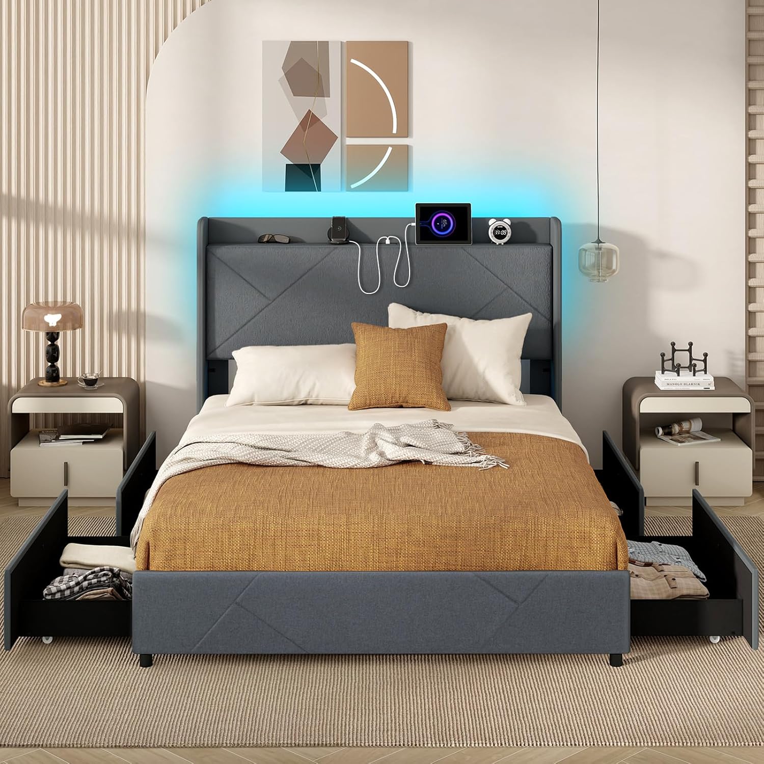 Excite your bedroom with the ultimate sleep and entertainment masterpiece! This sleek, modern platform bed frame full size lights up your world with its dazzling LED ambient lighting featuring over 60,000 colors. Control lights via an app or let them dance to your tunes for a show-stopping effect. The sumptuous wingback headboard isn’t just for show; it’s a haven of convenience with built-in storage and pockets for your essentials. Stay powered up with the integrated charging station equipped with everything for today’s gadgets. Say goodbye to clutter with discreet, spacious drawers making organization effortless. And rest easy on the robust frame that promises noise-free stability without needing a box spring. Transform your sleep into an experience—elevate your space now!