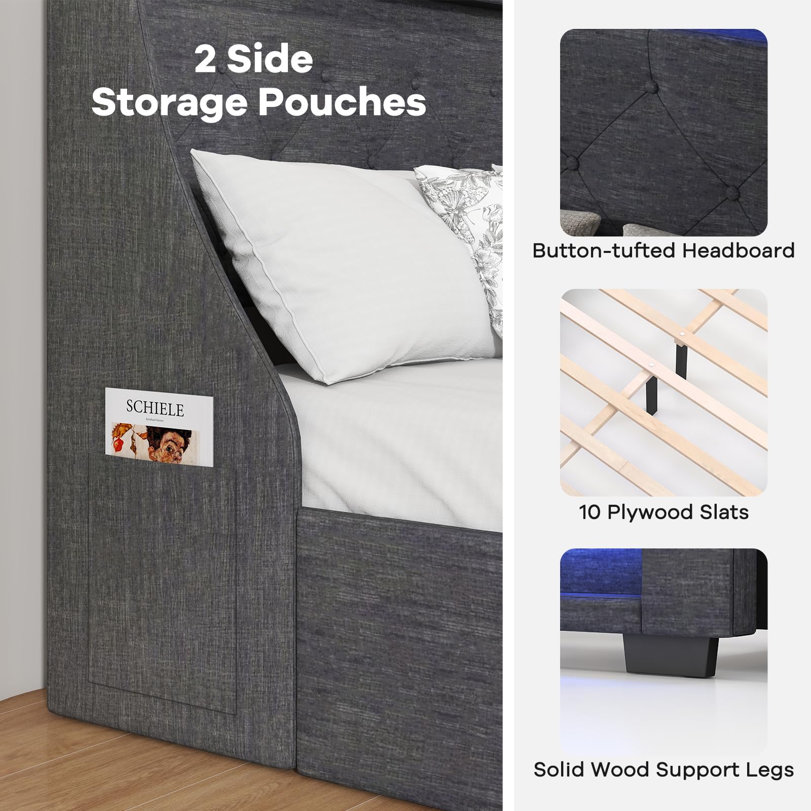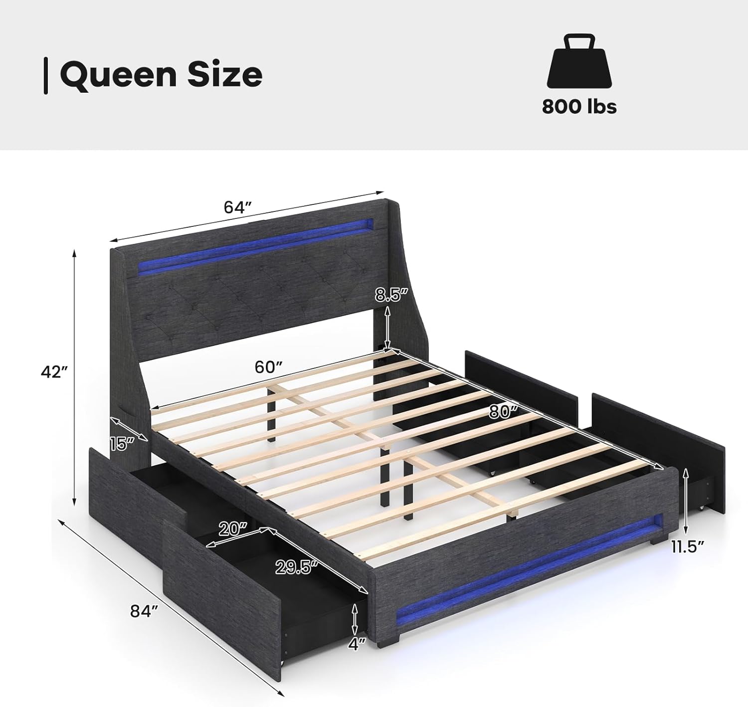 Upgrade to our multifunctional LED bed frame, where supreme functionality meets cutting-edge design. Immerse yourself in a spectrum of 60,000 colors with LED lights that sync to your favorite tunes, all controllable via remote or smartphone for a personalized atmosphere. Brimming with innovative storage solutions, this bed features roll-out drawers and clever side pockets to keep your sleeping space clutter-free. Add a touch of elegance with the chic wingback headboard, designed for space efficiency and flawless integration with your nightstands. The built-in charging station, including multiple outlets, neatly powers all your devices right at your fingertips. Supported by robust wooden slats that handle up to 800 lbs, it comes box-spring-free for a sleek profile. Revolutionize your comfort and convenience today!