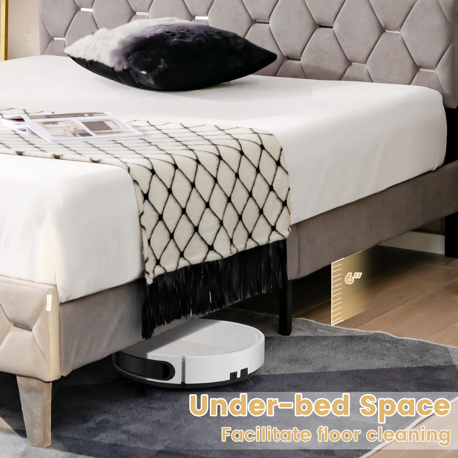 Constructed of sturdy plywood slats and a heavy-duty metal frame, this bed frame boasts 1000 lbs stronger bearing capacity. What's more, there is no squeaking sound while you sleep on it thanks to its noise reduction foams. And the storage headboard with hidden space and 4 open compartments allows you to fetch items with ease. Furthermore, the comfortable headboard is covered with skin-friendly velvet fabric and padded with a high-density sponge for ultimate coziness. Cleaning under the bed will not be a difficult task either because of its 6" clearance from the floor.