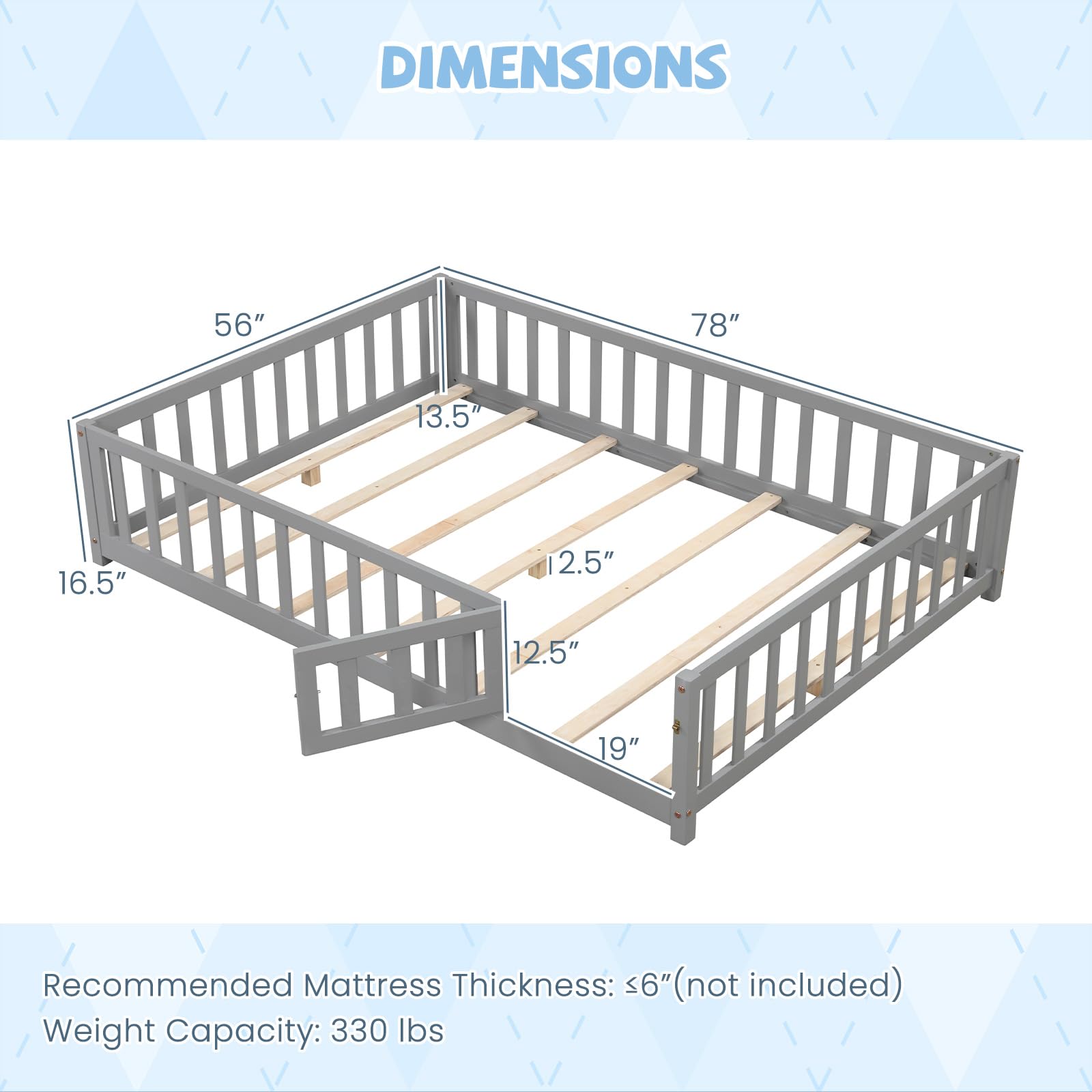 - [Safe Playpen with Removable Guardrails and Door]: The Montessori floor bed features 13.5" full-length guardrails for added safety, while the safety door with a secure latch ensures extra peace of mind. Both the guardrails and door are removable, offering flexibility as your child grows and their needs change.