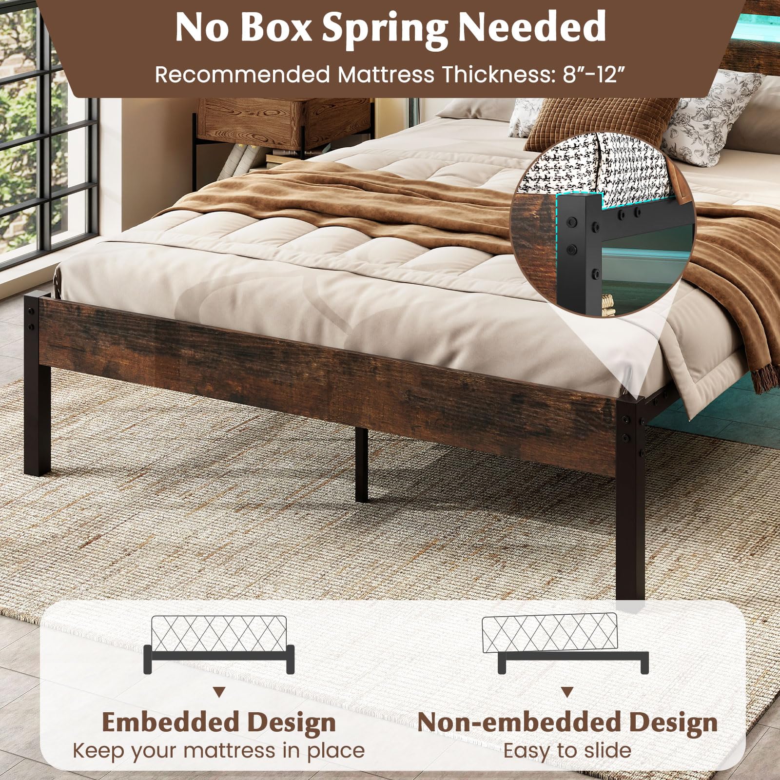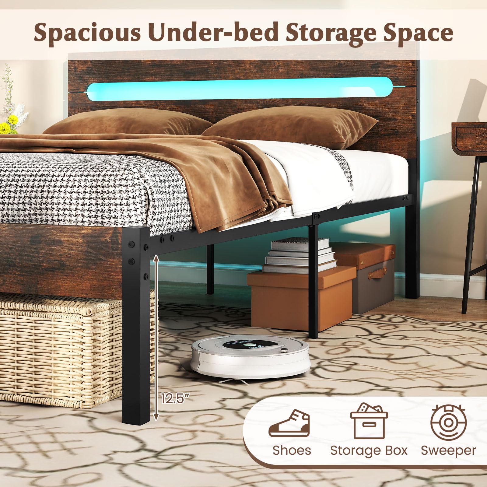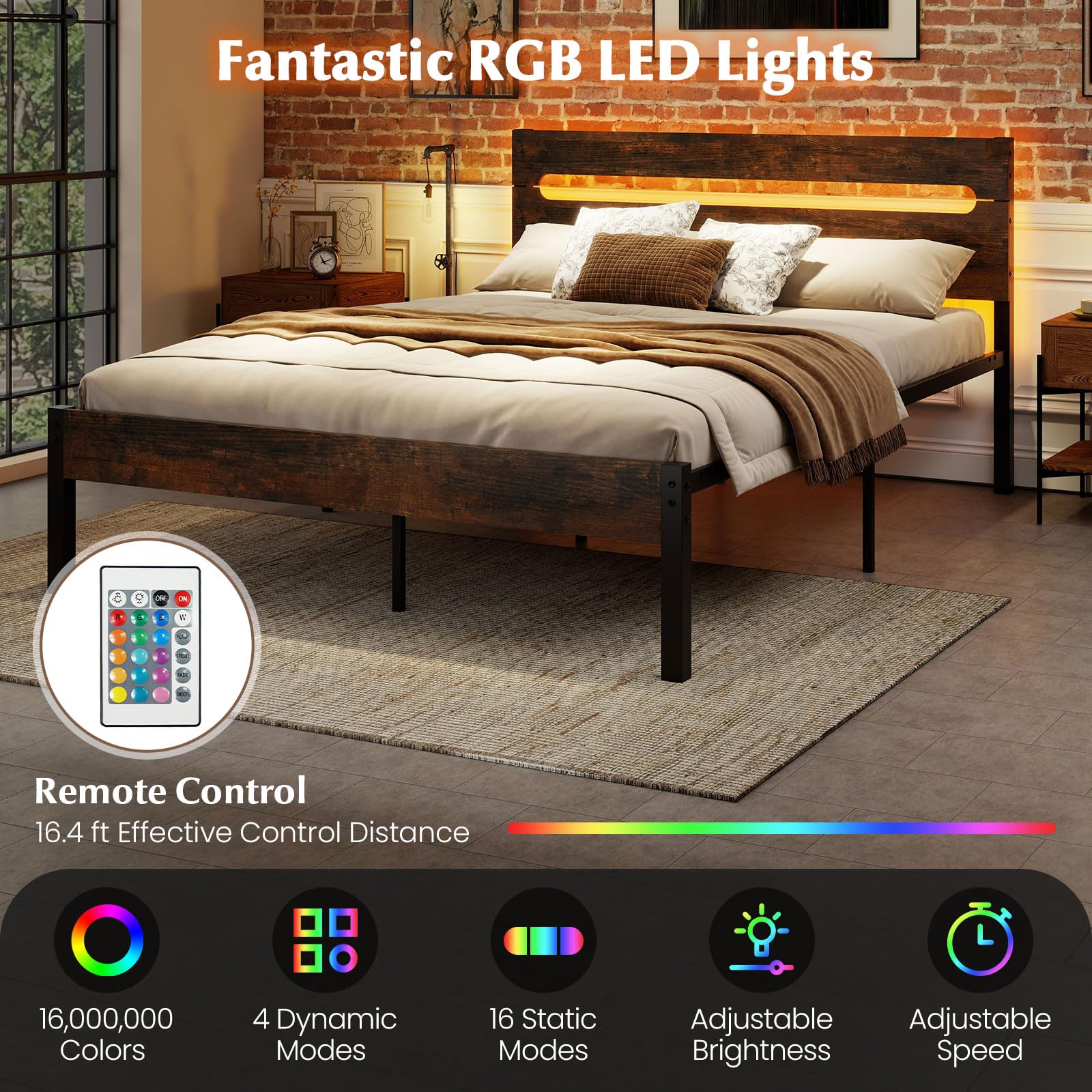 Upgrade your bedroom with this multifunctional full size LED bed frame. Designed with integrated RGB lighting, the bed lets you create a relaxing or vibrant atmosphere with ease. The built-in charging panel offers convenient power access for your everyday devices, while the robust metal structure ensures long-lasting stability. The rustic wood-style headboard adds a warm industrial charm, and the generous under-bed space gives you extra room for storage. Compatible with most full size mattresses, this platform frame requires no box spring and includes a snap-on connection system for simple, tool-free assembly.