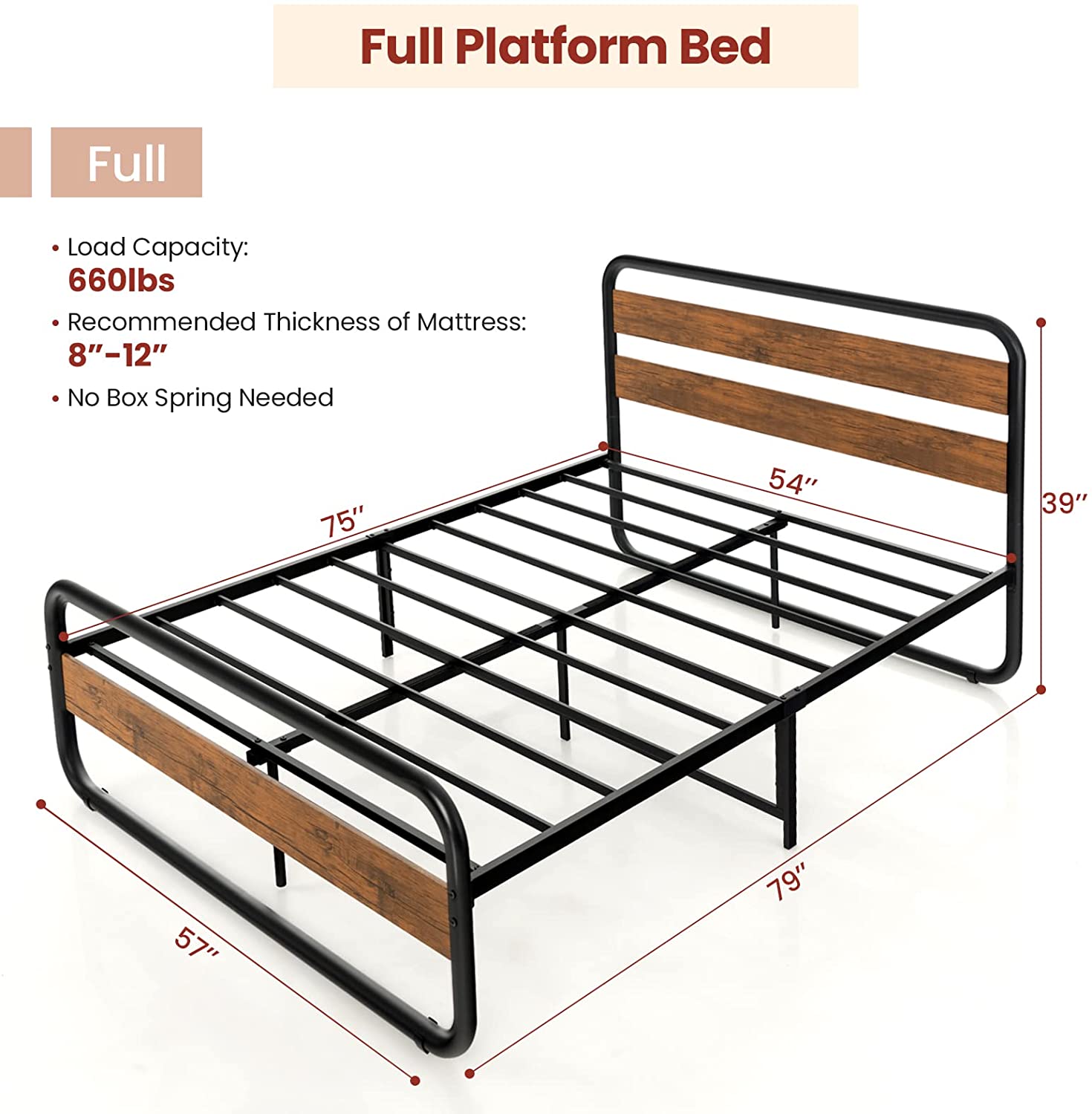 The metal structure has arched corners, which are considered to avoid collisions. Plus, it comes with many metal slats and 5 additional legs, improving the load capacity up to 660lbs. Thanks to the headboard & footboard, you can comfortably lean on the platform bed for reading, napping, or chatting. Also, they're helpful to keep a mattress from sliding. The recommended thickness of a mattress is 8"-12". Moreover, the metal bed offers a 13" clearance, so you're able to store plenty of sundries under the bed and a sweeper is allowed to pass for cleaning. More importantly, EVA pads are offered, which effectively reduce noise when you turn over. Anti-slip foot pads will protect the ground from scratches. Finally, just slightly press each slat and they will be firmly fixed.