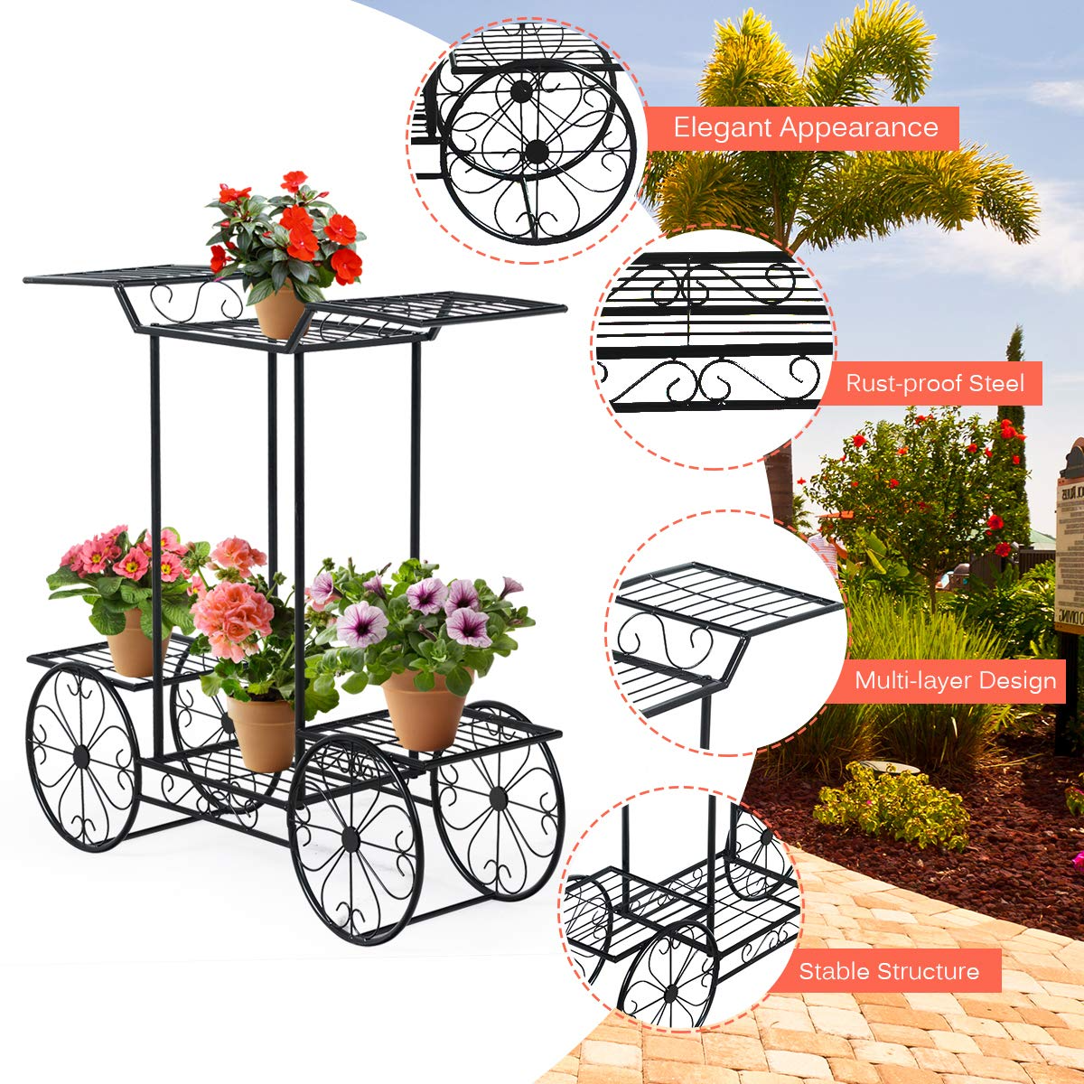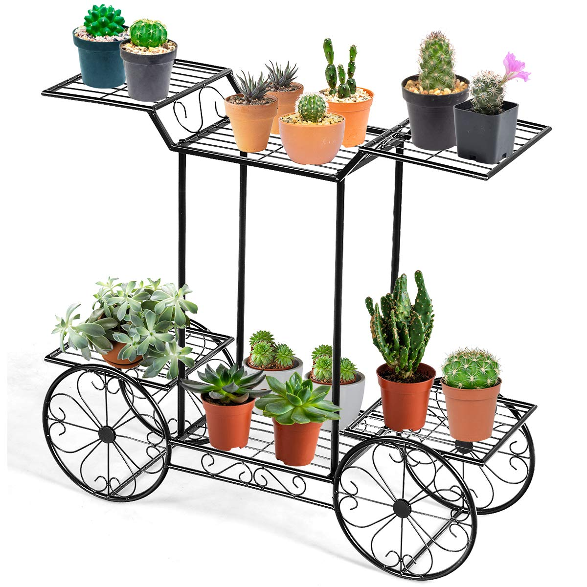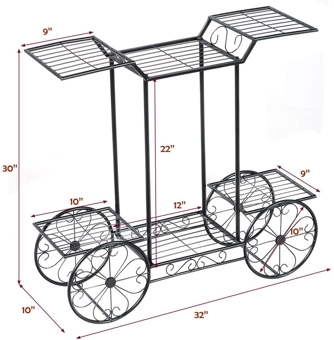 The metal garden cart stand is a good display shelf for you. Made of full-metal structure with powder-coated surface,the metal stand is durable enough to serve for long service life. The Parisian plant stand in the shape of trolley cart has decorative wheels and looks eye-catching. With 6 tier vertical storage design, it provides enough room for lots of differentsizes plants. The hollow design allows excess water to flow down. And the metal stand is not only a flower shelf, but also a storage rack to put a variety of items. Besides, the metal cart plant stand is definitely unique and practical accessory to light up the room!