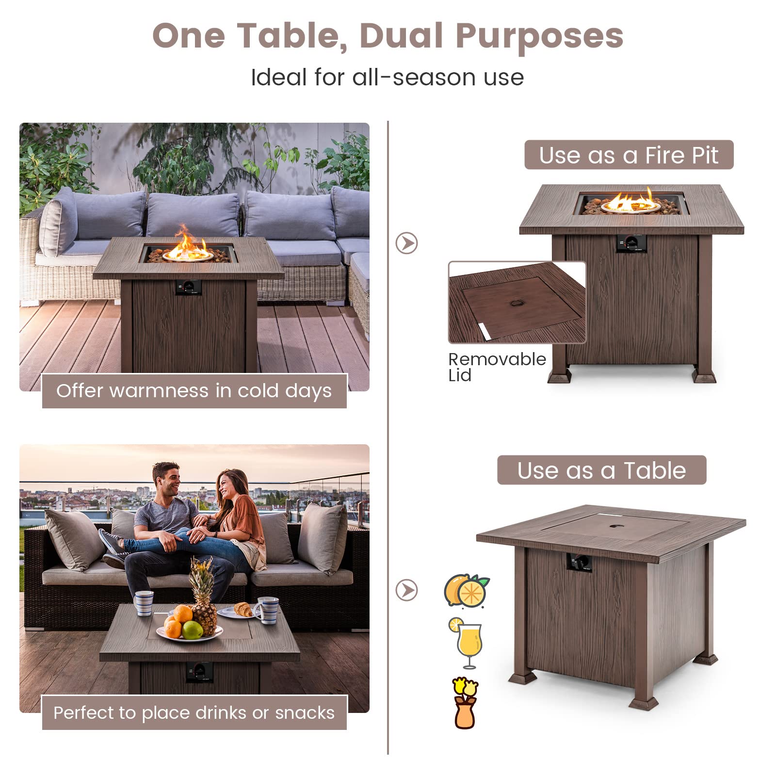 The fire table with 50,000 BTU output creates enough heat for you in cold weather. And you can enjoy the dancing flame during relaxation. Also, the ignition and flame adjustment is super easy with the control knob. When the lid is covered, you can use it as a patio coffee table, which is perfect for placing food and drinks. The whole fire table is of high stability with its reinforced metal construction. And the wood-like surface makes it look elegant and suited for different occasions. Coming with a waterproof and sunproof PVC cover, the fire table will be well-protected when not in use. If you are looking for a functional fire table, please take this 32” propane gas fire table into consideration.