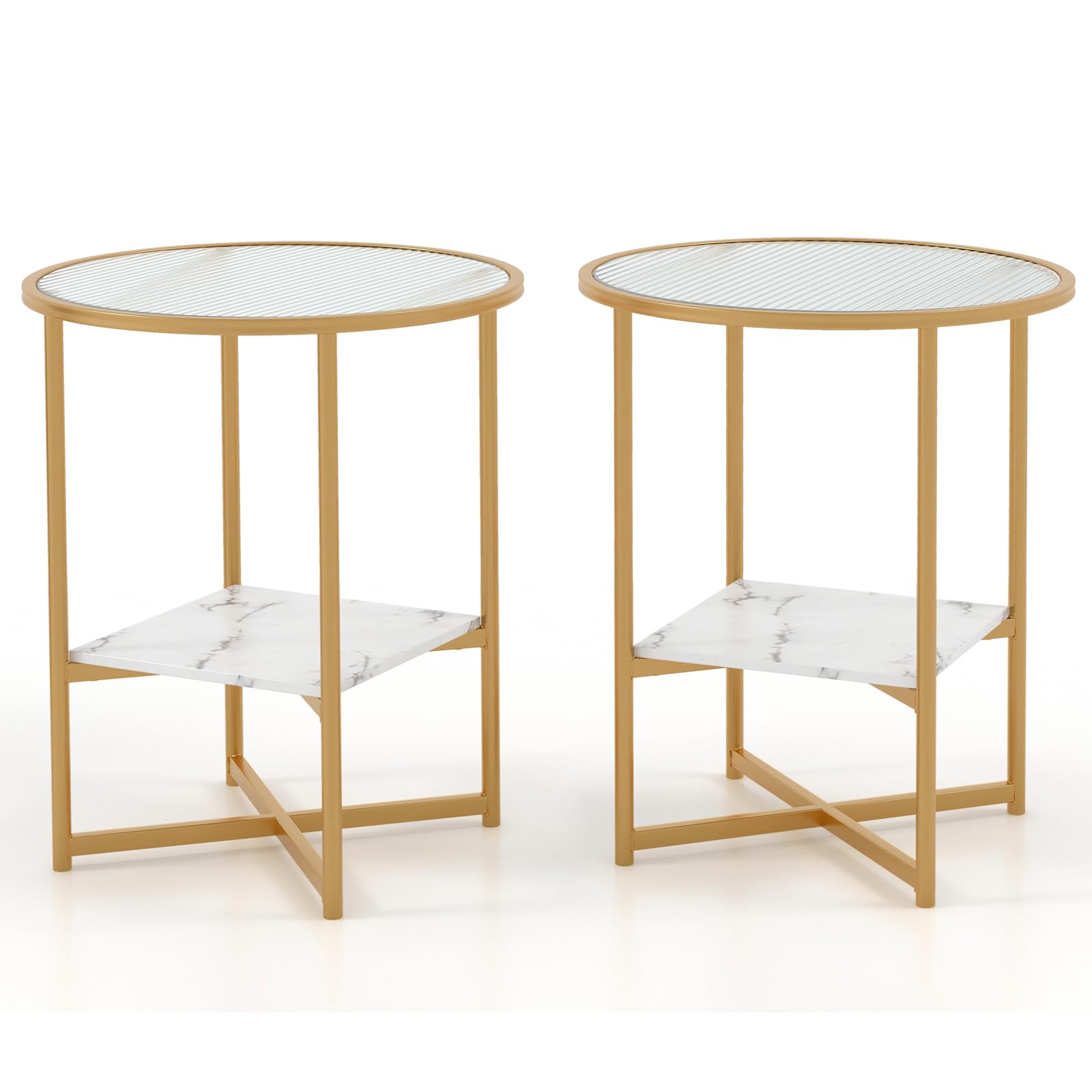 - [Built to Last]: Crafted of wavy tempered glass top, the end tables are resisted to heat, not easy to crack or deform, ensuring longer service life. In addition, powder-coated metal frame and reinforced x-shaped structure provide great support and stability.