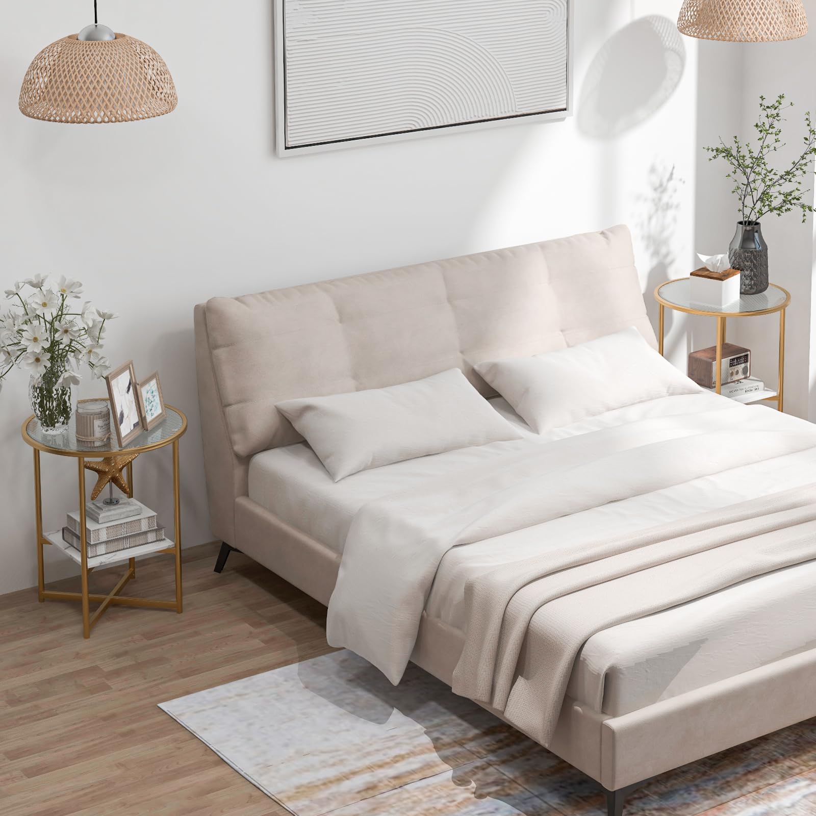 - [2-Tier Storage Space]: Would you like to sit on the bed or sofa to read a book or have snacks? The side tables come with 20" diameter round tabletop to fulfill the needs of storage and display. The lower shelf provides extra storage space for daily items.