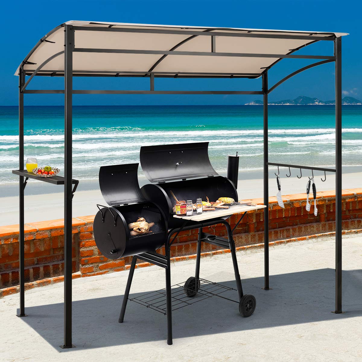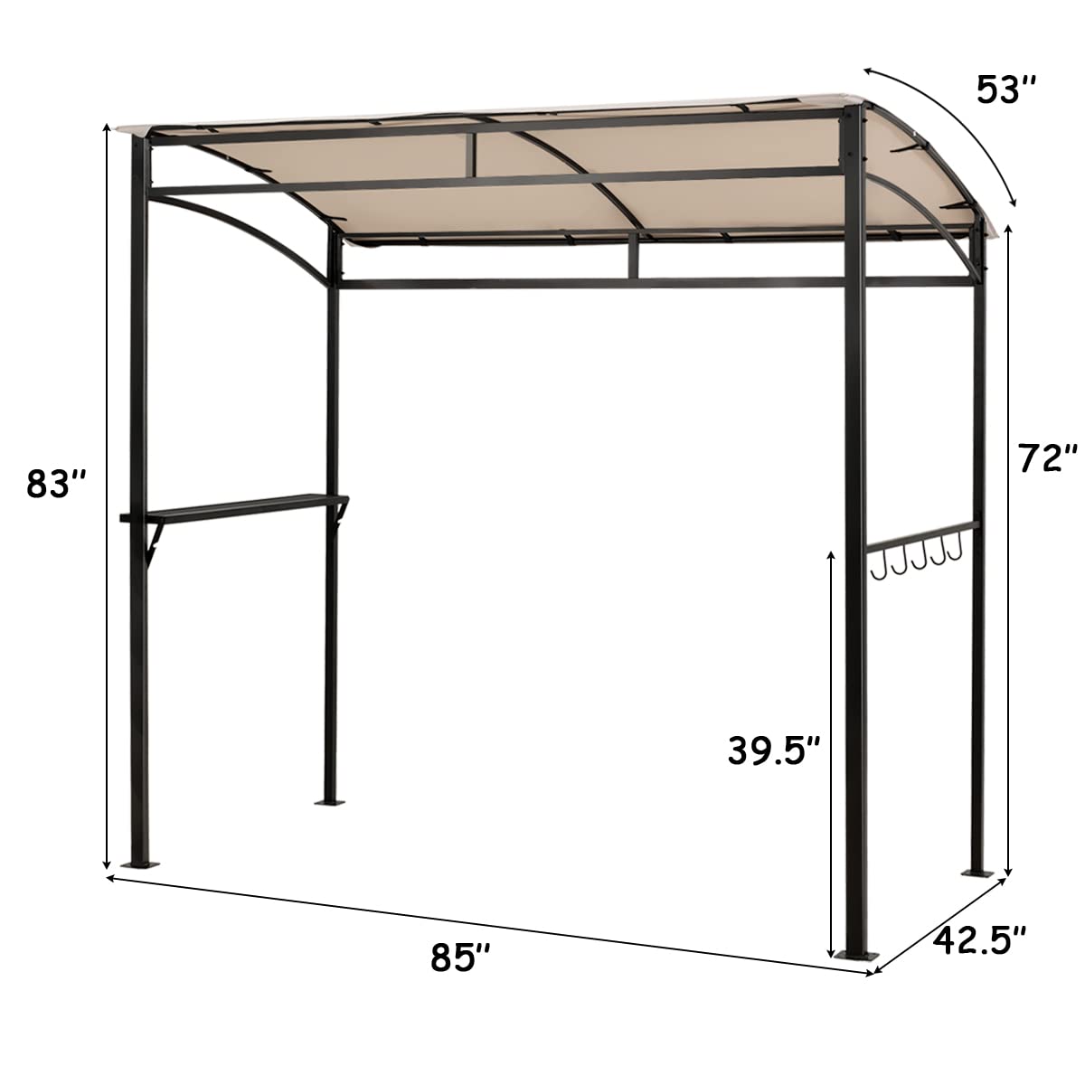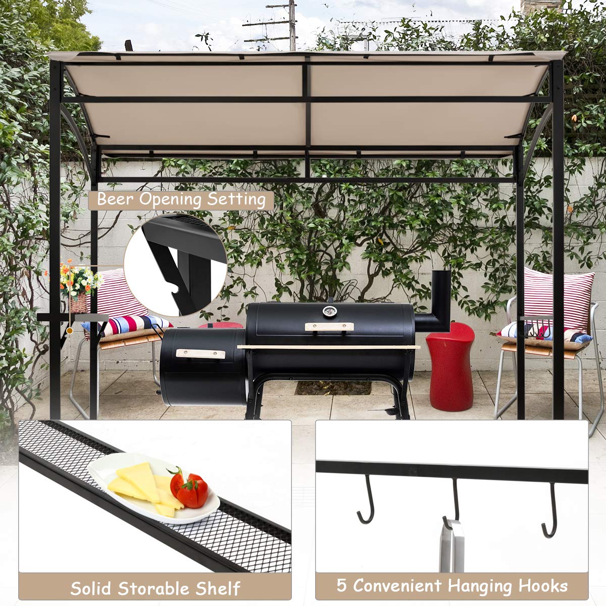 - Storage Shelf & 5 Utensil Hooks: Equipped with an extra metal shelf, the grill gazebo provides enough space to place kinds of items for convenient use, such as grill accessories, tableware, beverages, food, etc. Besides, it also includes five hooks for hanging tools. And the small notch on the shelf can help you open the beer.