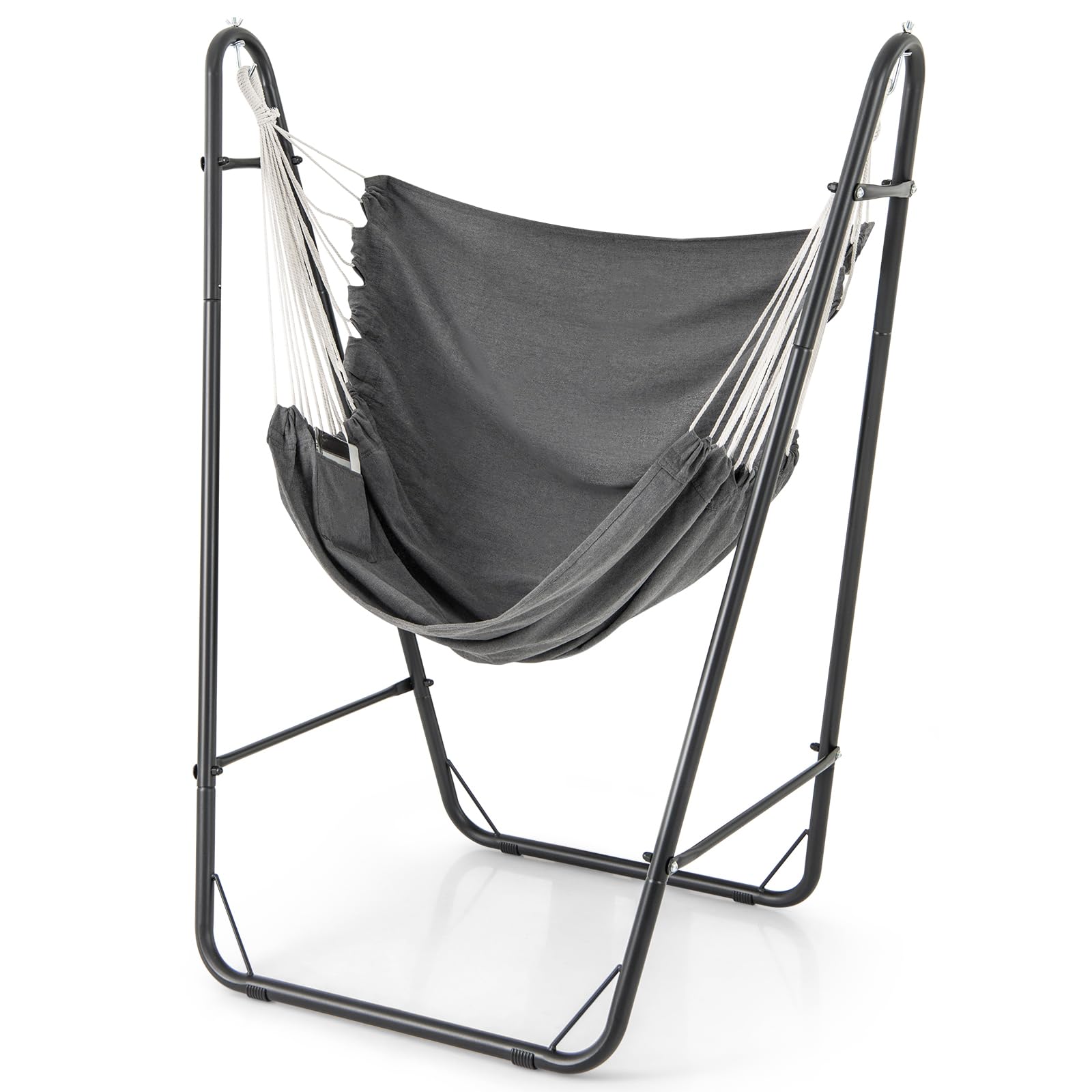 Crafted from skin-friendly fabric, this hanging chair offers a comfortable spot for your leisure time. Comfort meets convenience with the addition of a side storage pocket, allowing you to keep your essentials within easy reach. The heavy-duty metal stand ensures sturdiness and security while you relax. Easy to hang with hanging hooks and rope thimbles, this swing chair is a versatile addition to any living room, bedroom, patio, or yard. Whether you prefer to lounge indoors or soak up the sun outdoors, this hammock chair is a brilliant perfect choice.