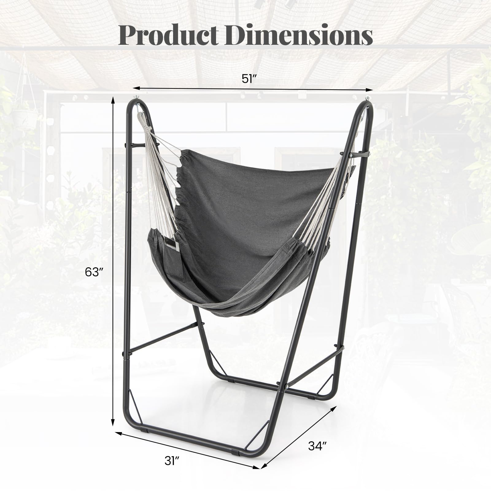- [Heavy Duty Metal Stand]: Supported by a robust metal stand, this hammock chair ensures exceptional sturdiness and reliability. Reinforced with crossbars, triangular structures, and anti-slip foot pads for enhanced stability and peace of mind.