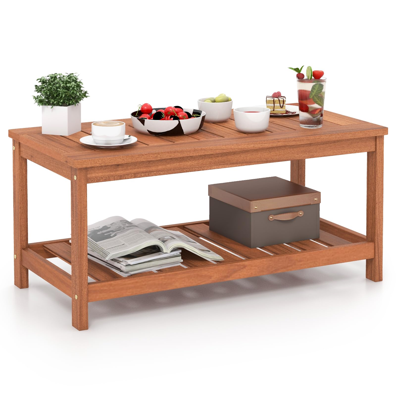 Enjoy wonderful leisure time and enhance the aesthetics of your home with this patio coffee table. Crafted of sturdy hardwood material, the coffee table enhances impeccable strength and stability for long-term use. Wide tabletop and bottom shelf provide ample storage and display space for items, which can easily accessible as well. Showcasing clean lines and natural appearance, this outdoor center table adds highlight to various pales, such as backyard, garden, poolside, and living room.