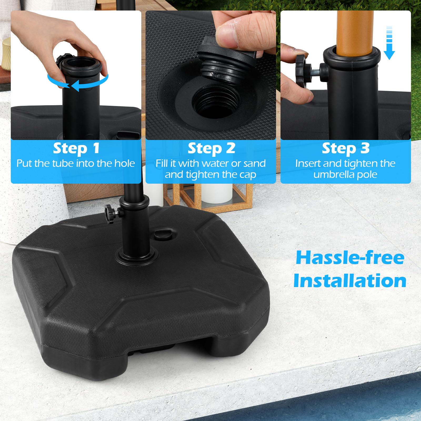 Keep your patio umbrella stable and secure with this fillable umbrella base. Designed with a high-capacity reservoir, it can be filled with up to 38.5 lbs of water, 66 lbs of sand, or 88 lbs of a water-sand mix for enhanced stability in breezy conditions. Built from durable, weather-resistant HDPE, this base resists fading, cracking, and wear, making it ideal for year-round outdoor use. Non-slip pads provide added grip, while the built-in handle ensures easy portability. Compatible with most 6–8 ft patio or market umbrellas, it fits umbrella poles 1.5"-1.9" in diameter. Simple, tool-free assembly lets you get set up in minutes.