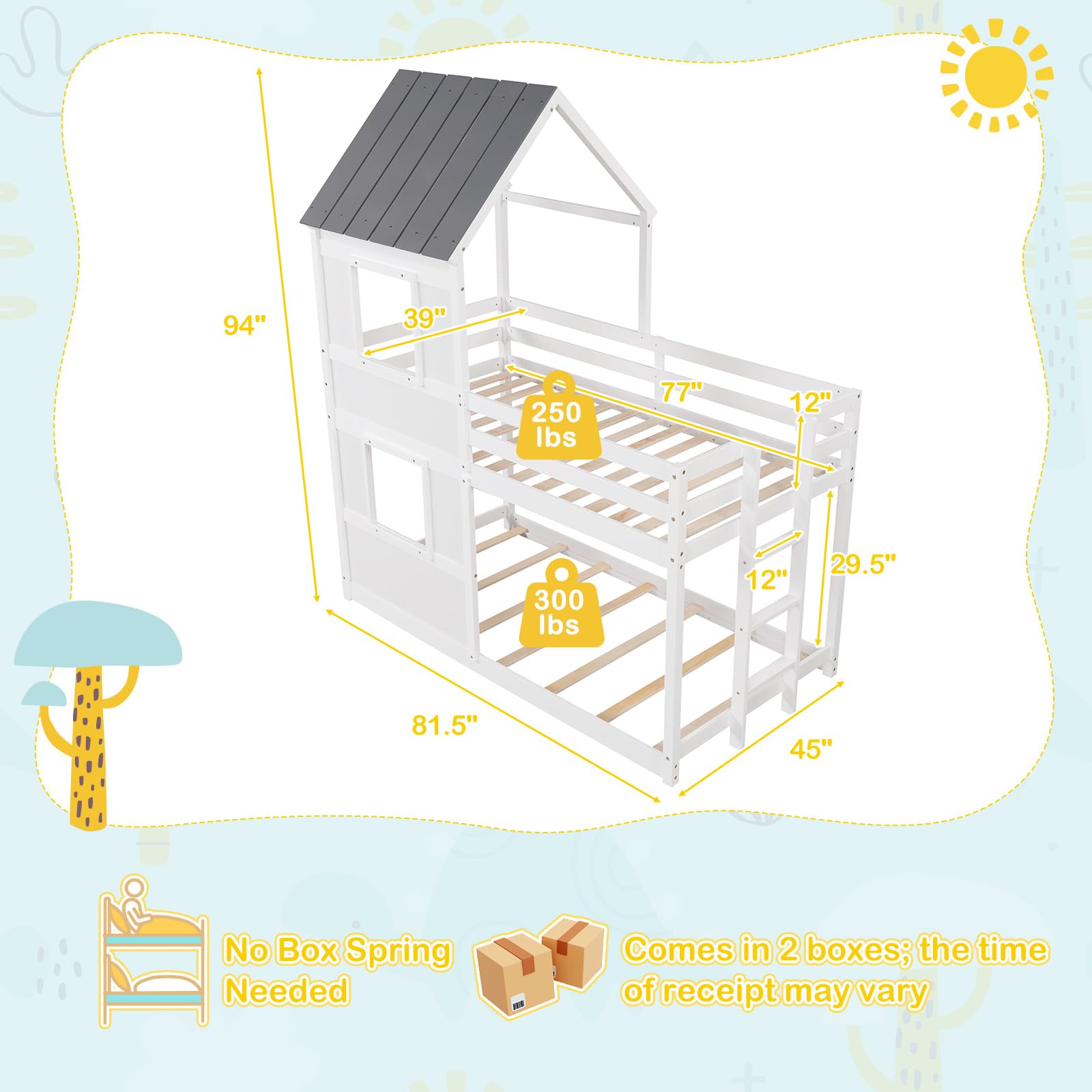 Transform bedtime into dream time! Step into a world of enchantment with this stunning, house-shaped bunk bed that’s every child’s fantasy! Turn your kiddo’s room into a captivating haven adorned with a mini rooftop, delightful windows, and ample room for personal touches like fairy lights or vibrant banners. Crafted from sturdy pine and power-packed with 21 sturdy slats in total, this house bed is built to reassure you with unconditional safety and top-notch durability. Wave goodbye to bedtime woes with a full-length guardrail and an easy-to-climb ladder. Plus, it’s designed smartly to save space, no box springs needed! Making the most out of compact spaces while bringing boundless joy and creativity to your child’s personal sanctuary! Charm up your child’s nightly adventures!