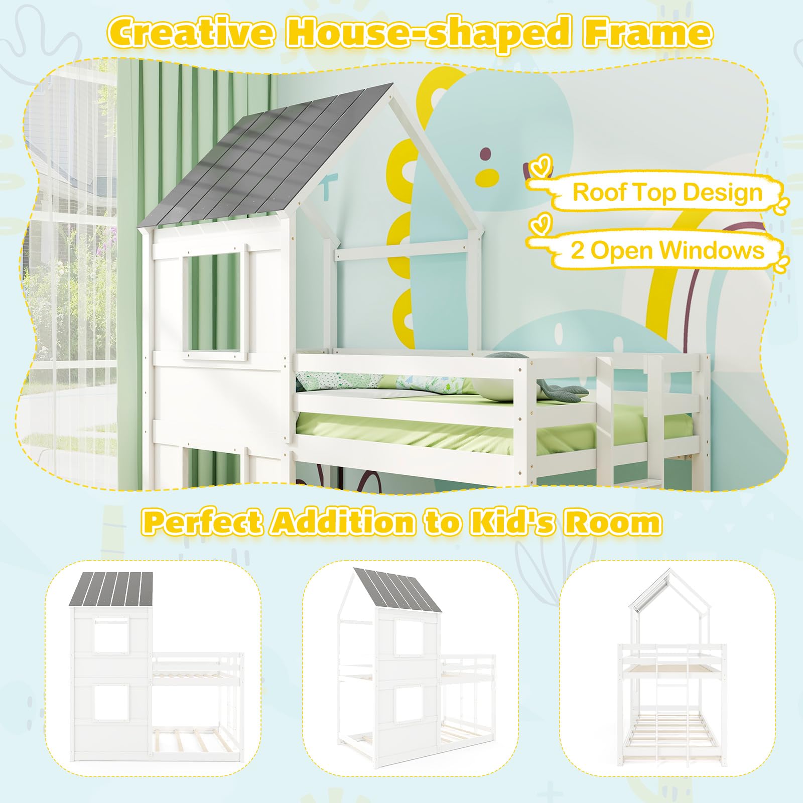 Roof top design with 2 open windows makes the perfect addition to kid’s room