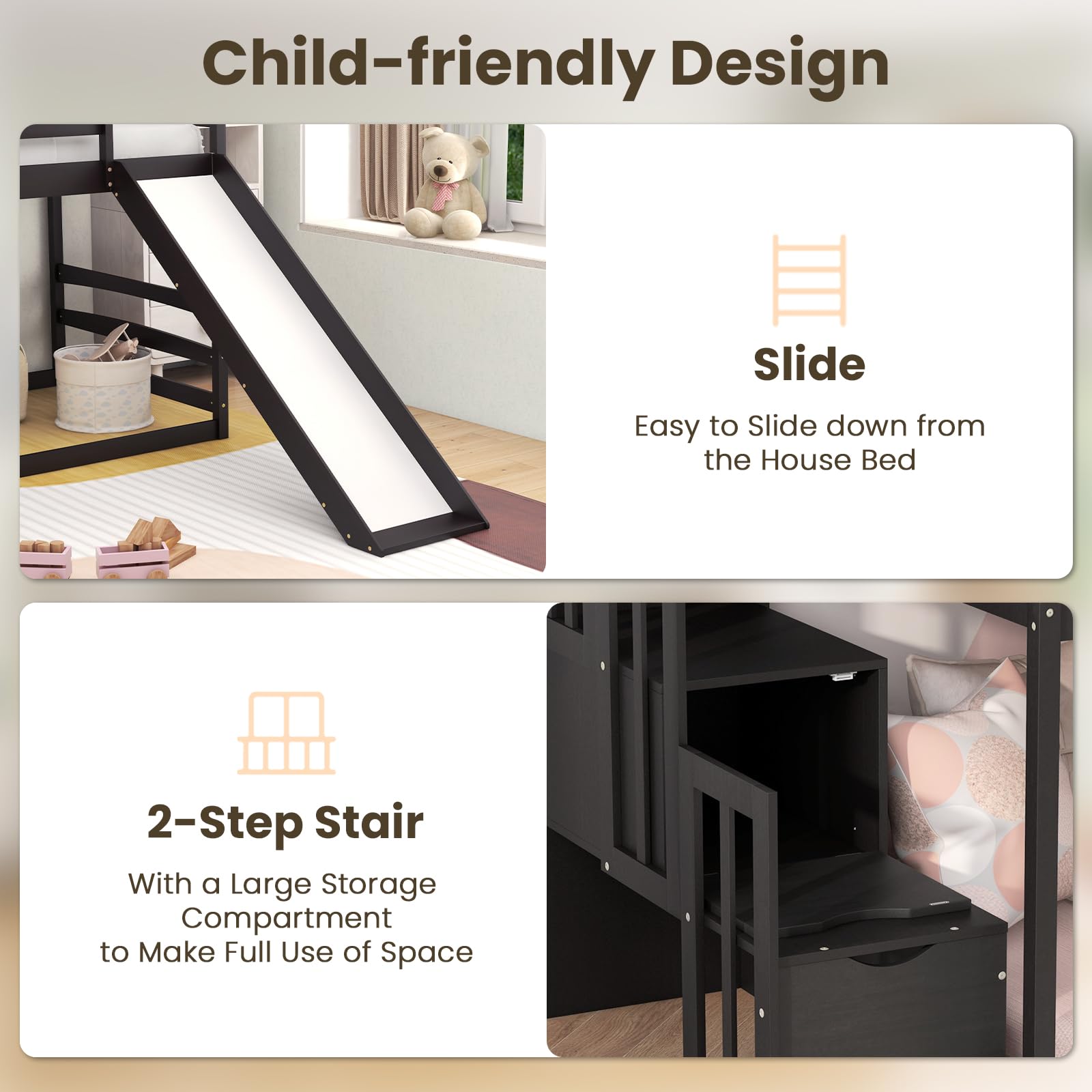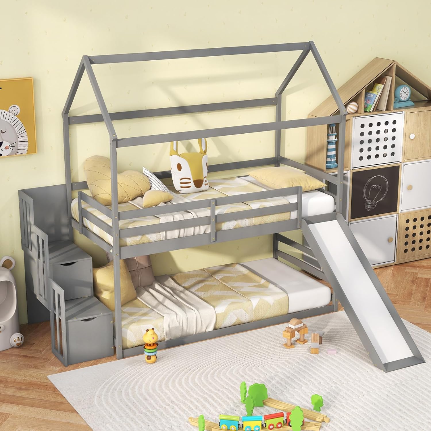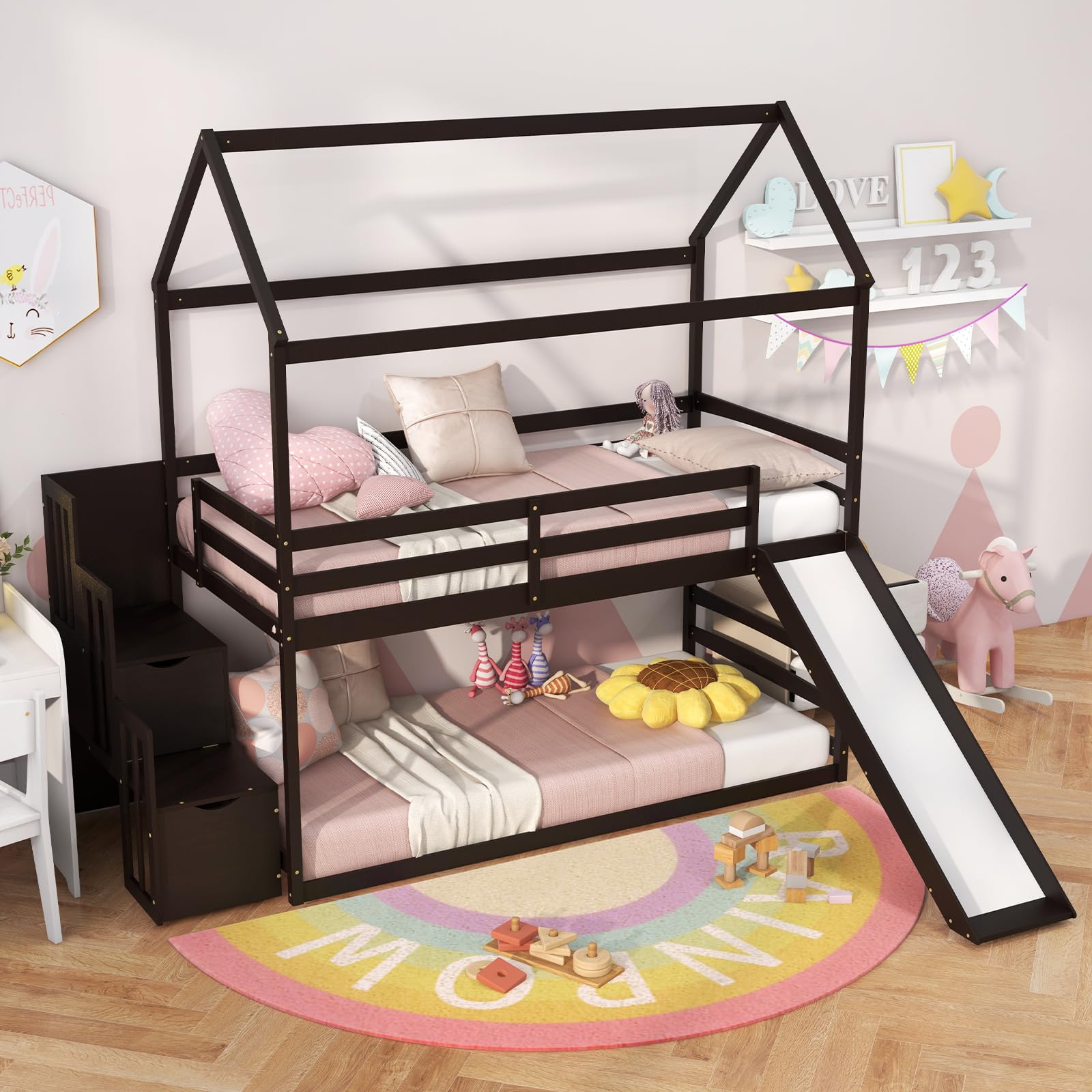 - [Space-Saving Storage Staircase]: Unleash the power of organization with a space-saving storage staircase built right into the 2-tier house bed. Say hello to a clutter-free room as your child’s toys, books, and belongings find their perfect place!
