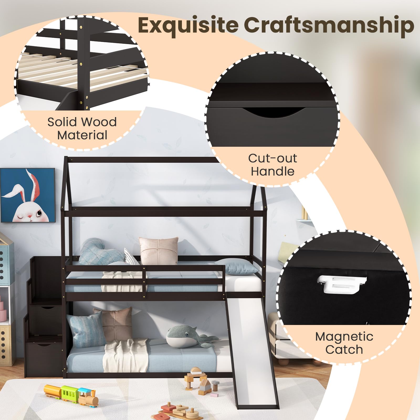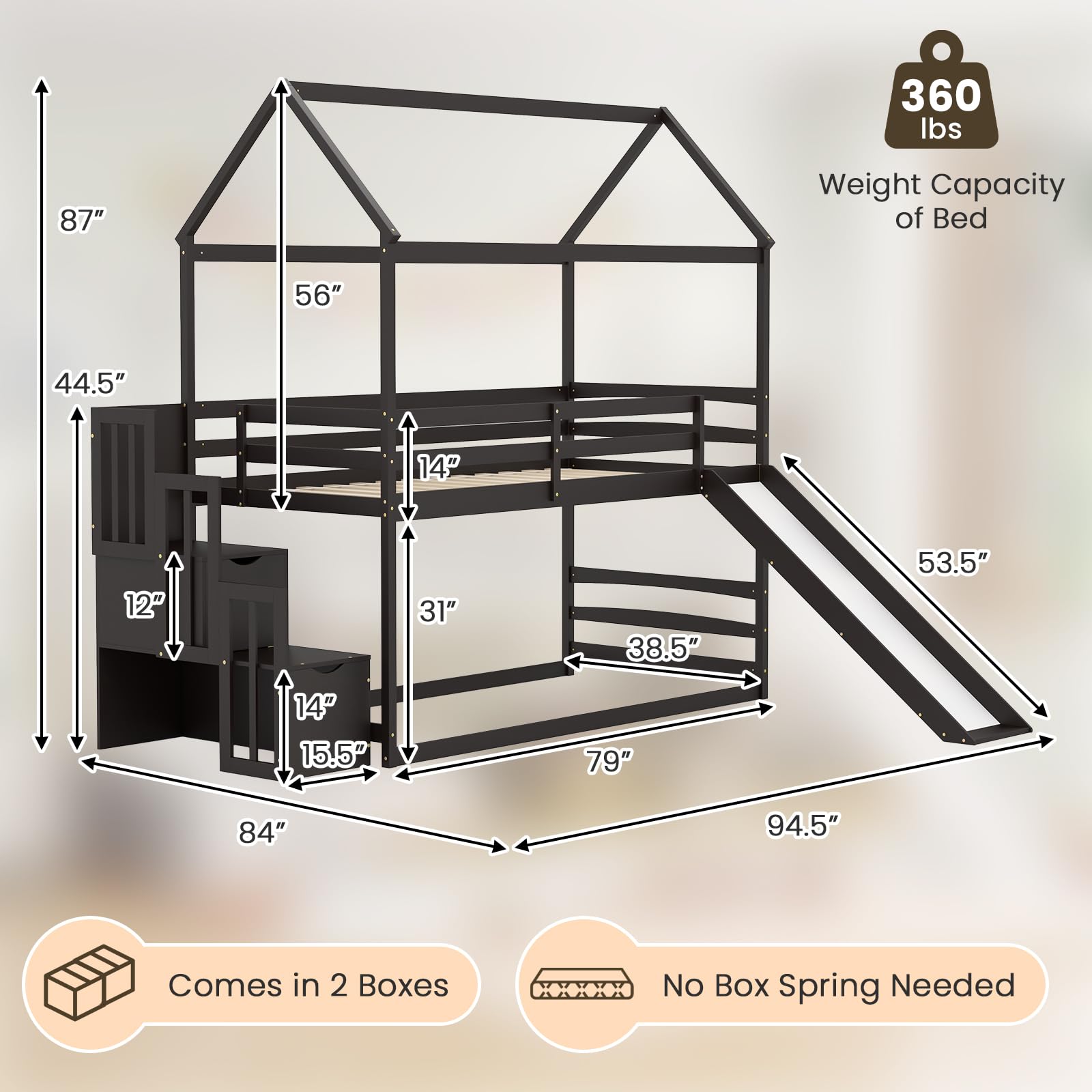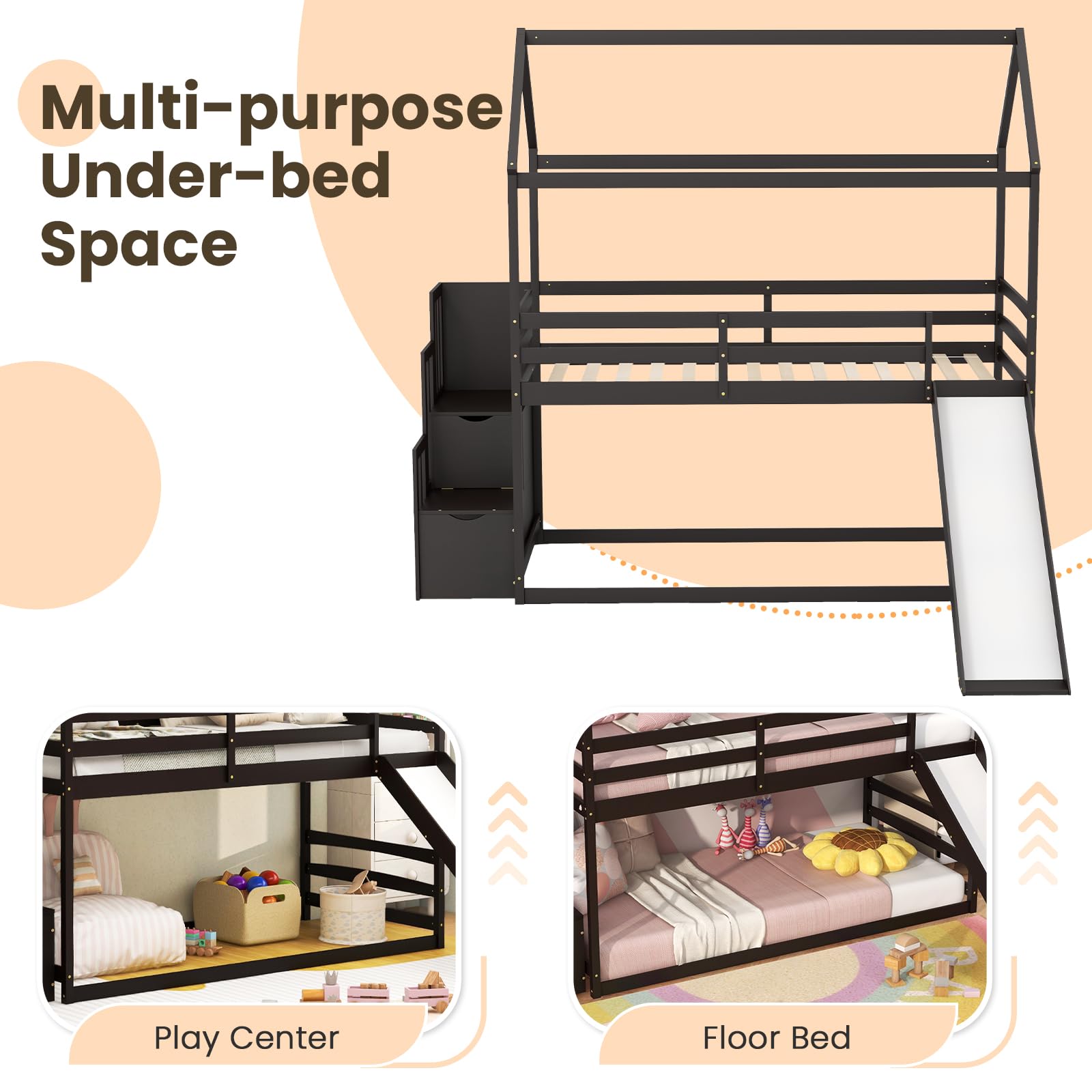- [Space-Saving Storage Staircase]: Unleash the power of organization with a space-saving storage staircase built right into the 2-tier house bed. Say hello to a clutter-free room as your child’s toys, books, and belongings find their perfect place!