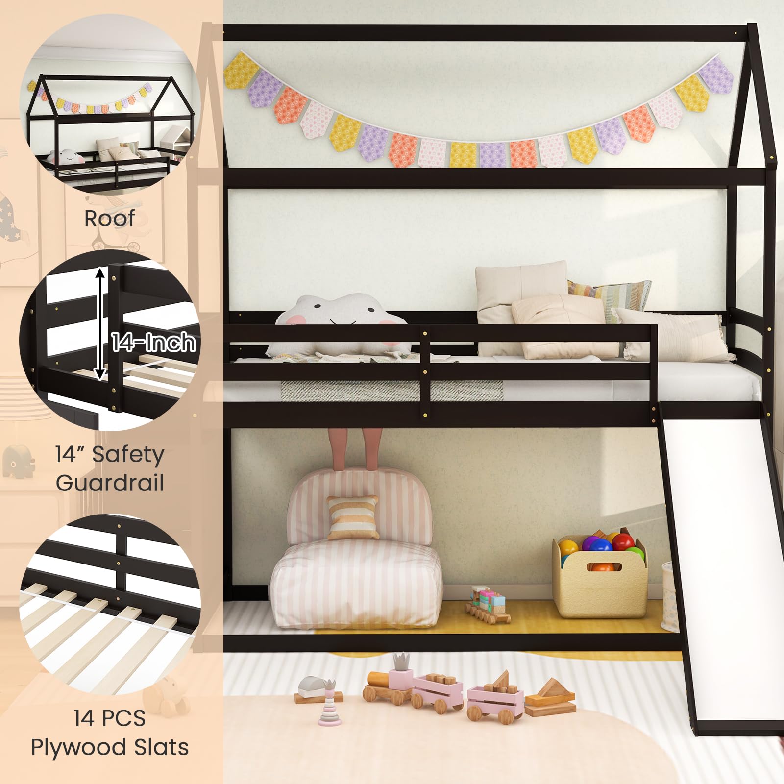 Transform your child’s room into a magical haven with our enchanting roofed loft bed! This loft bed with roof is more than just a place to sleep - it’s a canvas for your child’s imagination to run wild. But the fun doesn’t stop there! The house bed comes complete with a thrilling slide, turning bedtime into an adventure your little ones will eagerly anticipate. Plus, the 2-step stair cleverly saves space while keeping toys, books, and belongings organized. Crafted with solid wood material, safe and sturdy house loft bed guarantees a peaceful night’s sleep. The 14 pcs plywood slats form a rock solid platform, no box spring needed. With its versatile under-bed space, the possibilities are boundless. Create a play center, a storage hub, or even a cozy floor bed as your child’s needs evolve, guaranteeing years of excitement and fun. Don’t miss out on this magical addition to your child’s room!
