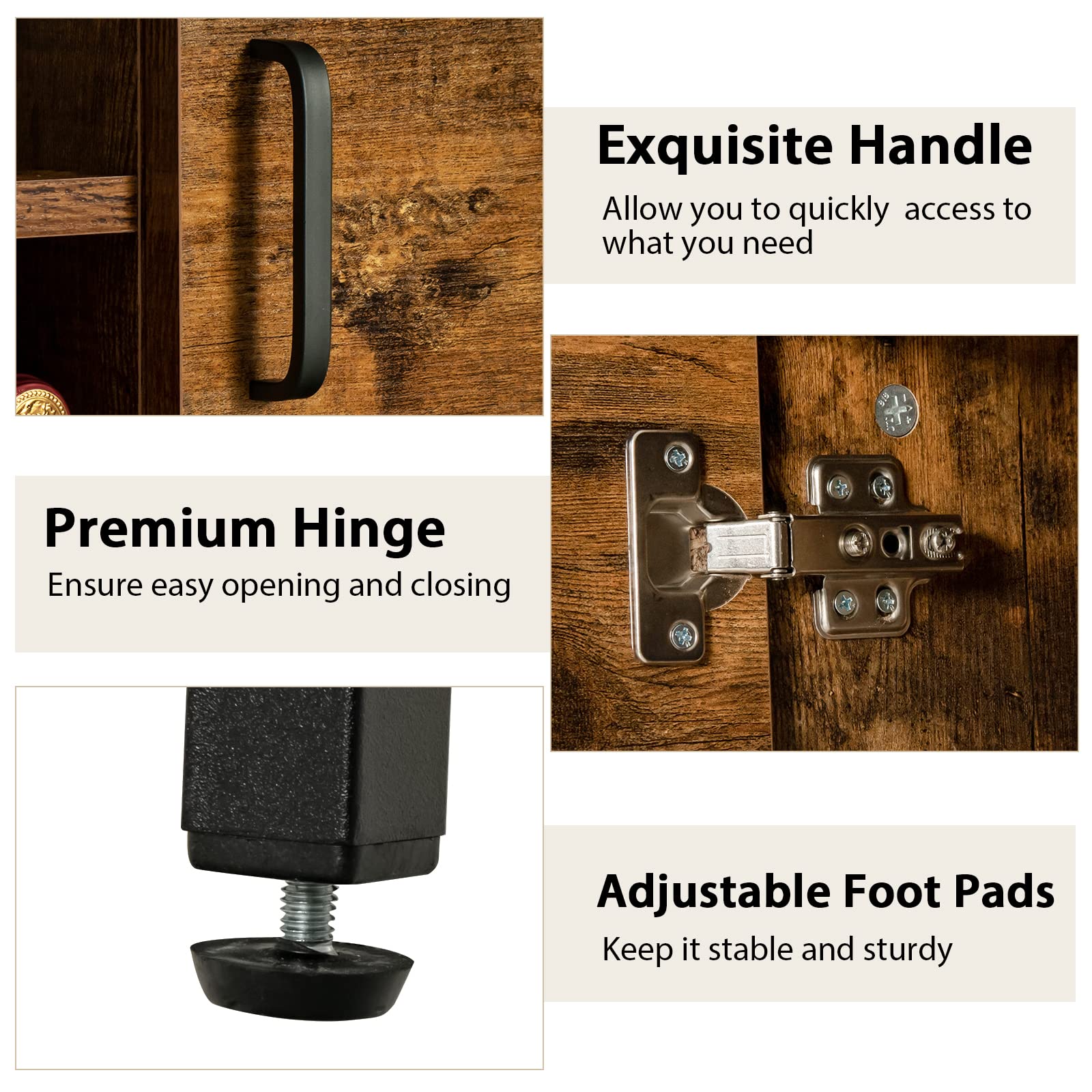 This multifunctional cupboard will be an ideal storage solution for you and your family. You can use it as your sideboard, cupboard or console table according to your different needs. It has enough storage space, including wide countertop, open shelf, 8-bottle wine rack, 2 door cabinets and bottom metal mesh shelf. Thus, you can freely place your wine, fruit, glass, spine jar or tableware on our storage organizer. Besides, 2 doors with handy handles also bring much convenience. And the steel hinges make the doors easy to open or close. Constructed by superior materials, this cupboard with solid steel frame can serve you and your family for years. Additionally, adjustable foot pads also increase its overall stability.