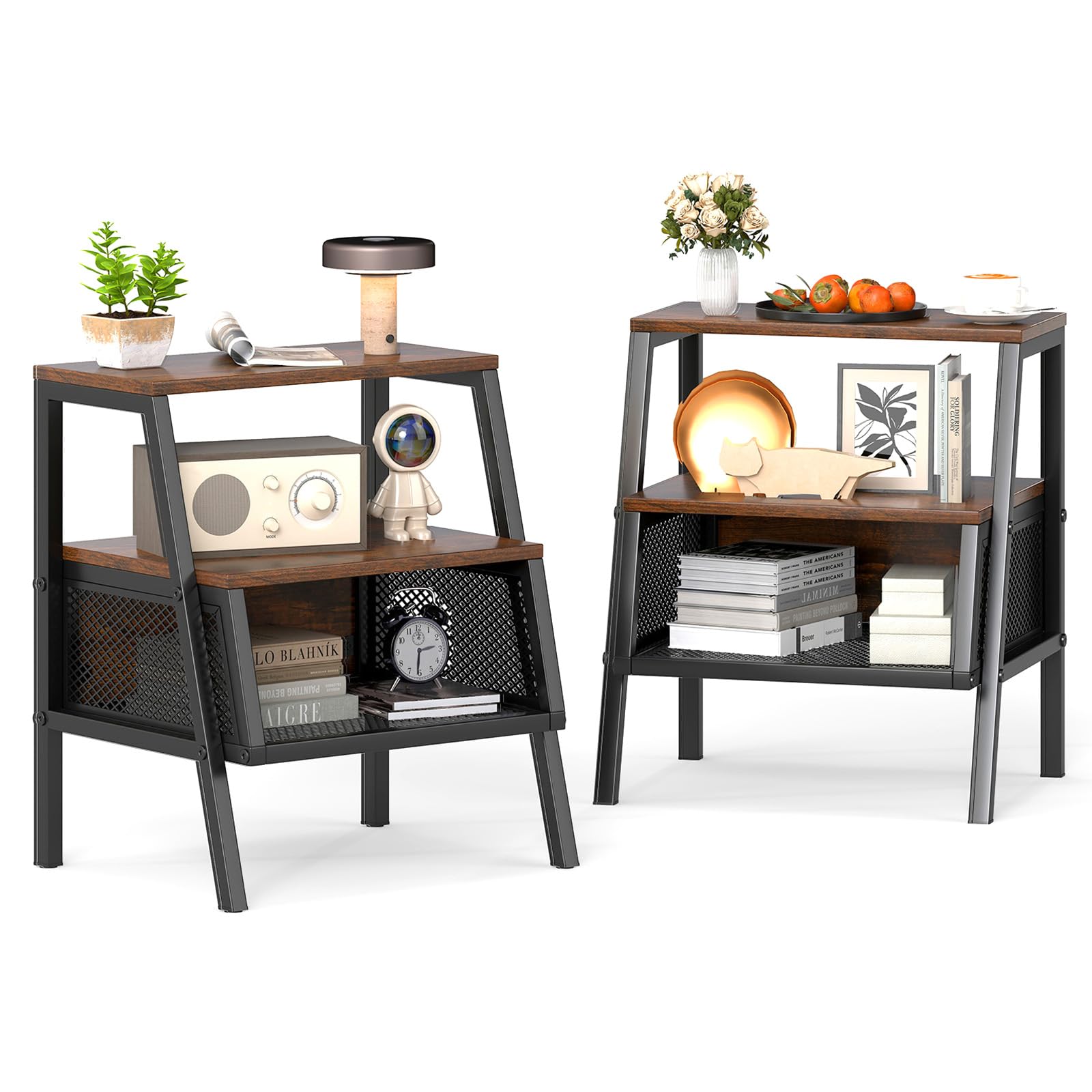 Featuring a 3-tier design, this end table provides accessible storage and display options for books, decorations and other items. The ventilated metal mesh shelf enhances airflow around stored items. Finished in a rustic brown wood grain, the surface brings warmth and texture to any living room or bedroom, complementing a variety of interior styles. In addition, constructed from a sturdy trapezoidal metal frame and equipped with adjustable foot pads, this bedside table maintains strength while ensuring stability on uneven floors.