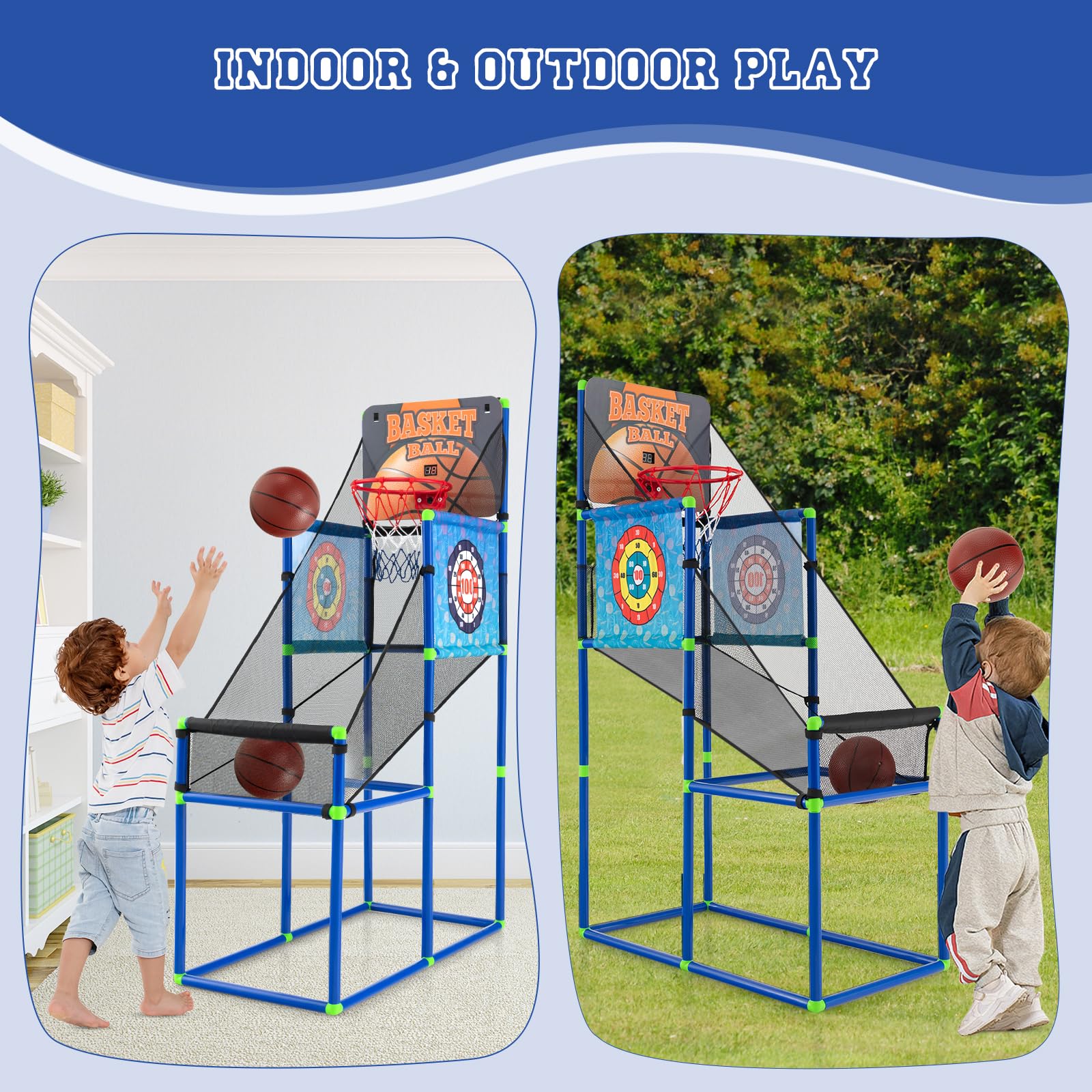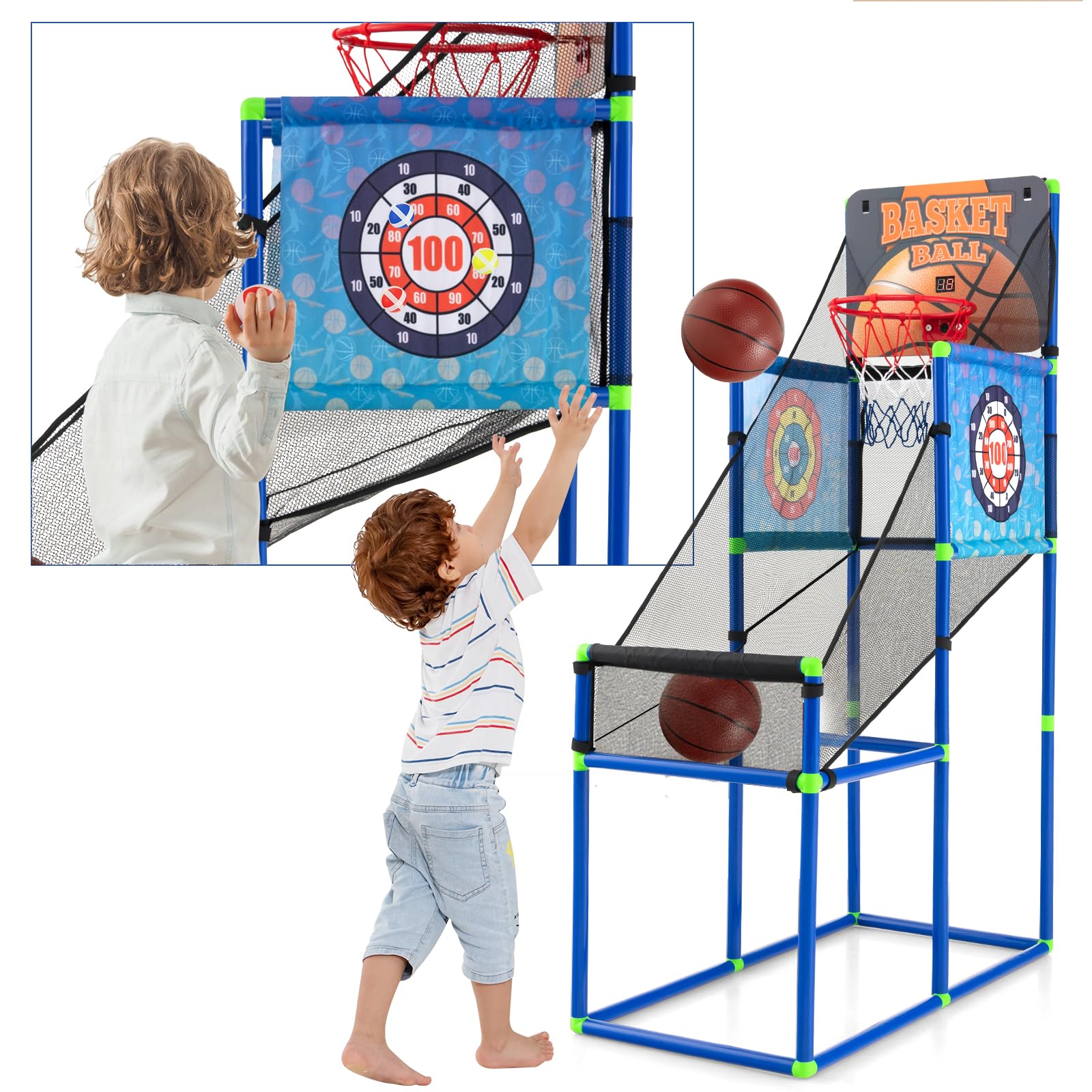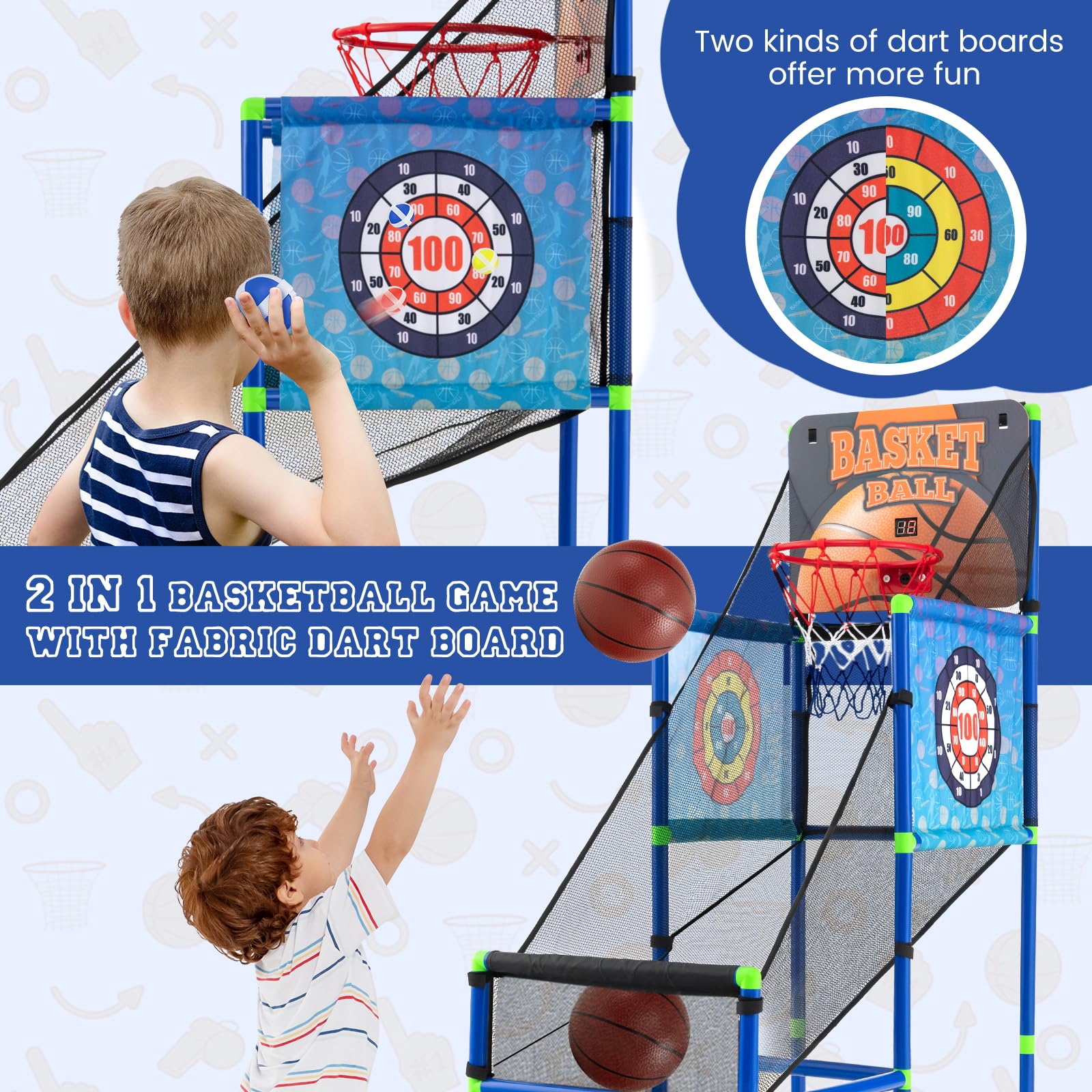 - [2-in-1 Multifunctional Design]: This 2 in 1 basketball game with fabric dart board provides you with double the fun: the basketball arcade game and the sticky balls game. Plus, 2 dart boards with different patterns ensure endless entertainment for your little ones.