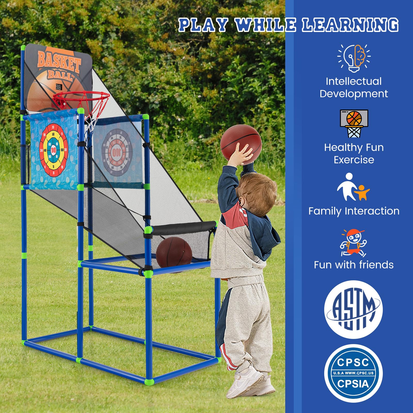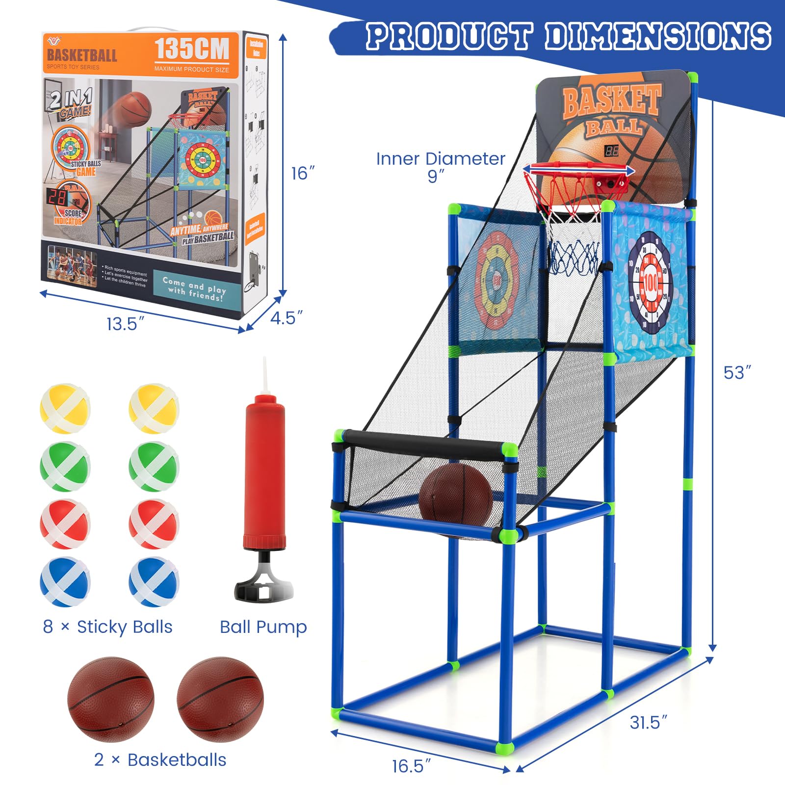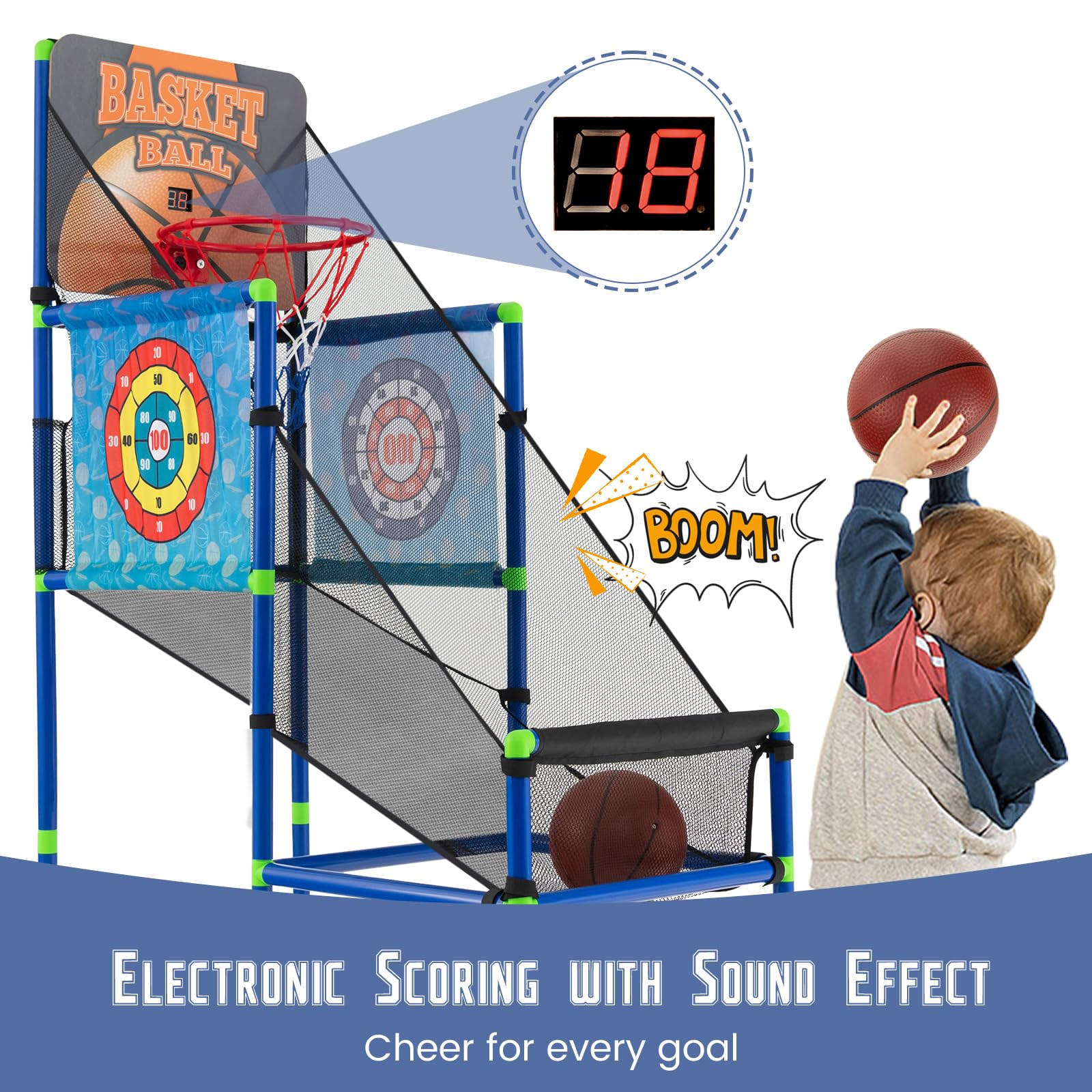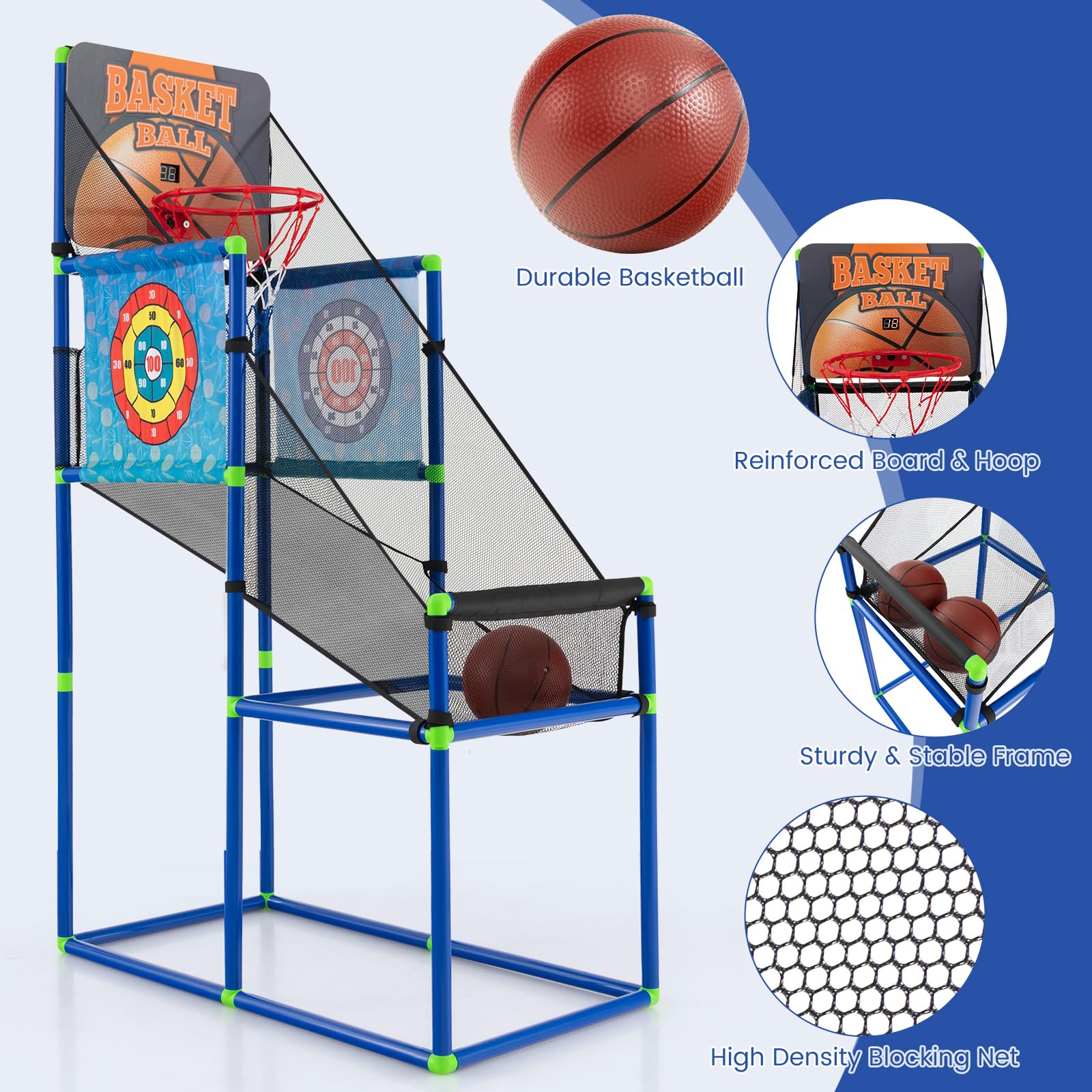 - [2-in-1 Multifunctional Design]: This 2 in 1 basketball game with fabric dart board provides you with double the fun: the basketball arcade game and the sticky balls game. Plus, 2 dart boards with different patterns ensure endless entertainment for your little ones.