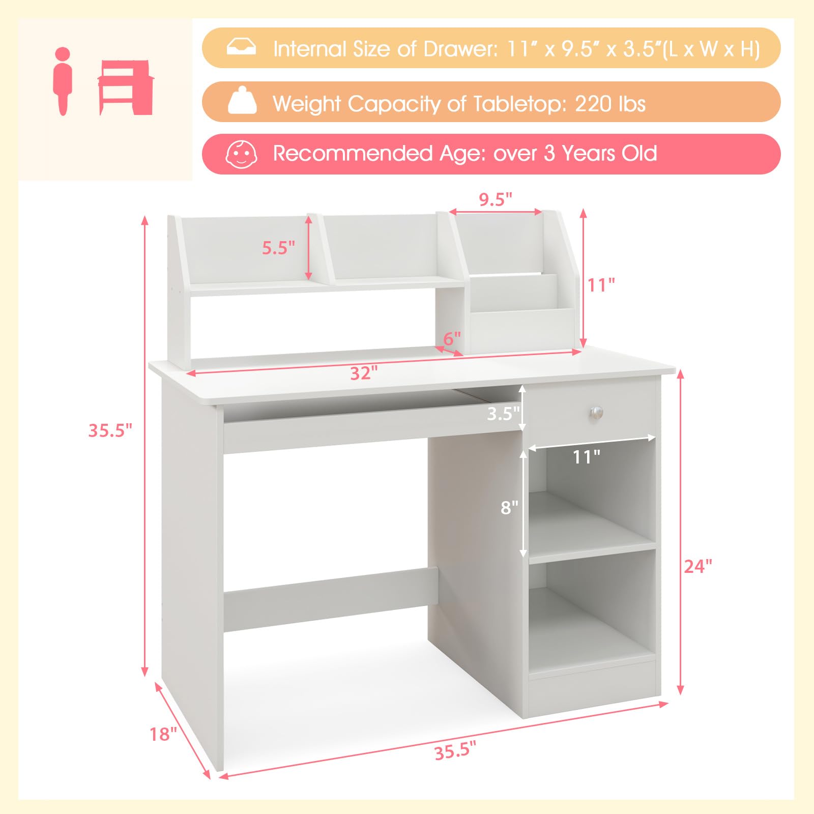 - Ideal for Compact Spaces: Measuring 35.5" x 18" x 35.5" (L x W x H), this kids' home desk with storage is perfect for small spaces like dorm rooms, studies, and bedrooms. Its space-saving design maximizes utilization, making it a cost-effective option for limited spaces.