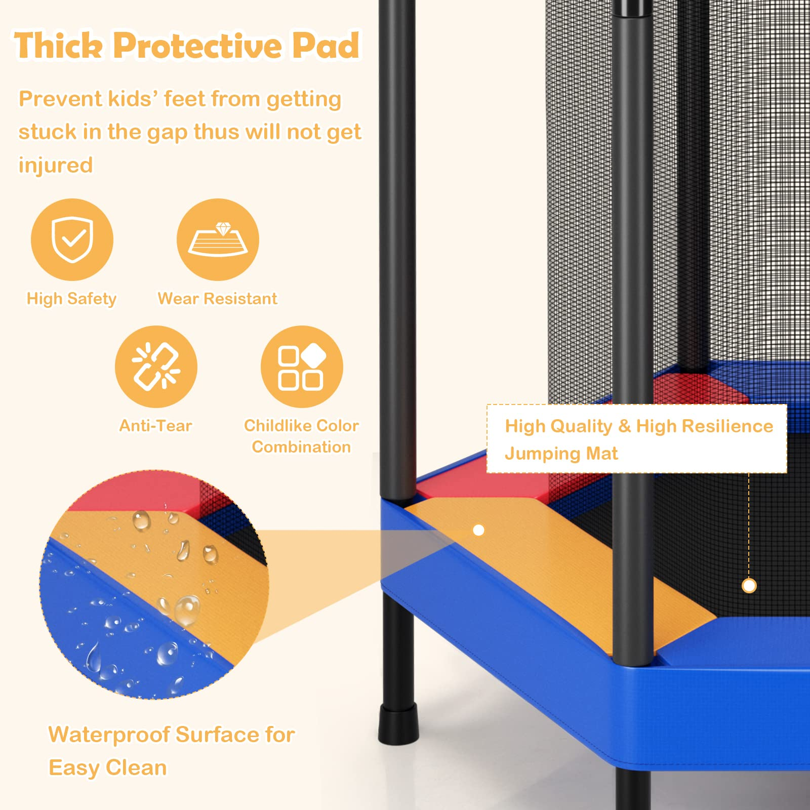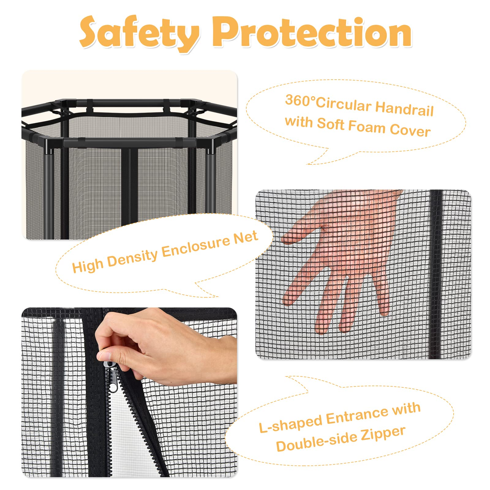 - 360° Enclosure Protection Net: The seamless design between the enclosure net and the jump mat can prevent kids from getting stuck in the gap and ensure their safety during playing. Besides, the soft foam-covered handrail provides 360° protection for children and allows them to grasp it easily to control the bounce.