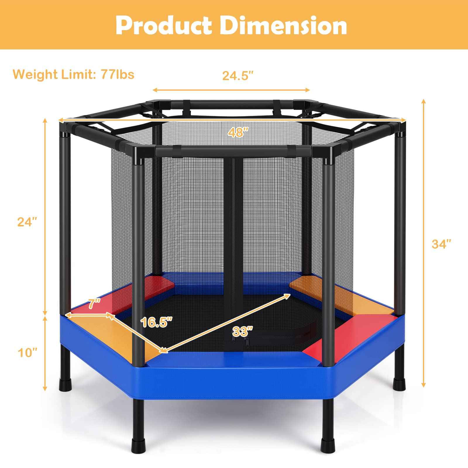 - Heavy Duty Steel Construction: Made of thickened steel tubes with an anti-rust powder-coated surface, this hexagonal toddler trampoline is durable and stable enough to support long-lasting use. Besides, the legs are equipped with non-slip foot pads to prevent your floor from scratching while enhancing overall stability.