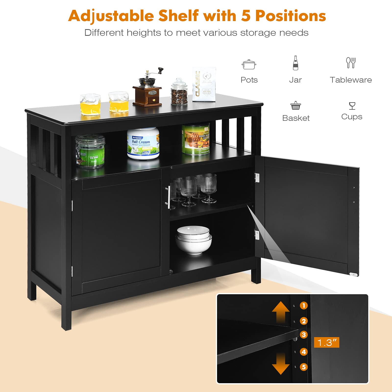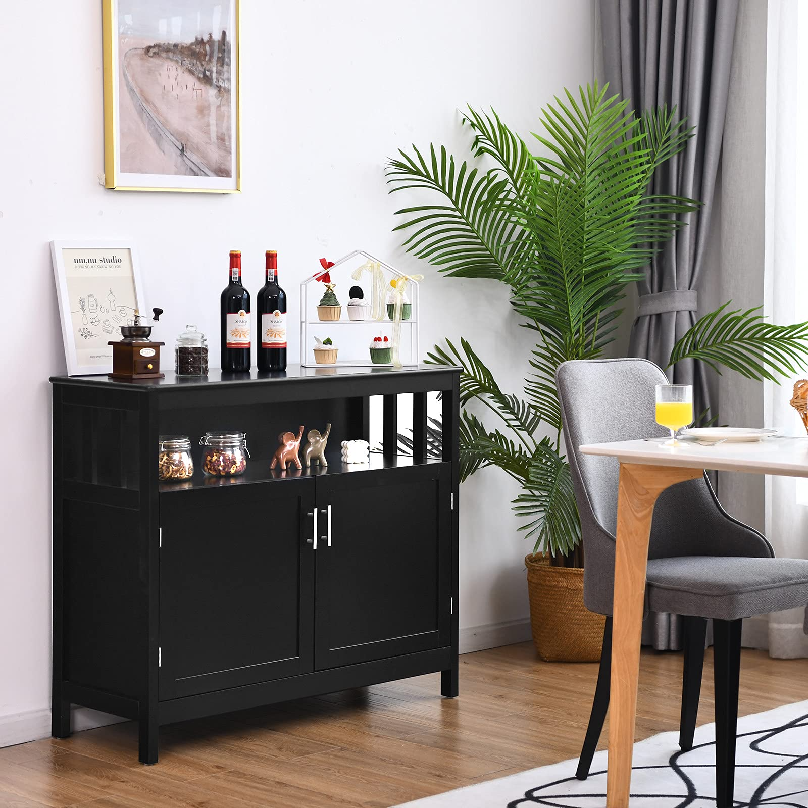 Are you looking for buffet sideboard storage cabinet that can make your home tidy and help you save space? Our kitchen console table with rich storage capacity is your ideal choice. The cabinet has a spacious tabletop, an open shelf and an enclosed cabinet to organize your messy supplies and keep your home cleaner. There is a 5-position adjustable storage shelf inside the cabinet, designed to help you store items with different sizes. 2-Door cabinet with humanized metal handle combines with the storage security with practical convenience. More, made of high quality MDF, it is sturdy and durable enough for long-lasting service life. The modern appearance and elegant design makes it perfect for kitchen, dining room and living room as a sideboard buffet and console table.