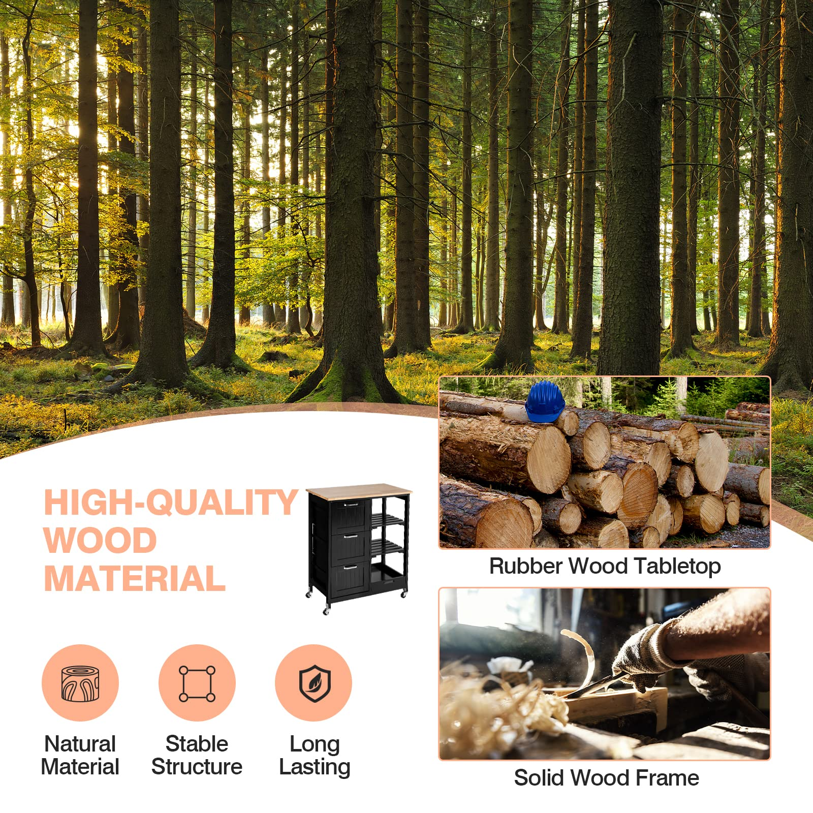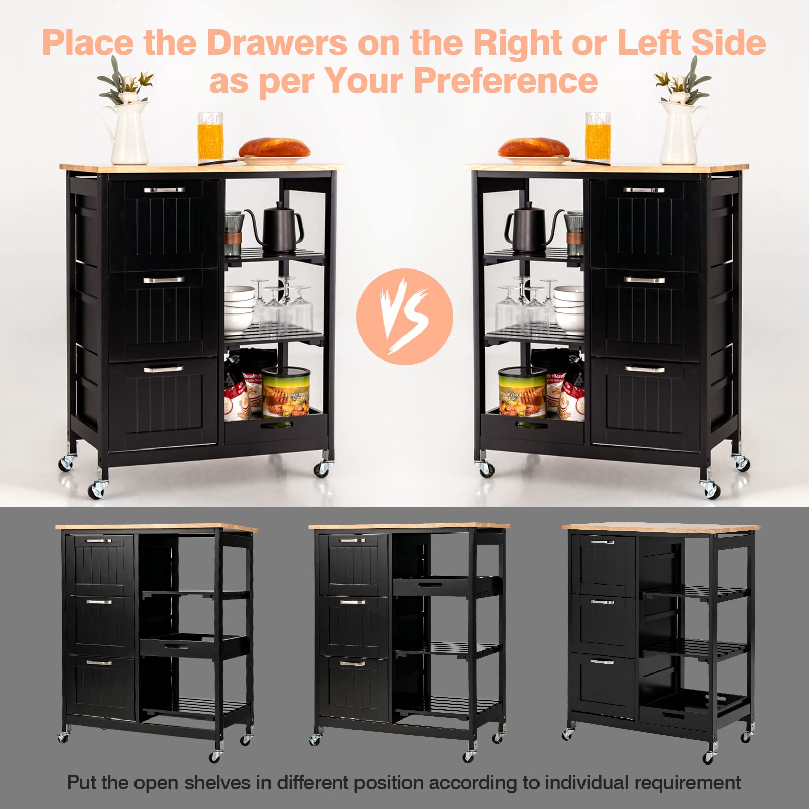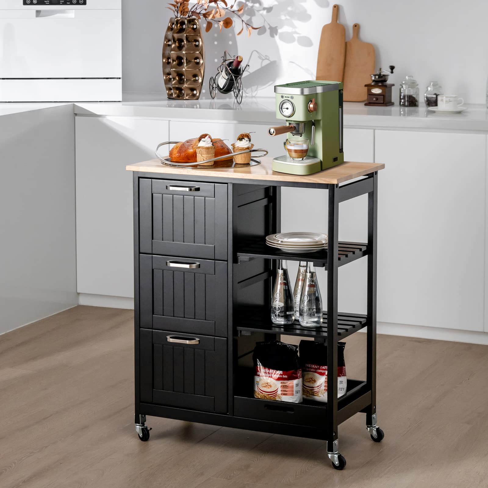 This kitchen cart is a furniture combining practicability and beauty, which is suitable for various occasions. The wide countertop supports foods, the 3 deep drawers contain small daily items, and the 3 open shelves store seasoning, wines, glass or towels. If you need to move it to other places, the universal wheels will help, which are superior than the previous plastic design either in sturdiness or durability. Moreover, 2 lockable casters ensure stability when you stop the cart. After using it, you can easily wipe the stains away owing to the smooth surface. Furthermore, the natural material used makes this cart have a strong weight capacity and serve for a long time.