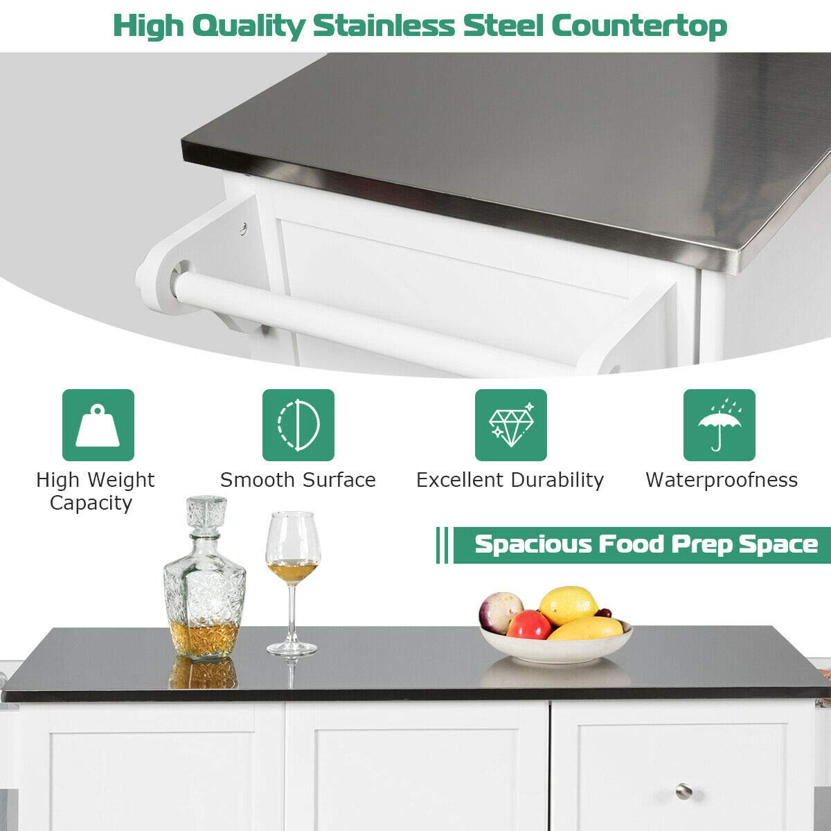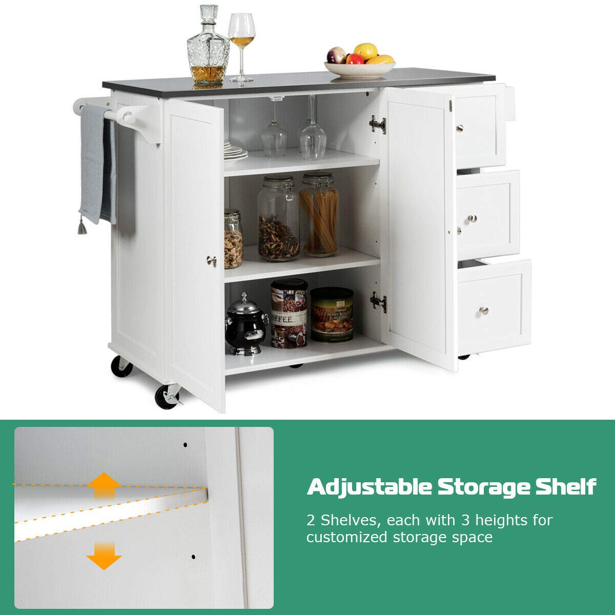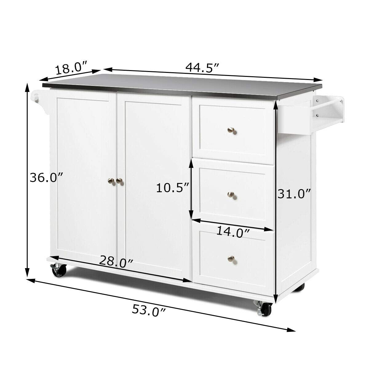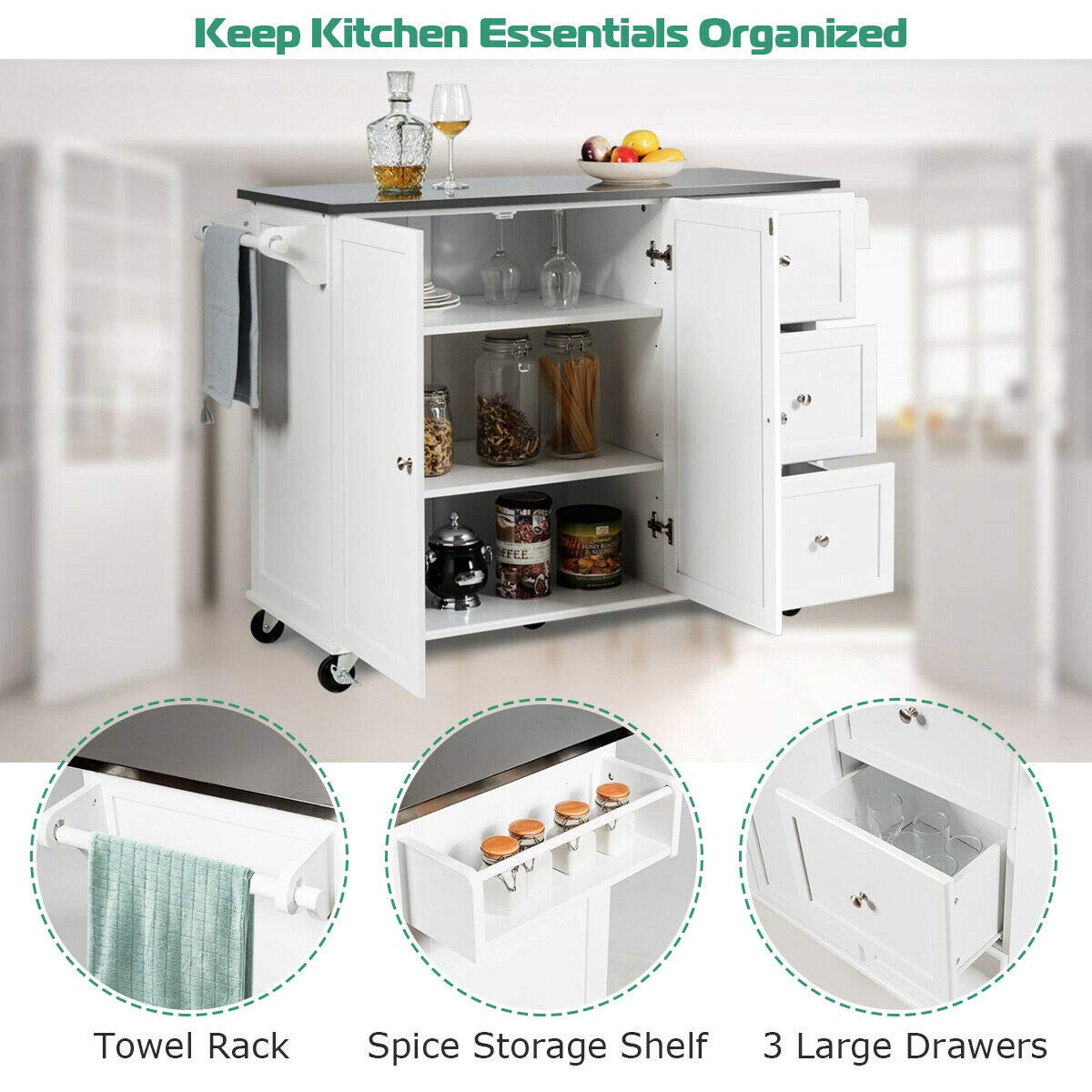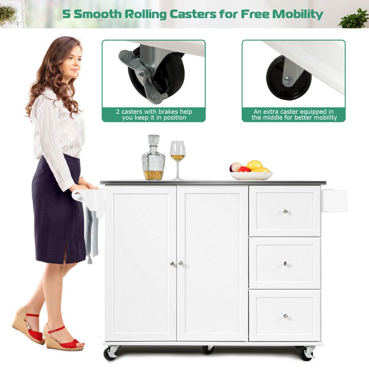 The key to keep a neat kitchen or create a convenient dining environment is bringing the kitchen cart home. It features a stainless steel countertop which is characterized by higher sturdiness and easier cleaning. And it rolls to anywhere you want thanks to smooth Crolling wheels. Instead of ordinary 4-wheel design, this unique kitchen cart is equipped with 5 wheels, ensuring higher stability and larger weight capacity. Besides, a spice storage shelf and towel rack allows quick access to the spice bottles and kitchen towel when you need them. The kitchen island will appeal to your guest and family because its elegant design. Other features include 2 adjustable shelves inside the bottom cabinet and 3 drawers.