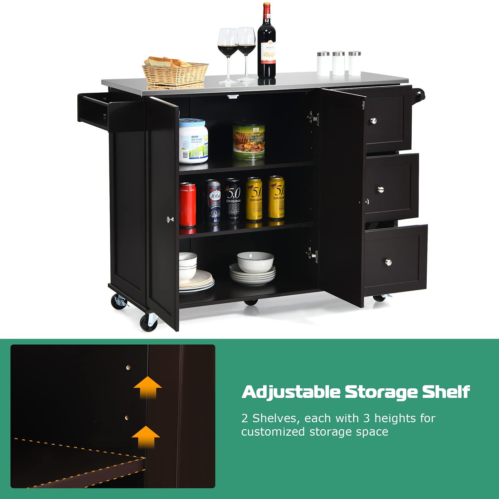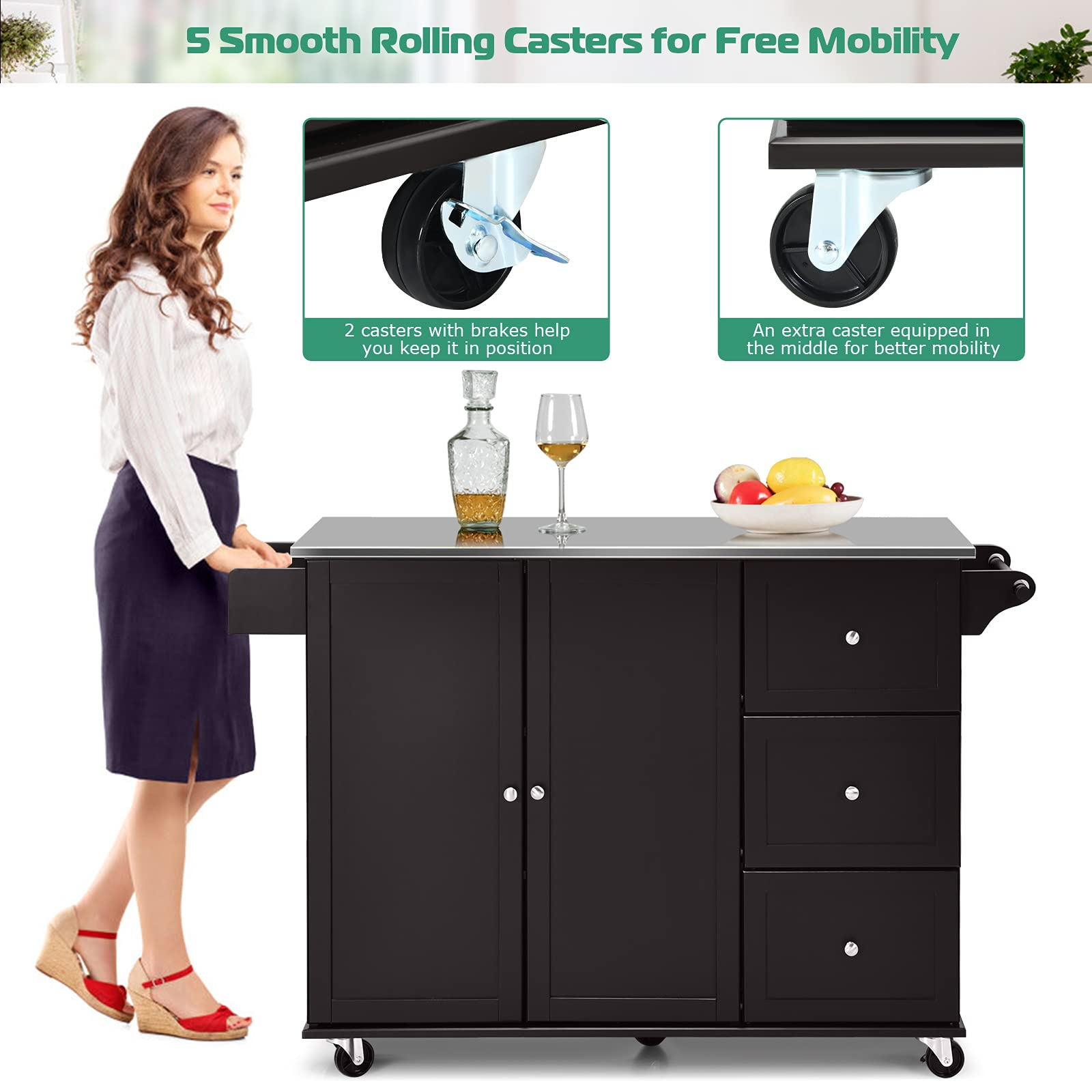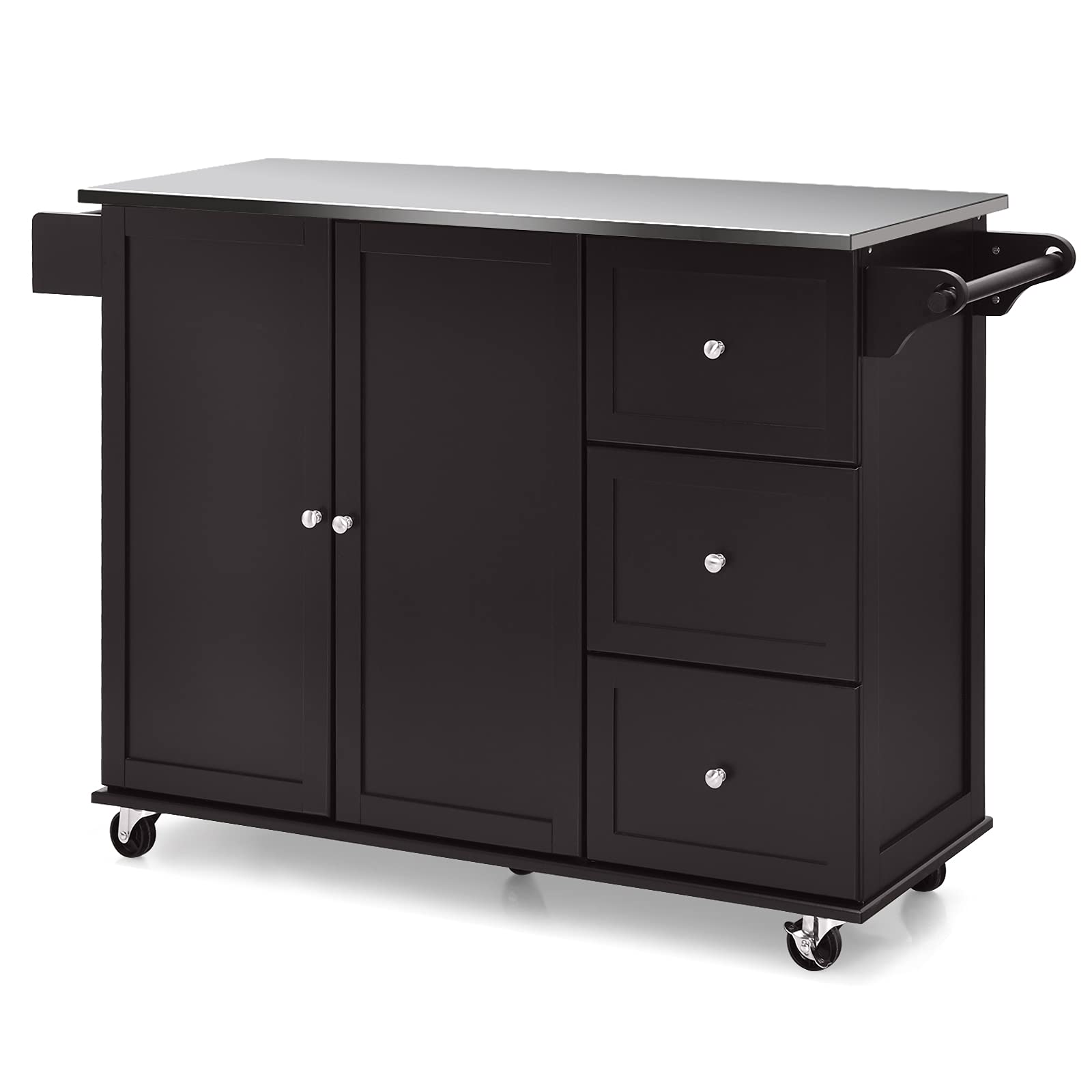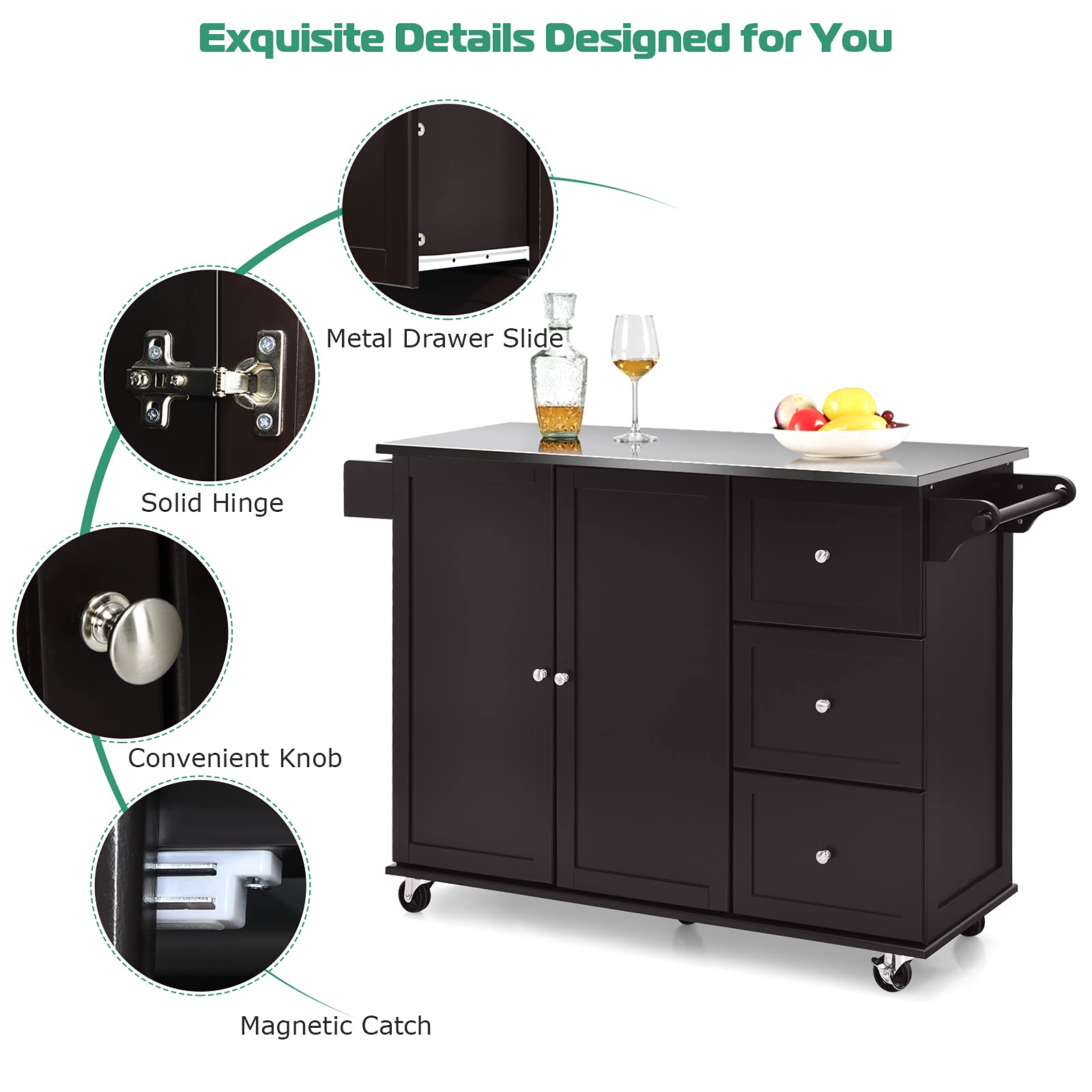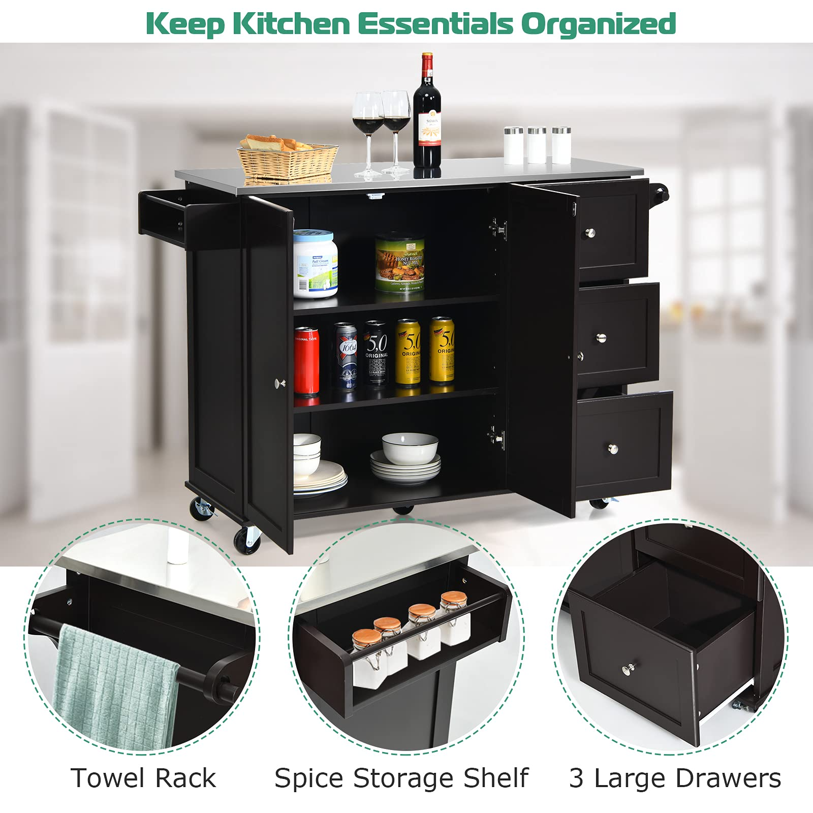 The key to keep a neat kitchen or create a convenient dining environment is bringing the kitchen cart home. It features a stainless steel countertop which is characterized by higher sturdiness and easier cleaning. And it rolls to anywhere you want thanks to smooth Crolling wheels. Instead of ordinary 4-wheel design, this unique kitchen cart is equipped with 5 wheels, ensuring higher stability and larger weight capacity. Besides, a spice storage shelf and towel rack allows quick access to the spice bottles and kitchen towel when you need them. The kitchen island will appeal to your guest and family because its elegant design. Other features include 2 adjustable shelves inside the bottom cabinet and 3 drawers.